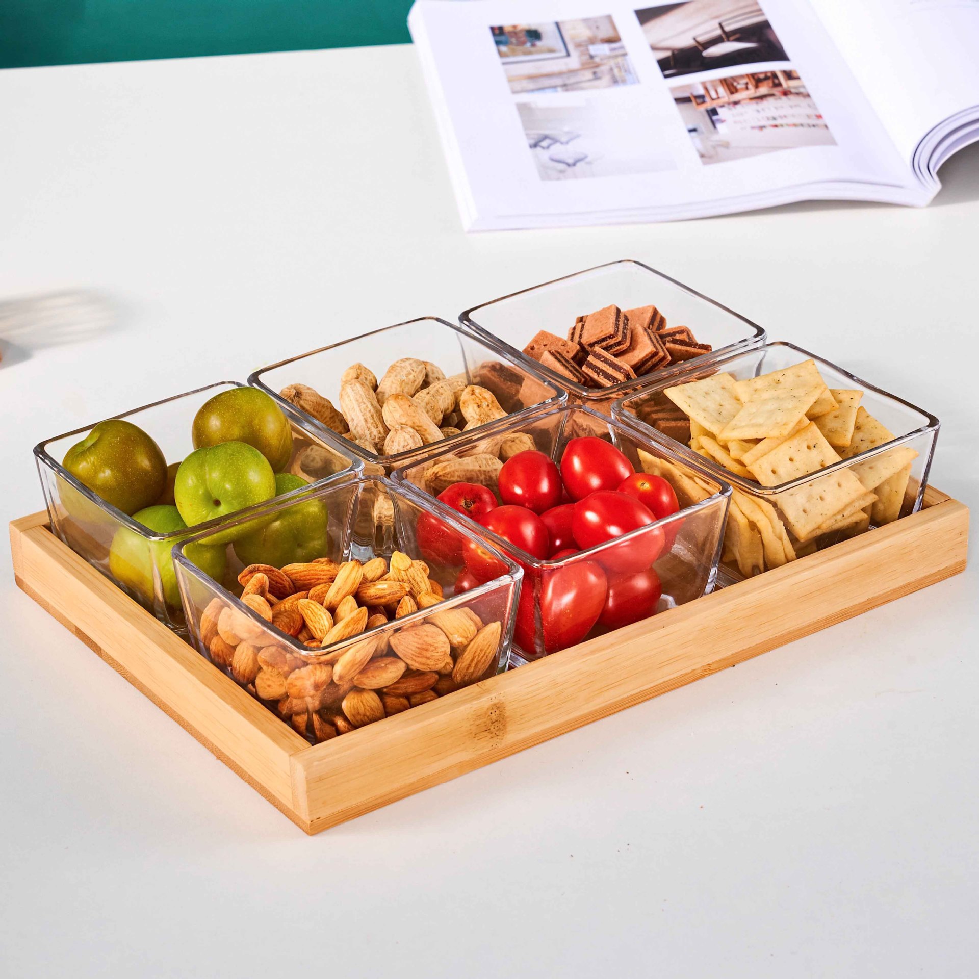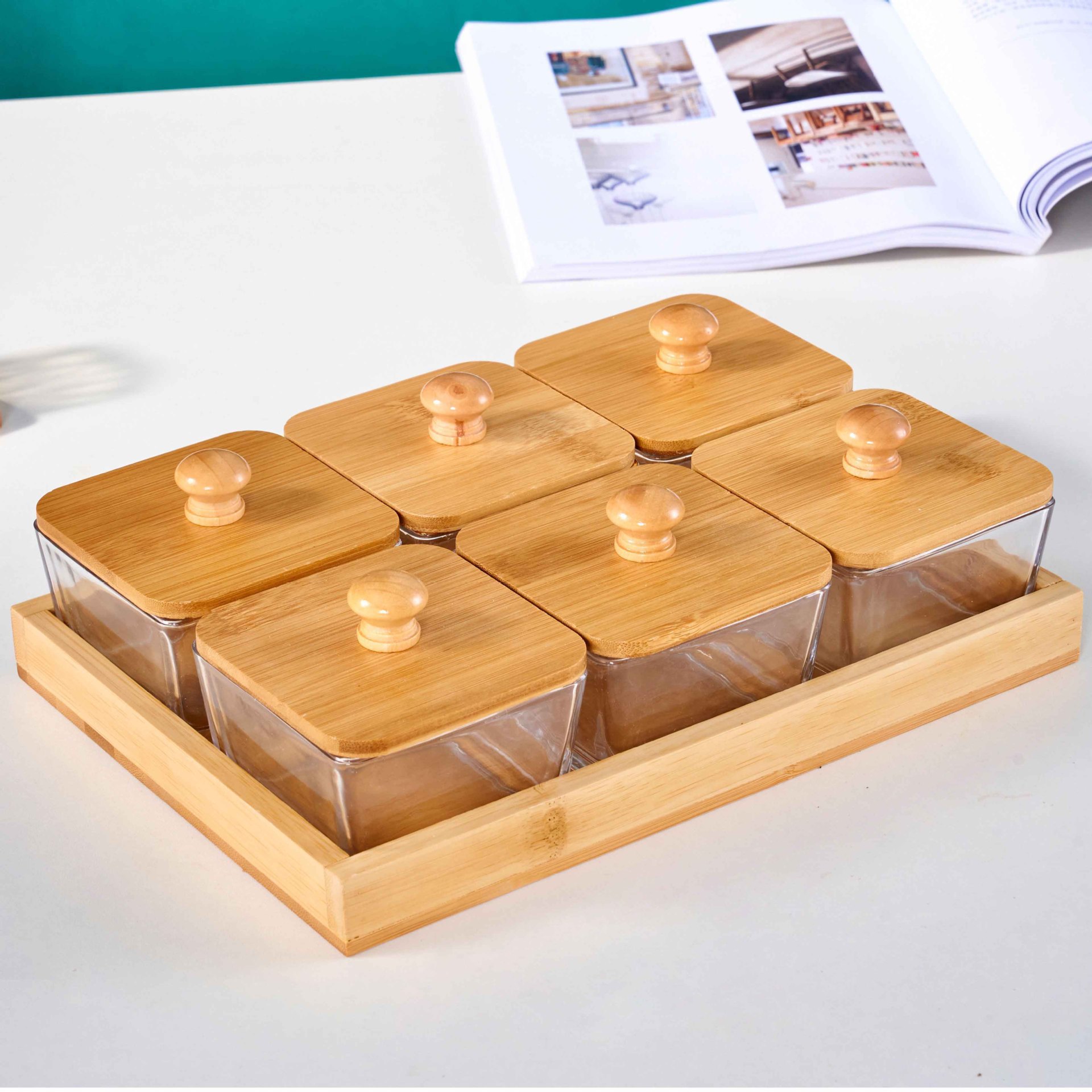 • 6칸 대나무 트레이 + 유리 그릇 + 나무 뚜껑 [박스형]