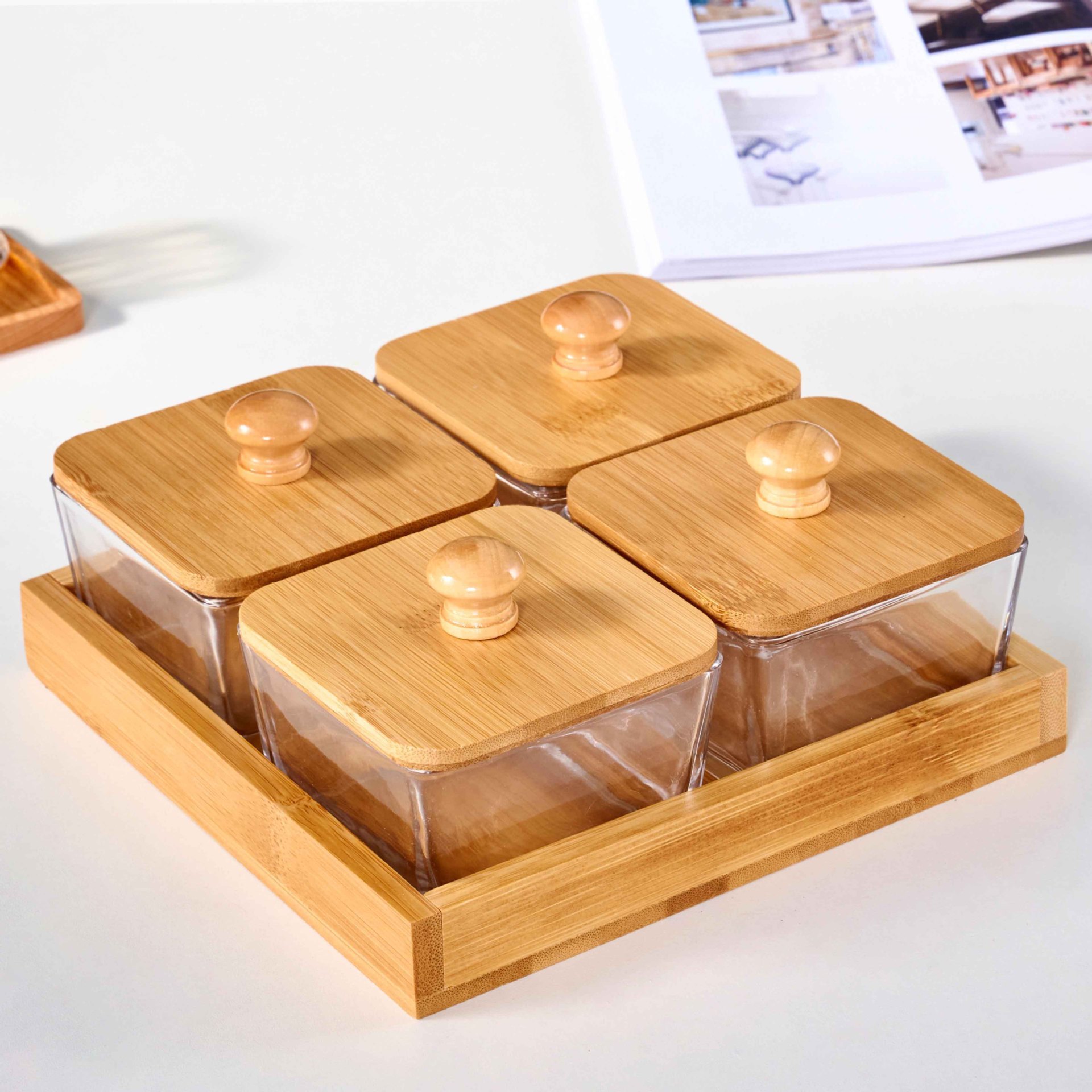 • 4칸 대나무 트레이 + 유리 그릇 + 나무 뚜껑 [박스형]