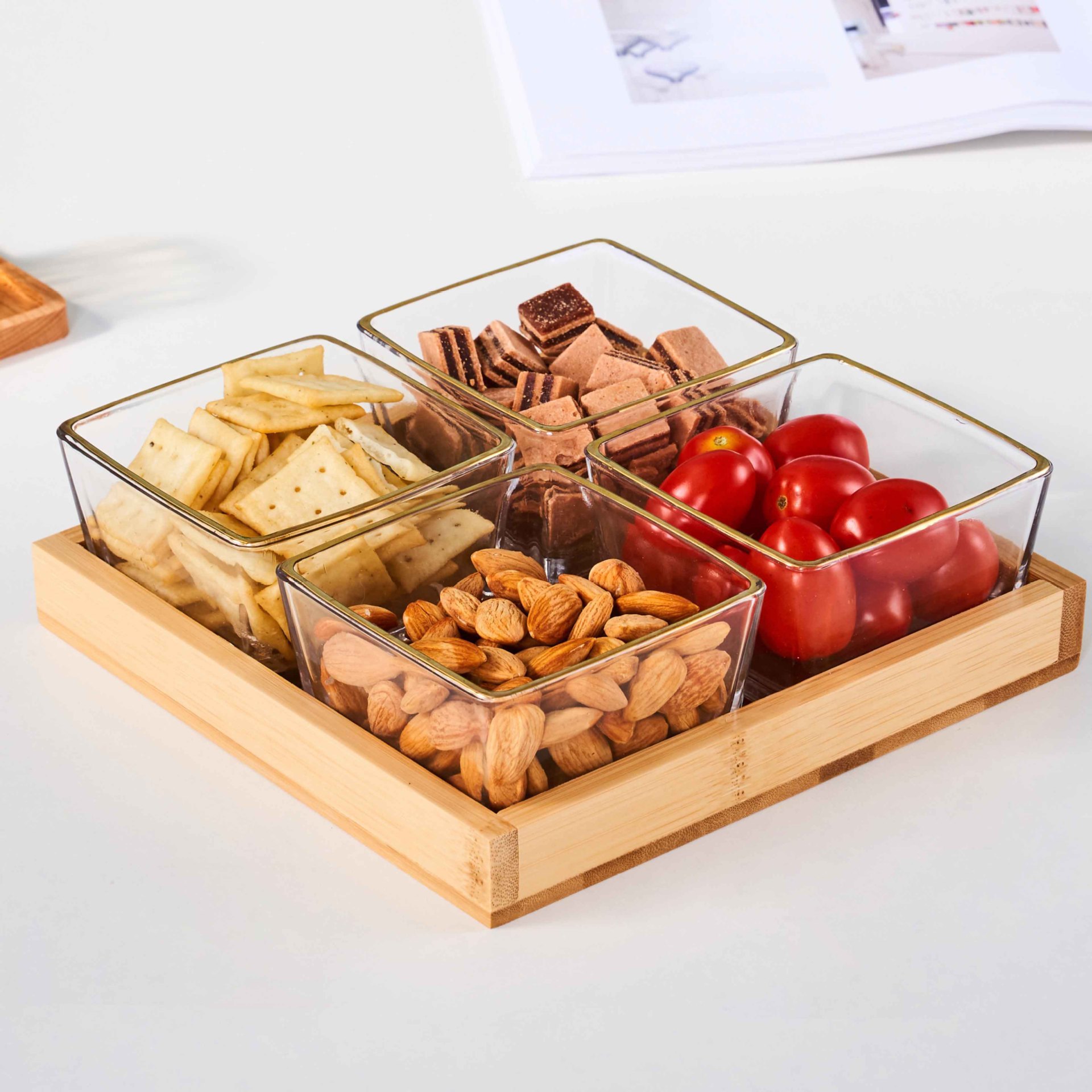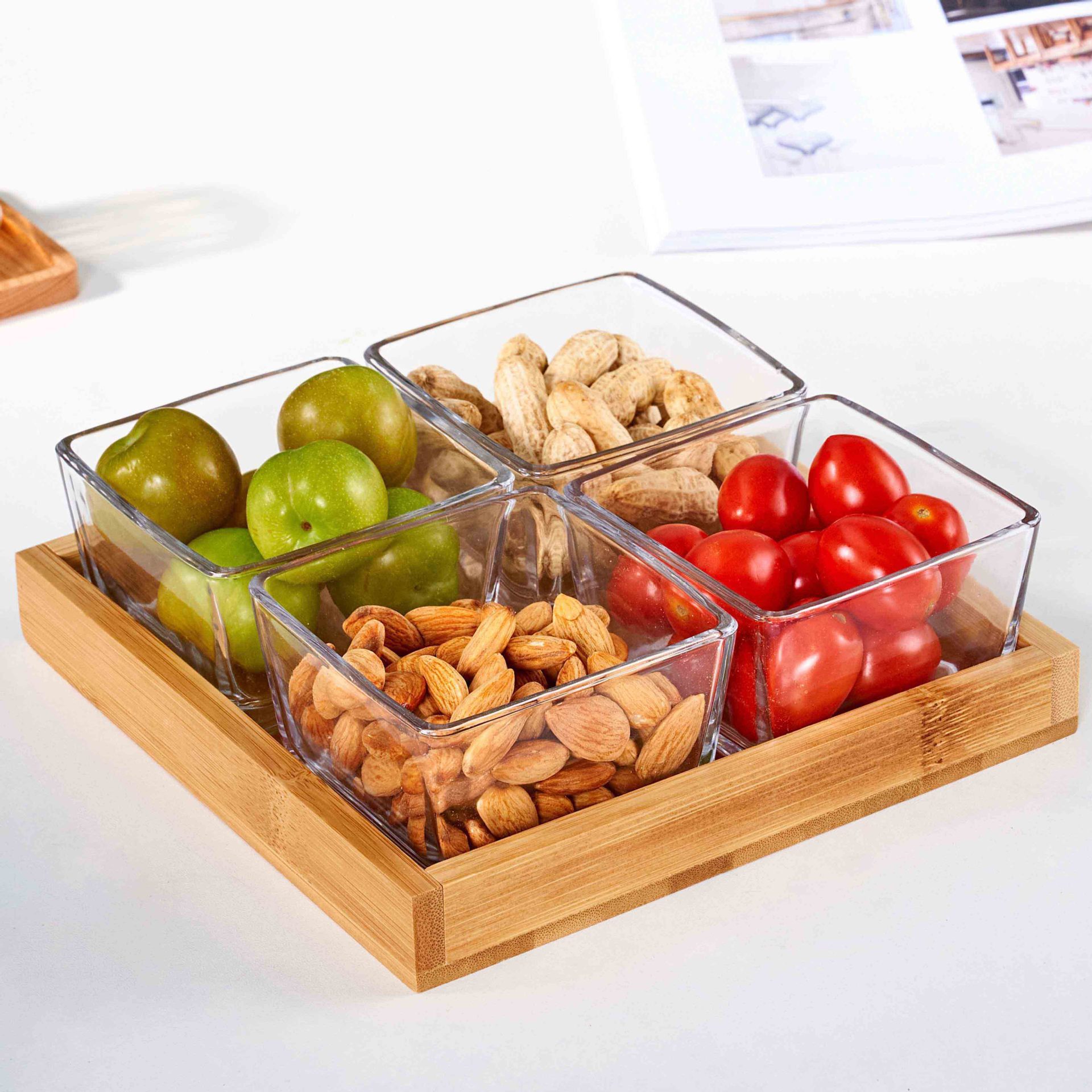 • 4칸 대나무 트레이 + 유리그릇 [박스형]