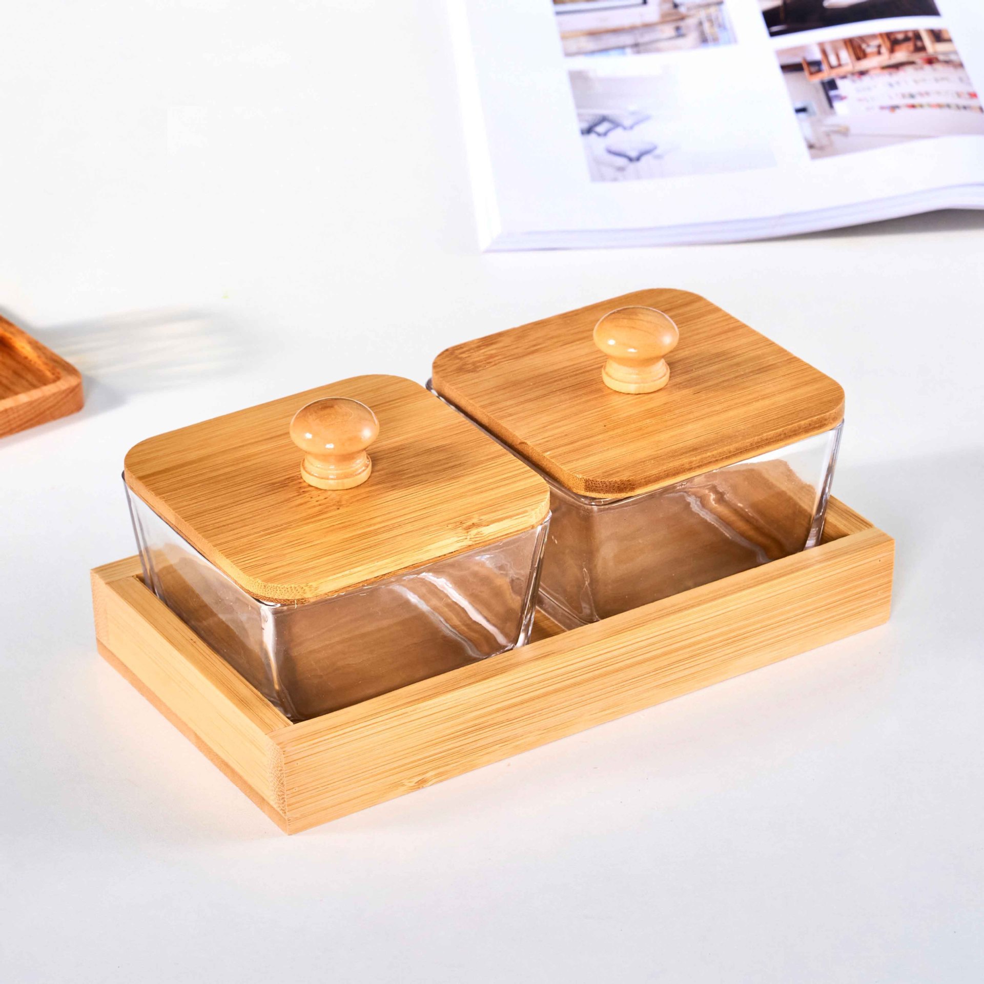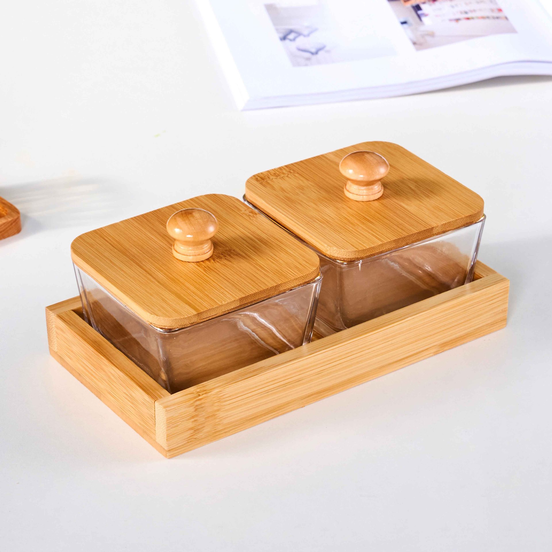 • 2칸 대나무 트레이 + 유리 그릇 + 나무 뚜껑 [박스형]