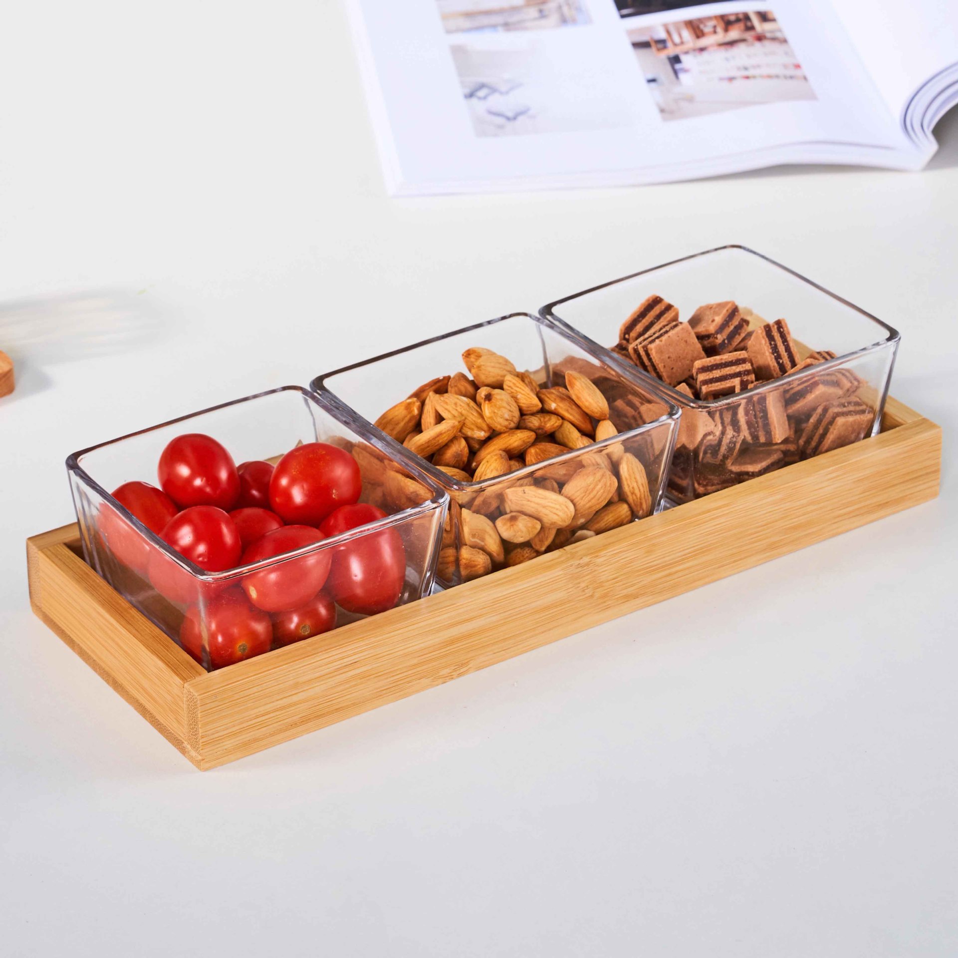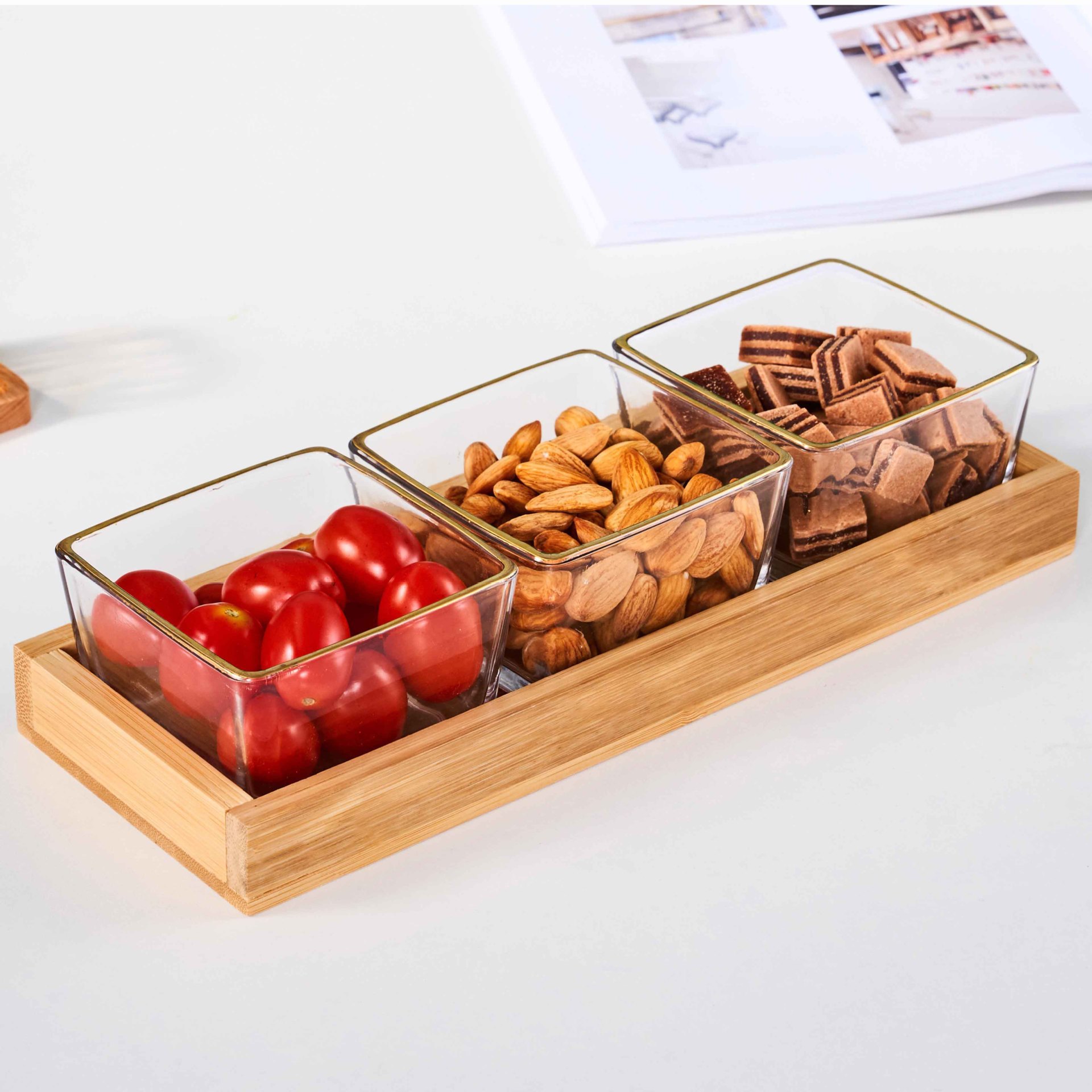 • 3칸 대나무 트레이 + 유리그릇 [박스형]