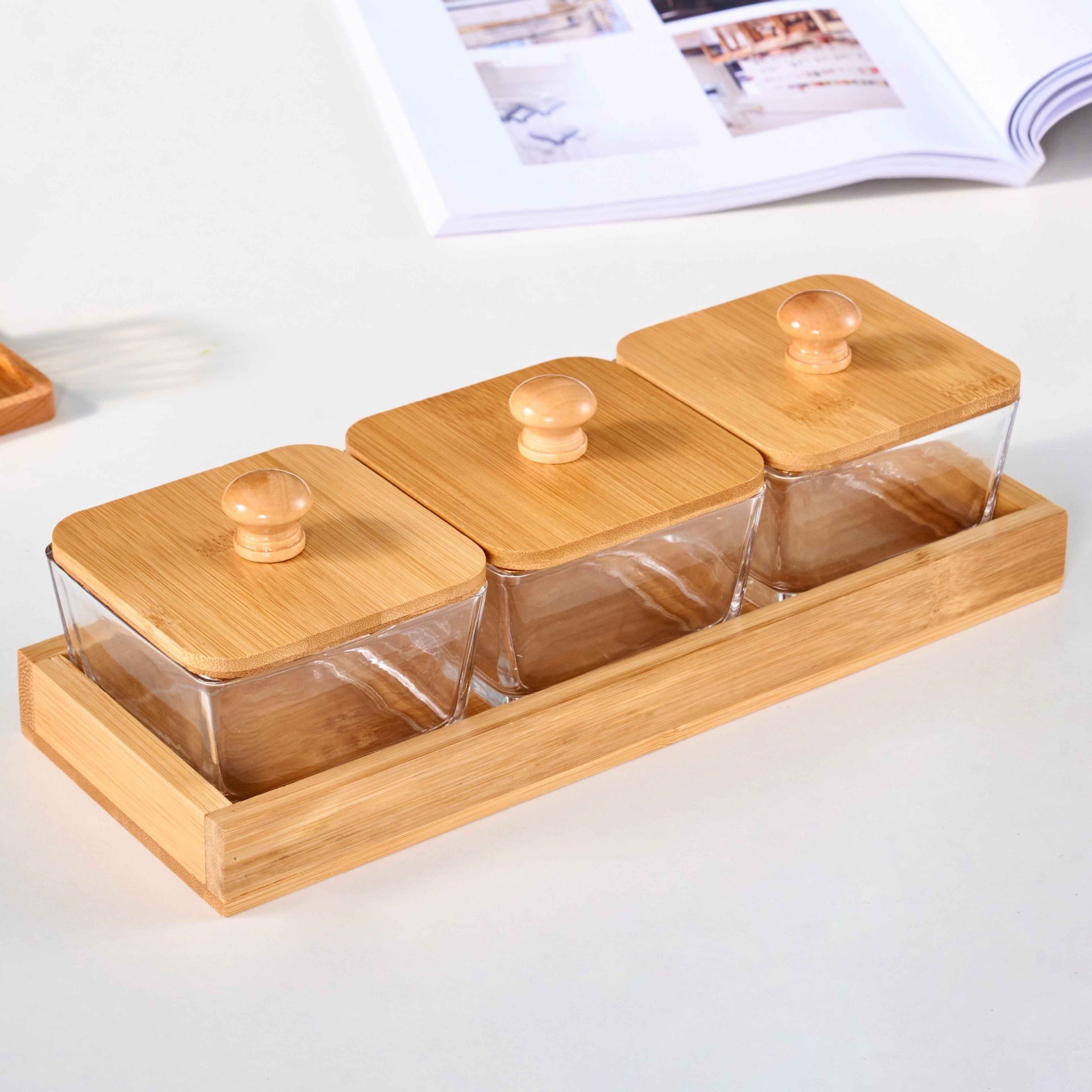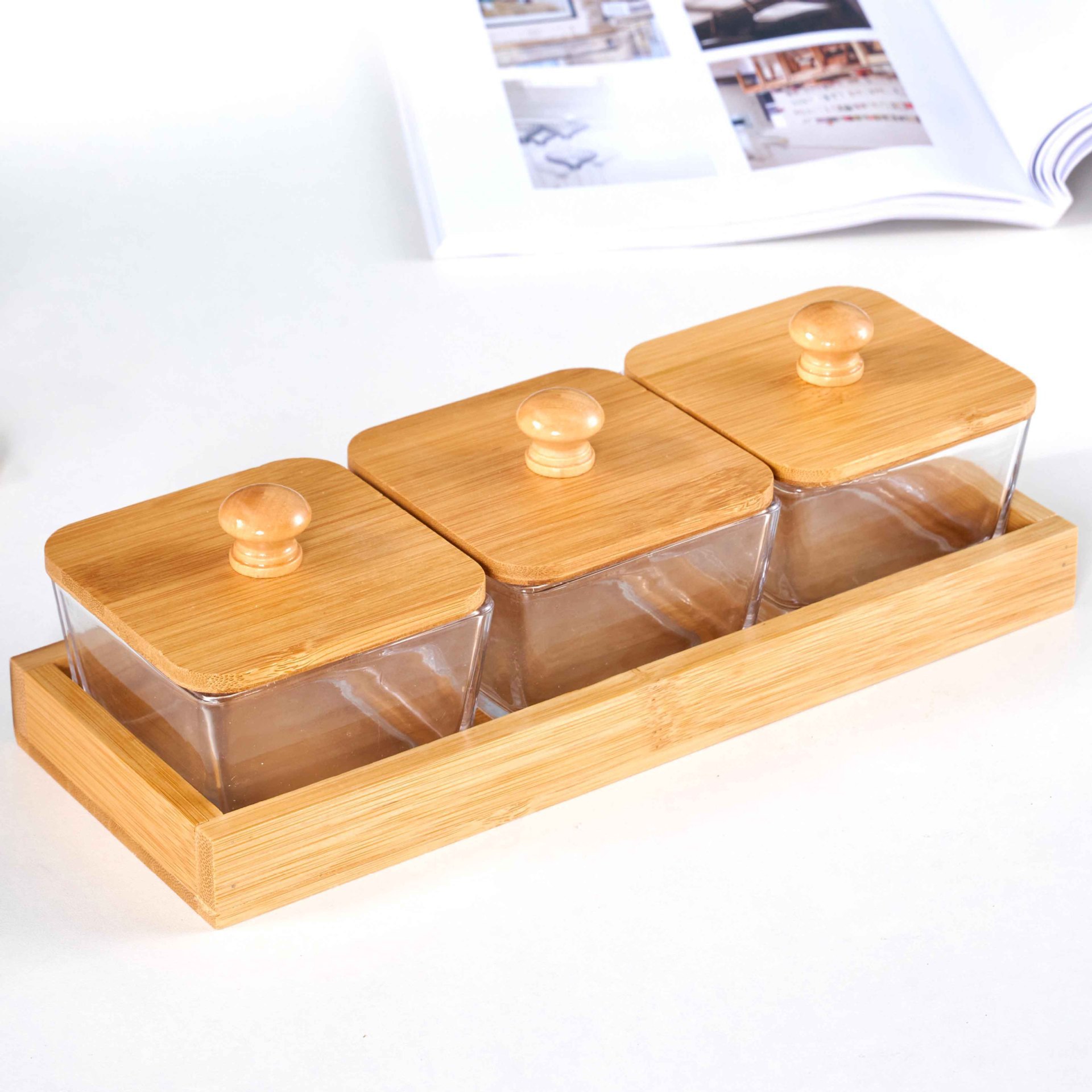 • 3칸 대나무 트레이 + 유리 그릇 + 나무 뚜껑 [박스형]