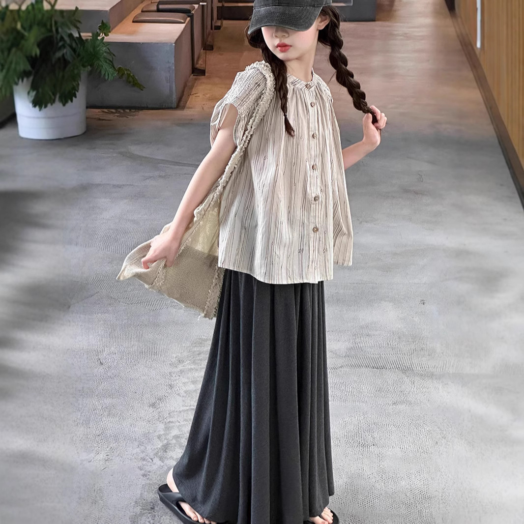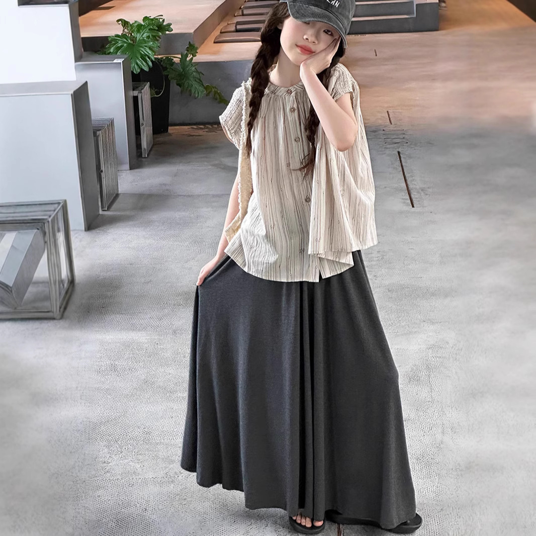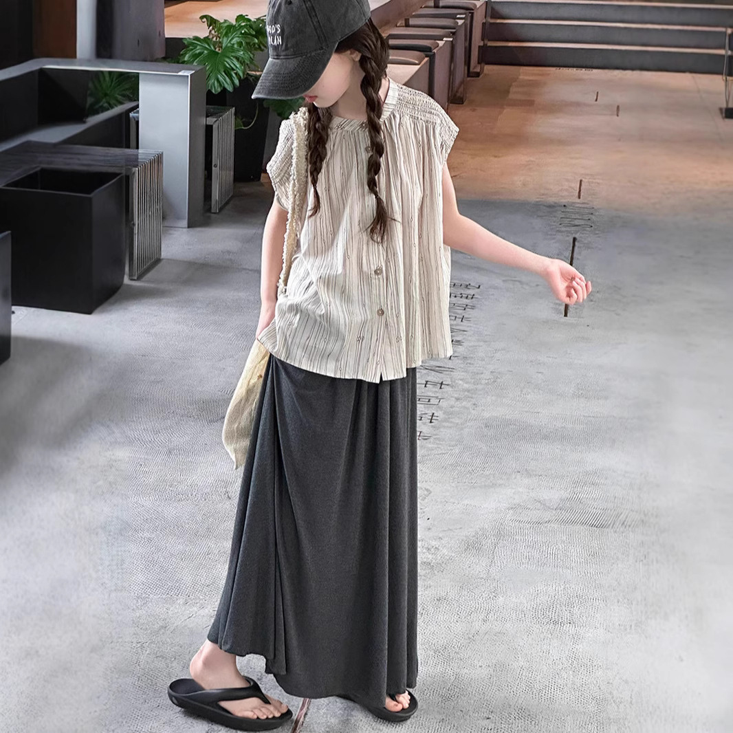소녀의 여름 치마 세트 2025 새로운 스타일 큰 어린이 줄무늬 반팔 셔츠 긴 치마 투피스 세트