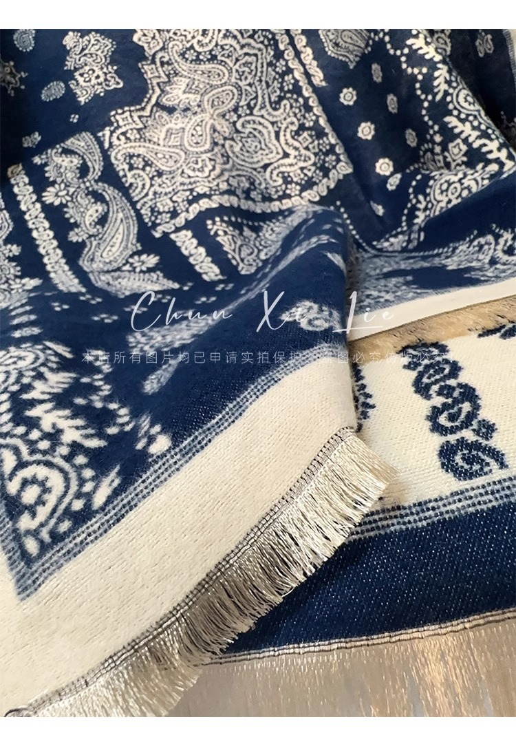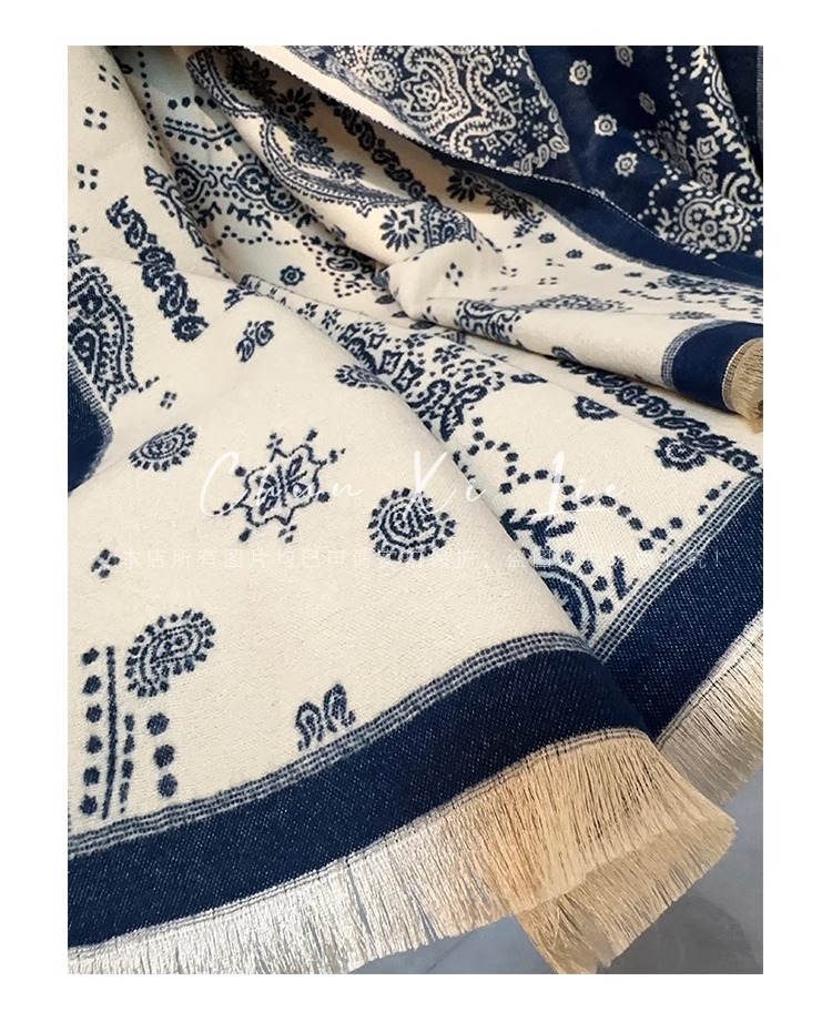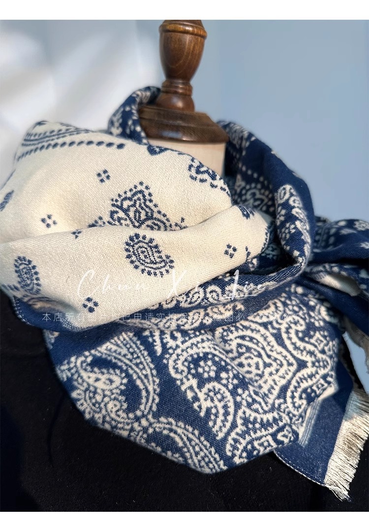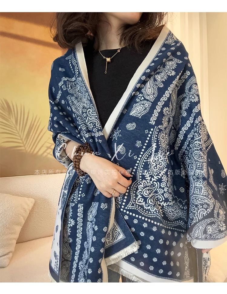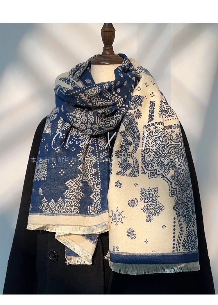 새로운 중국 스타일 파란색과 흰색 도자기 모방 캐시미어 스카프 겨울 여성의 우아한 네이비 두꺼운 다기능 따뜻한 목 목도리