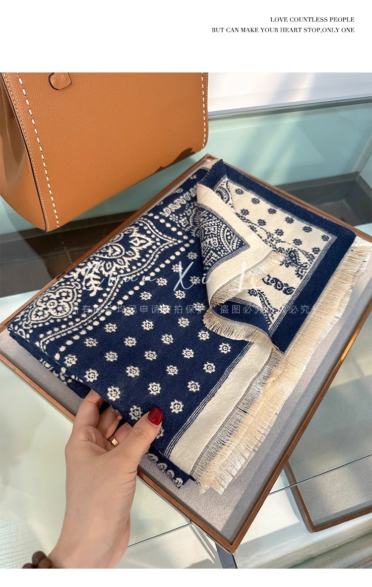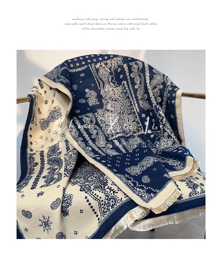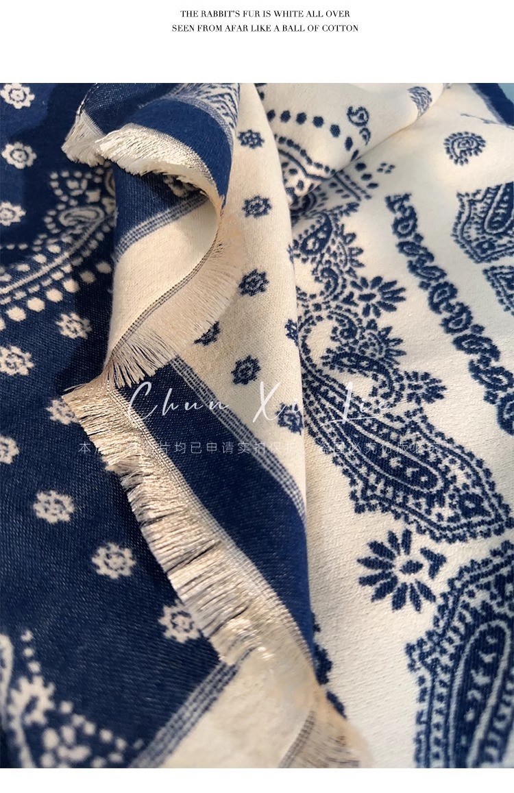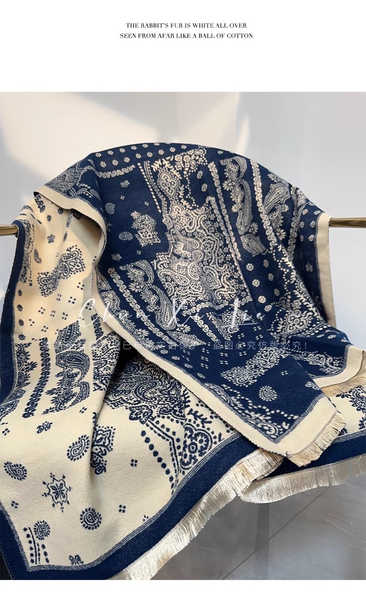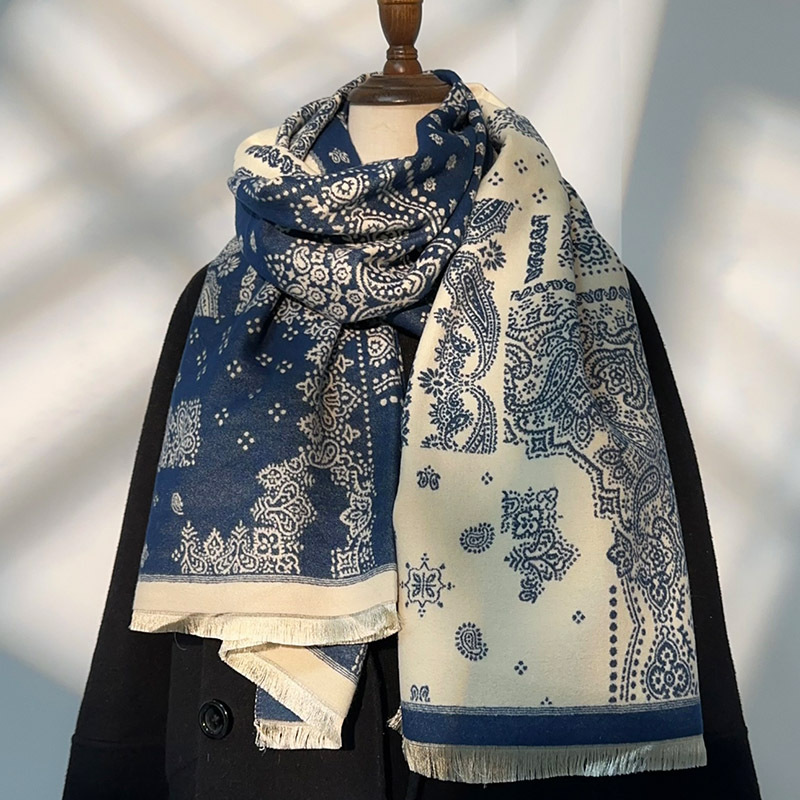 새로운 중국 스타일 파란색과 흰색 도자기 모방 캐시미어 스카프 겨울 여성의 우아한 네이비 두꺼운 다기능 따뜻한 목 목도리
