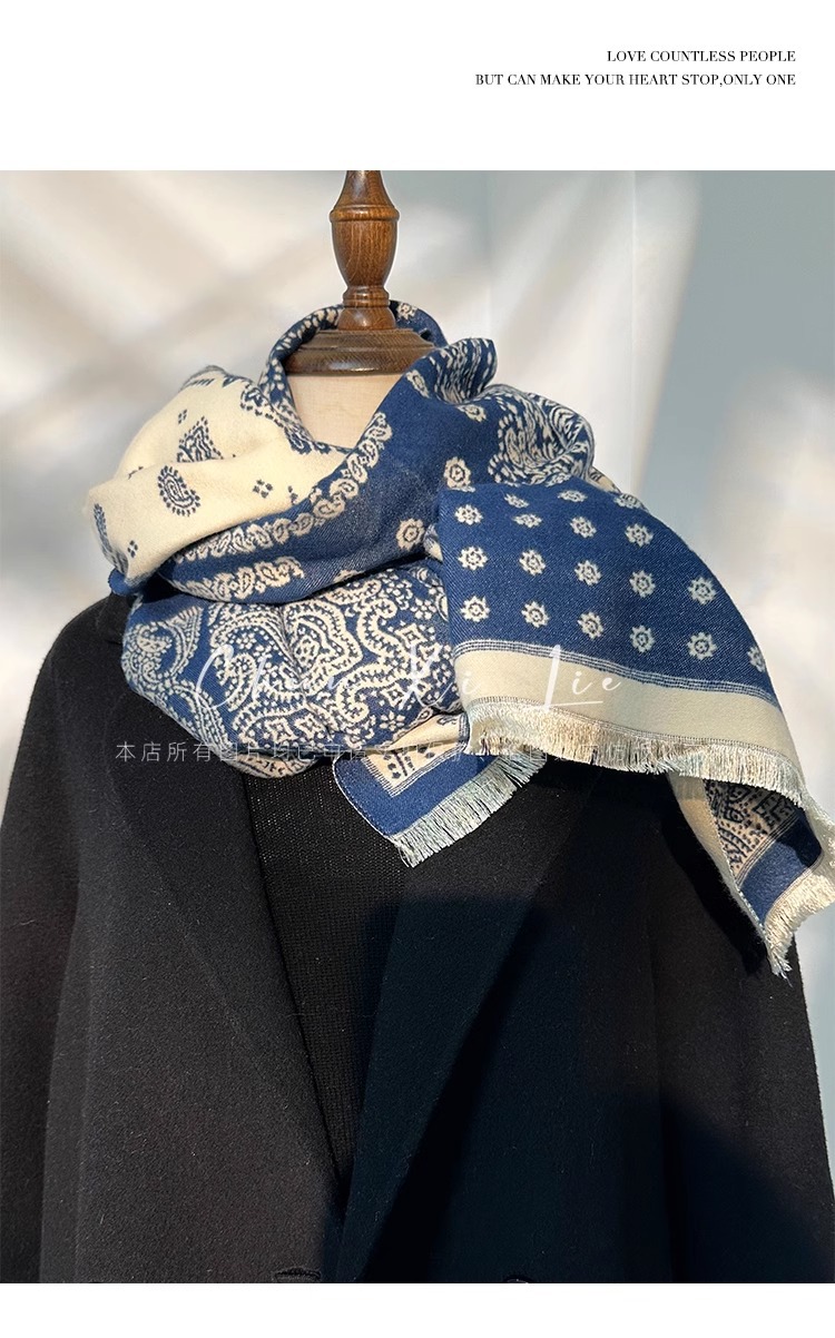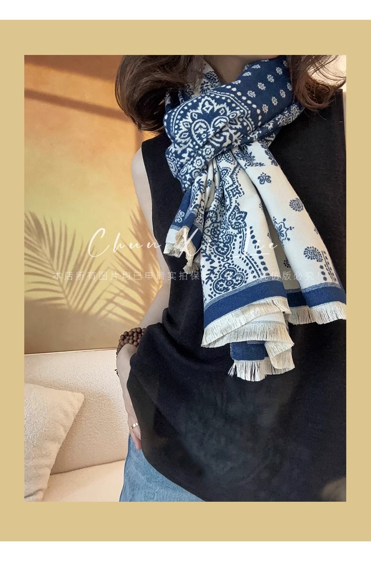 새로운 중국 스타일 파란색과 흰색 도자기 모방 캐시미어 스카프 겨울 여성의 우아한 네이비 두꺼운 다기능 따뜻한 목 목도리스토어 가기