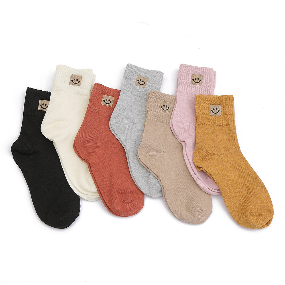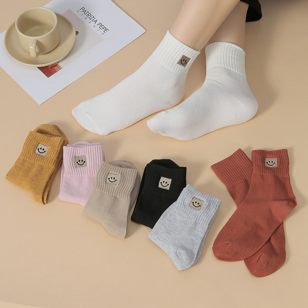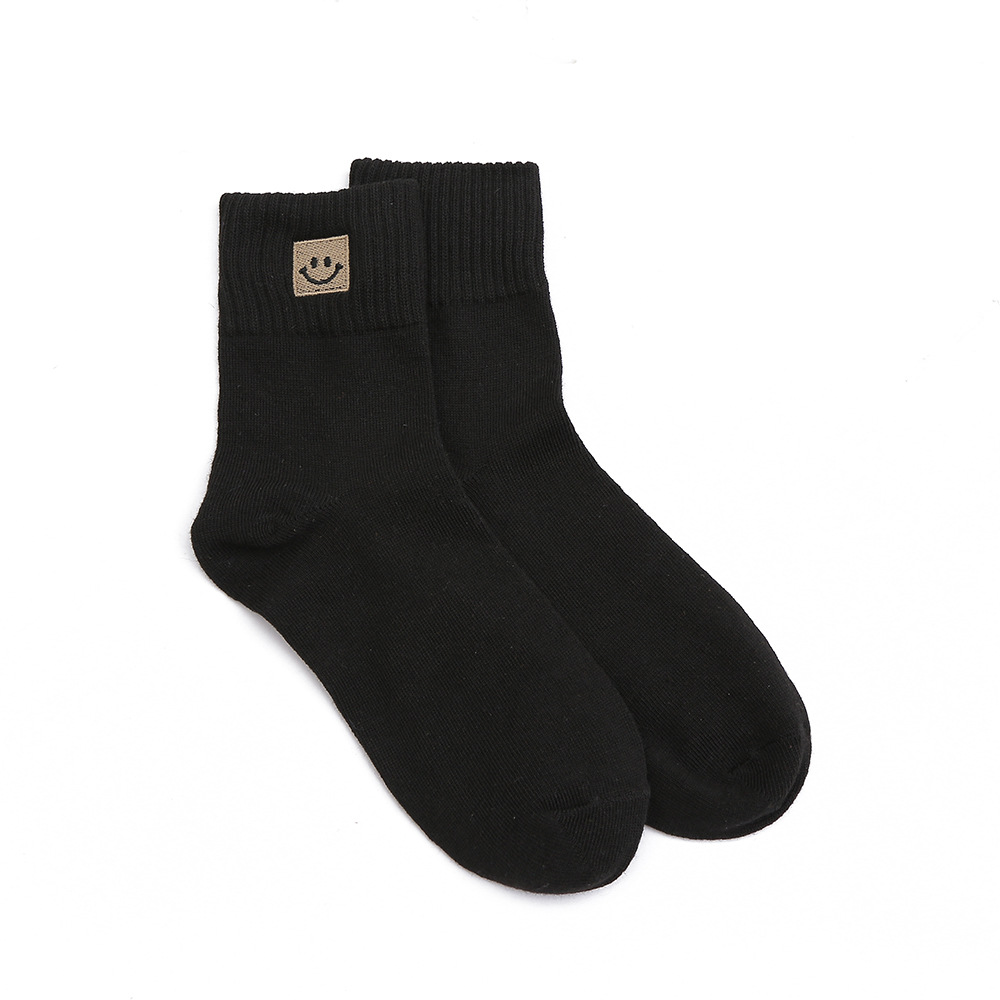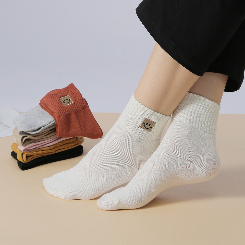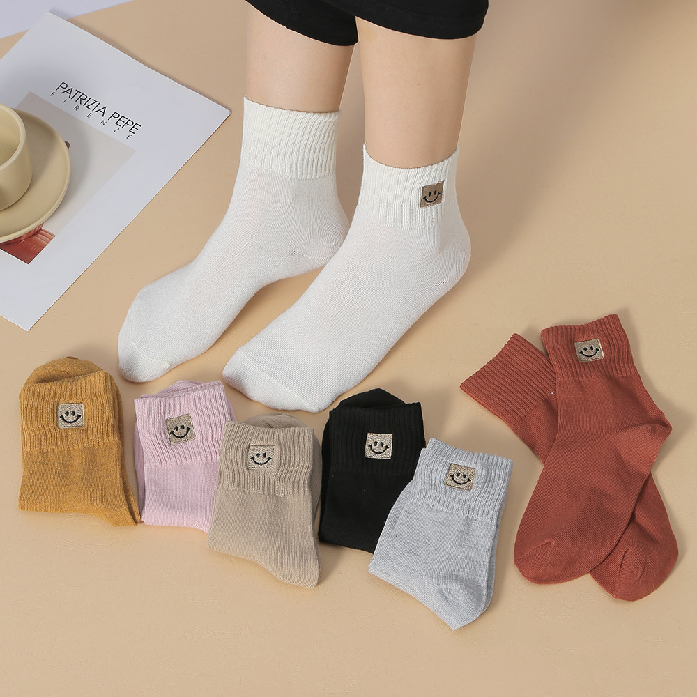 봄과 가을 여성 미드 튜브 양말 일본 트렌디 땀 흡수 솔리드 컬러 캐주얼 만화 자수 면 양말 스마일리 자수 여성용 양말