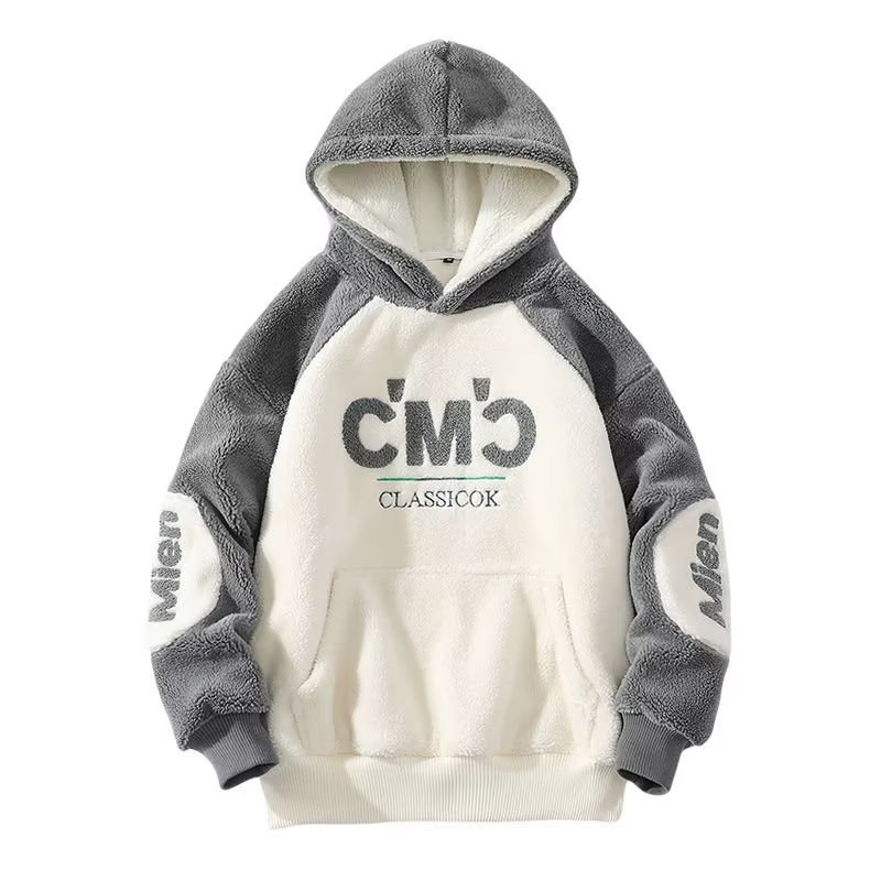 소년 두꺼운 후드 스웨터 가을과 겨울 새로운 양고기 양털 코트 스티칭 대조 컬러 트렌디 브랜드 탑 겨울 의류 트렌디스토어 가기