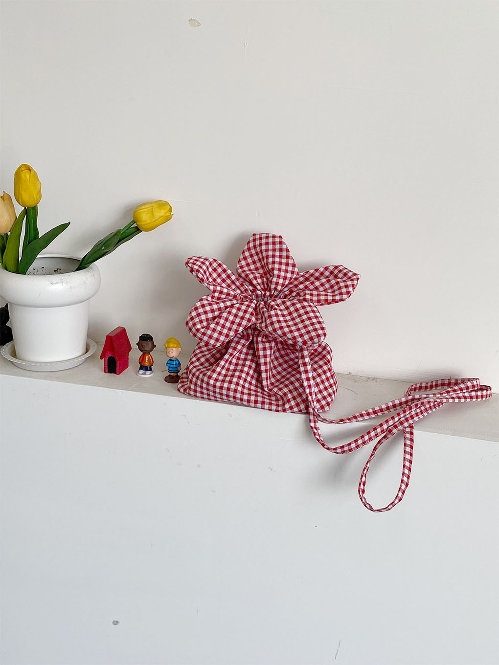 • 크로스바디 드로스트링 플라워 백 - 레드 체크 무늬
