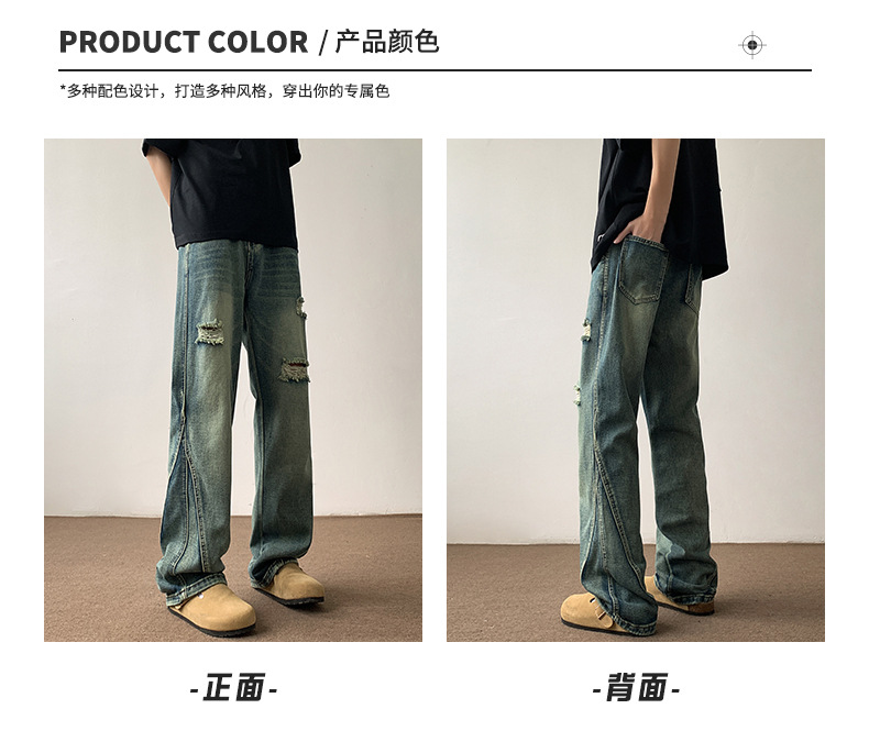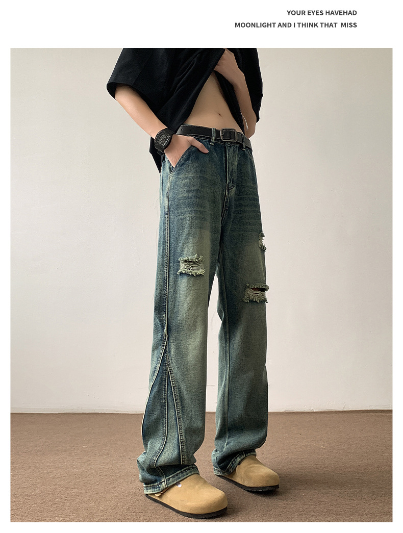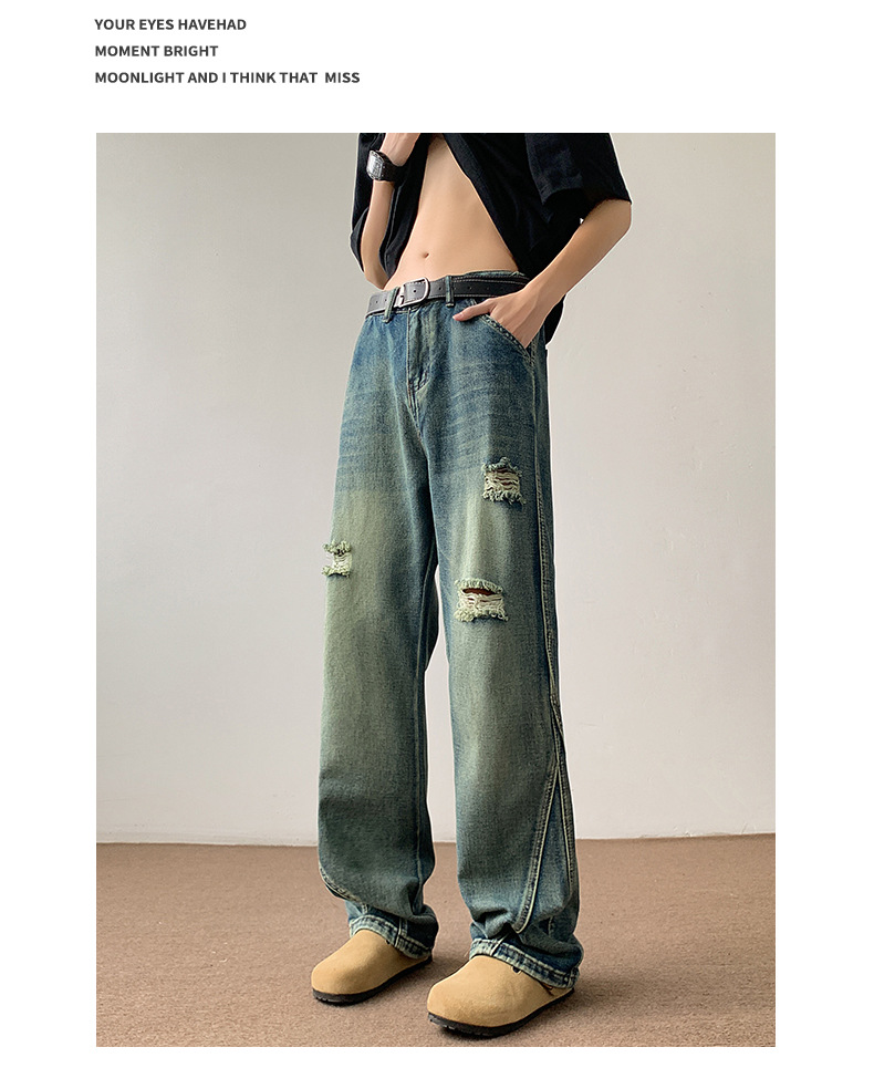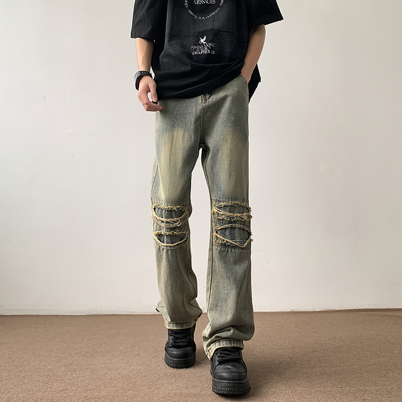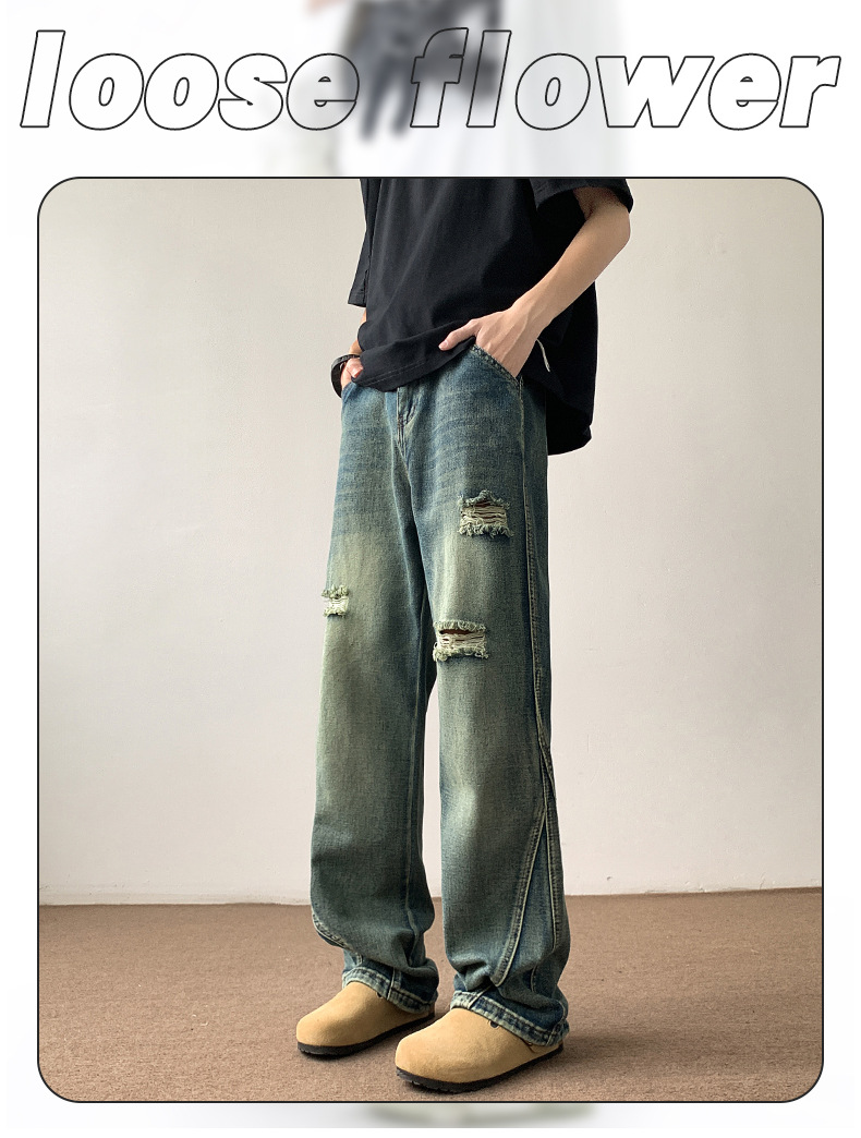 찢어진 청바지 남성 봄과 여름 트렌디 브랜드 남성 홍콩 스타일 캐주얼 의류 세탁 느슨한 바지 남성용 바지스토어 가기