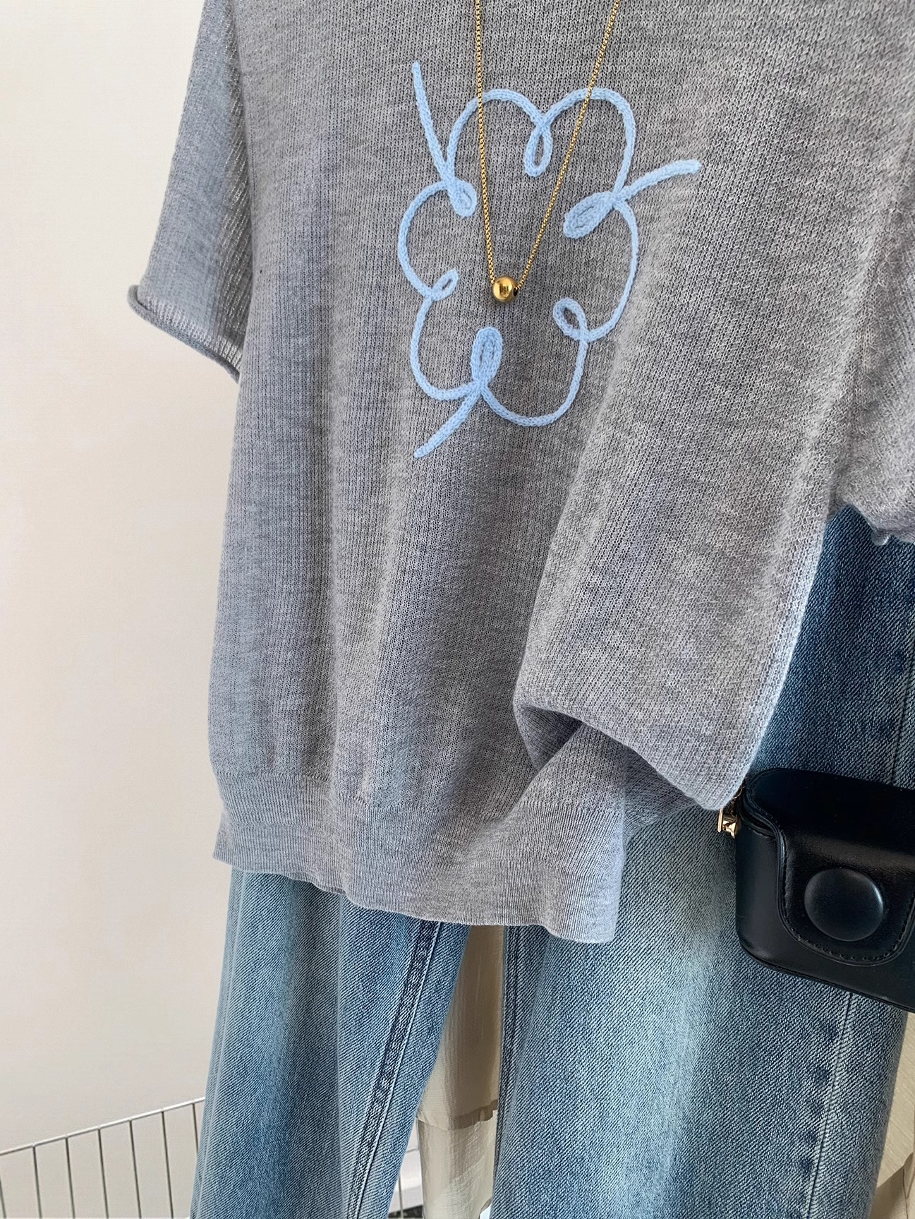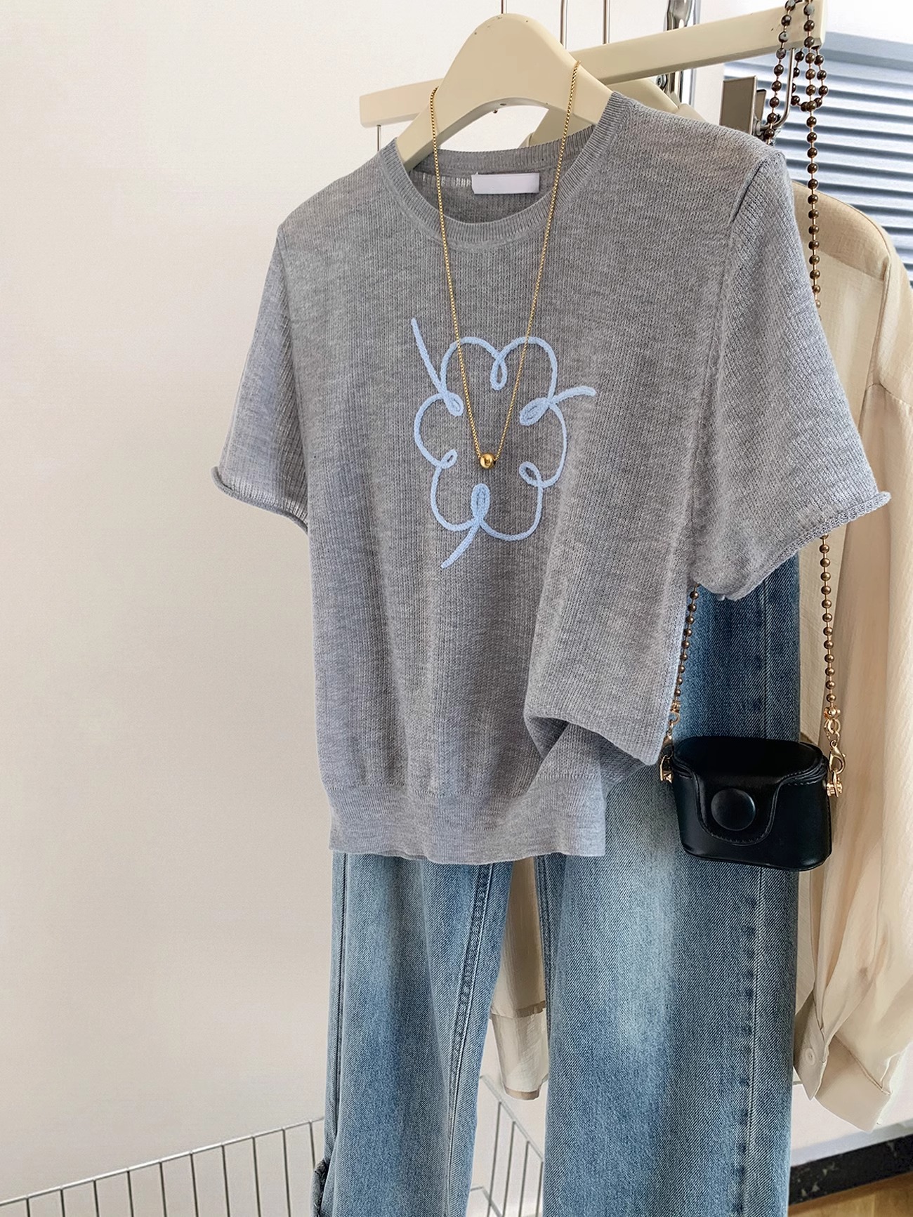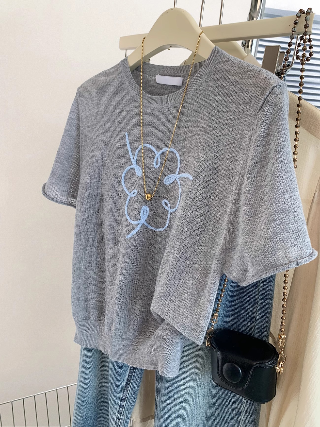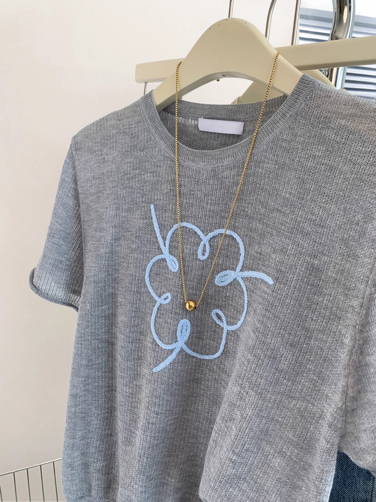 회색 얇은 아이스 실크 니트 반팔 티셔츠 여성 여름 2025 새로운 디자인 센스 반소매 어깨 탑스토어 가기