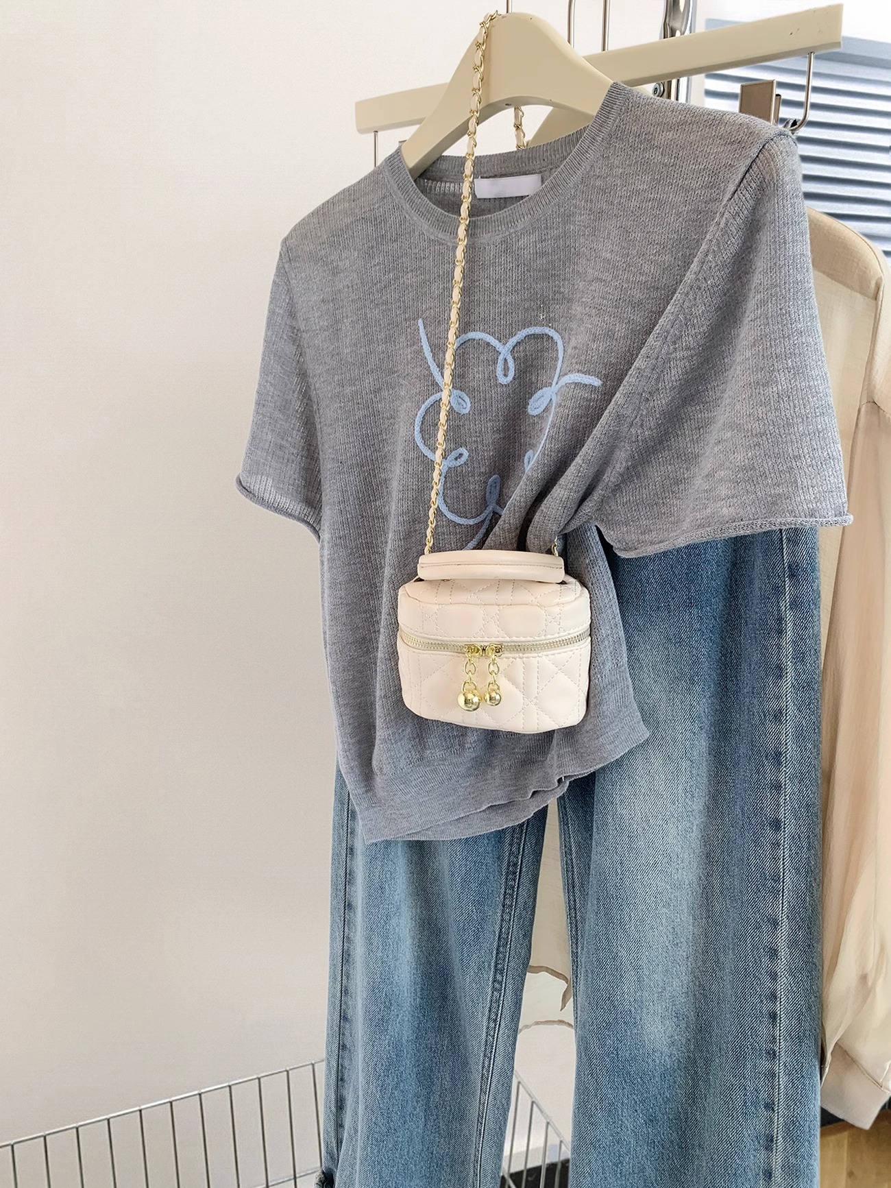 회색 얇은 아이스 실크 니트 반팔 티셔츠 여성 여름 2025 새로운 디자인 센스 반소매 어깨 탑