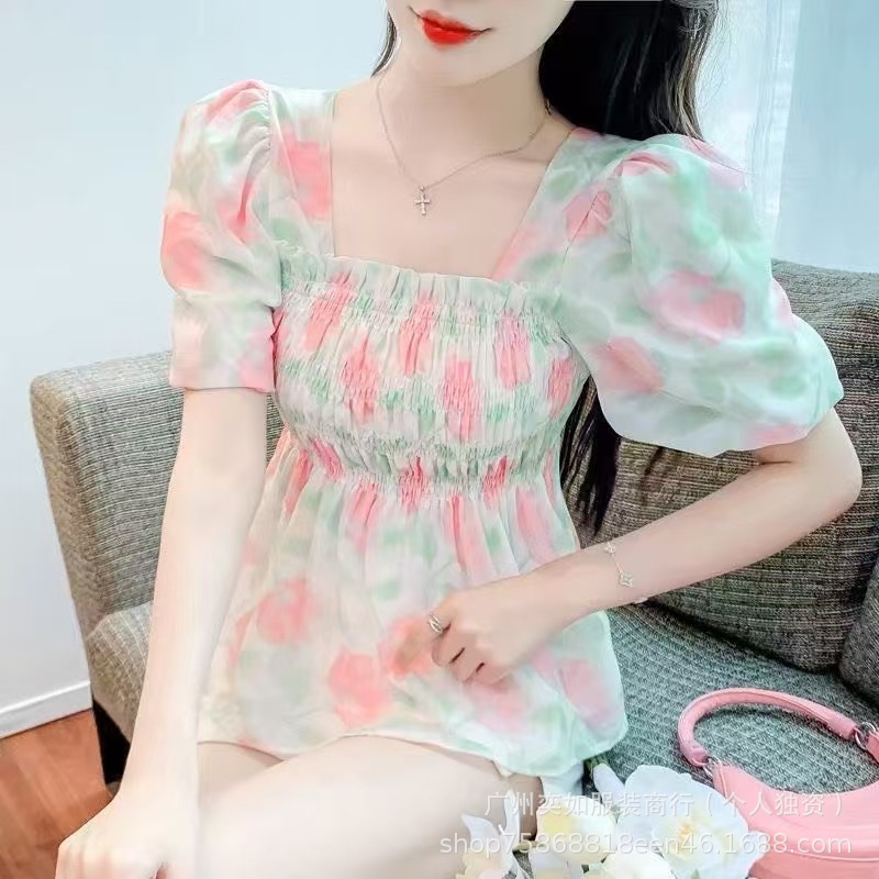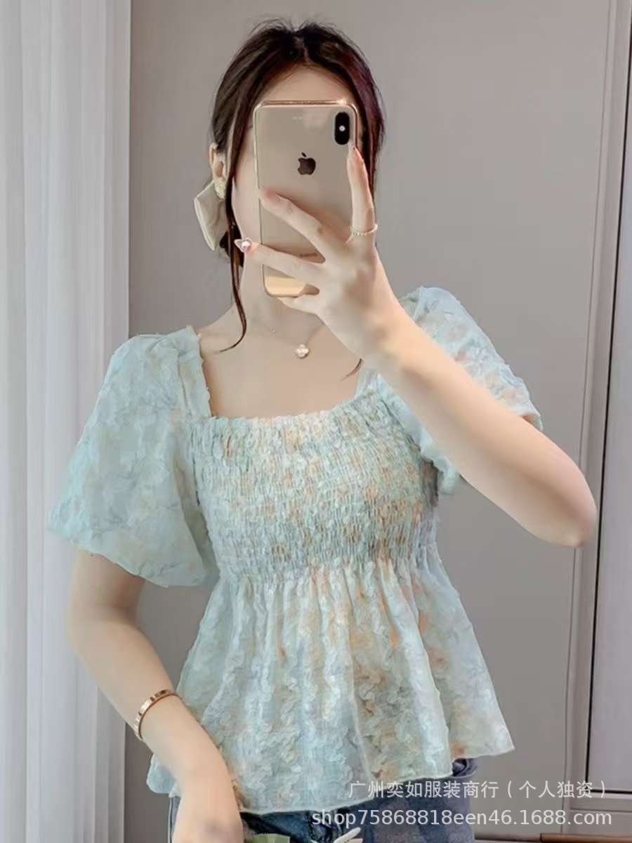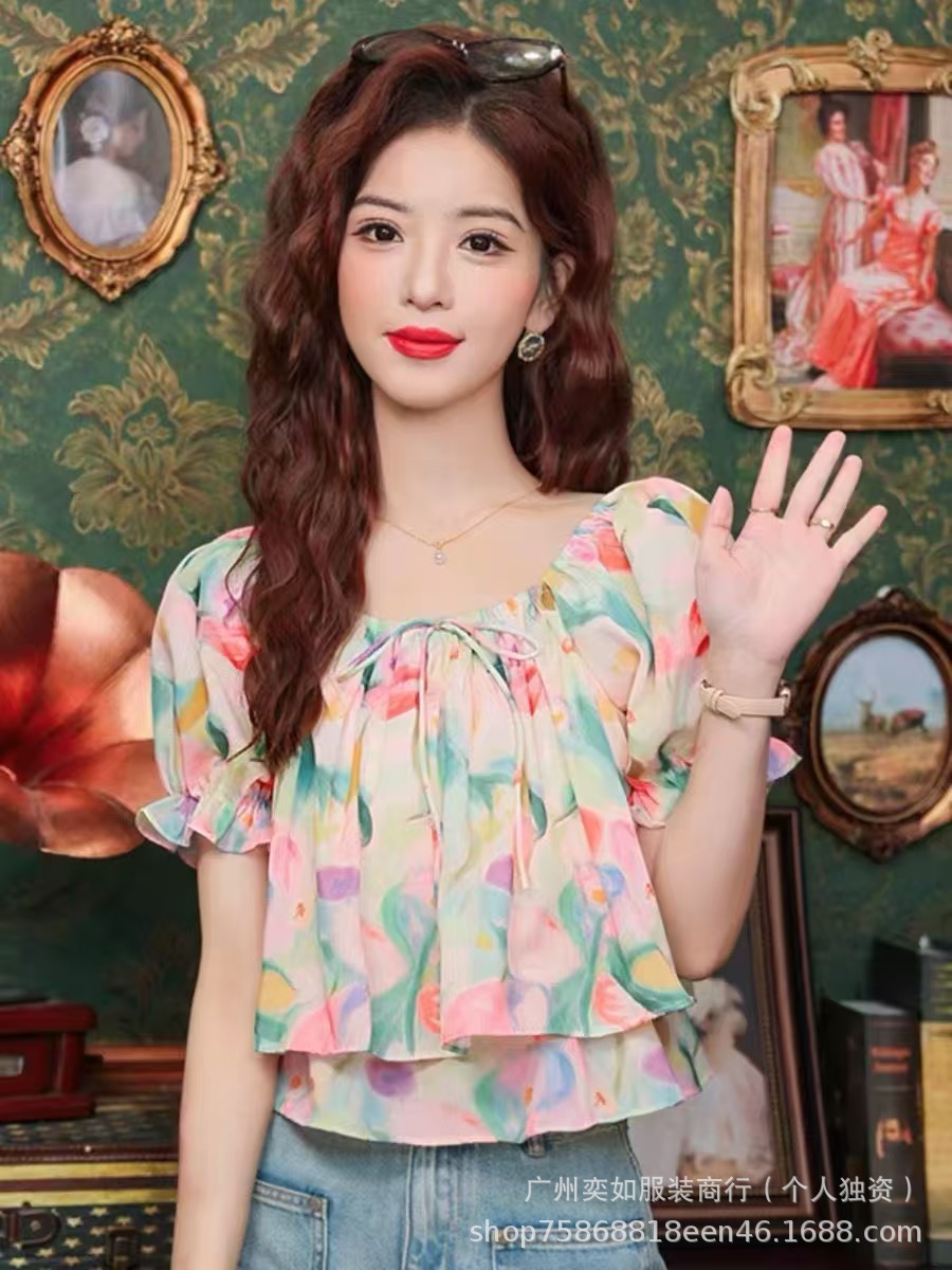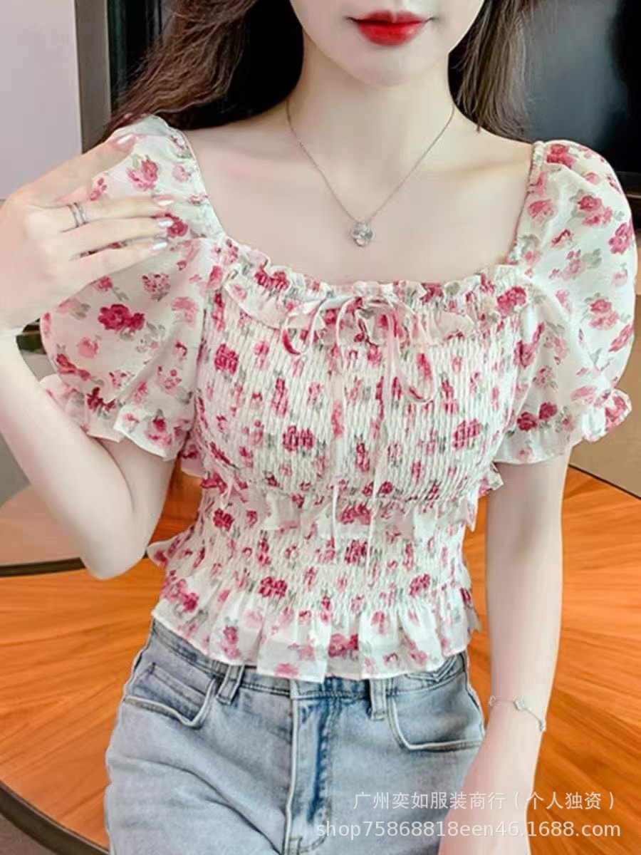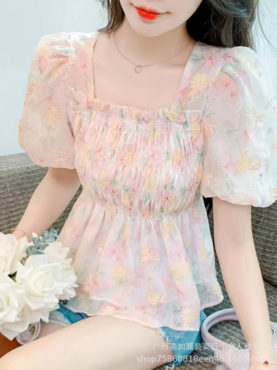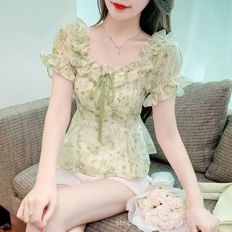 여성을위한 반팔 쉬폰 셔츠 티셔츠 2025 여름 새로운 프랑스 스타일 꽃 짧은 탑 기타 도매스토어 가기