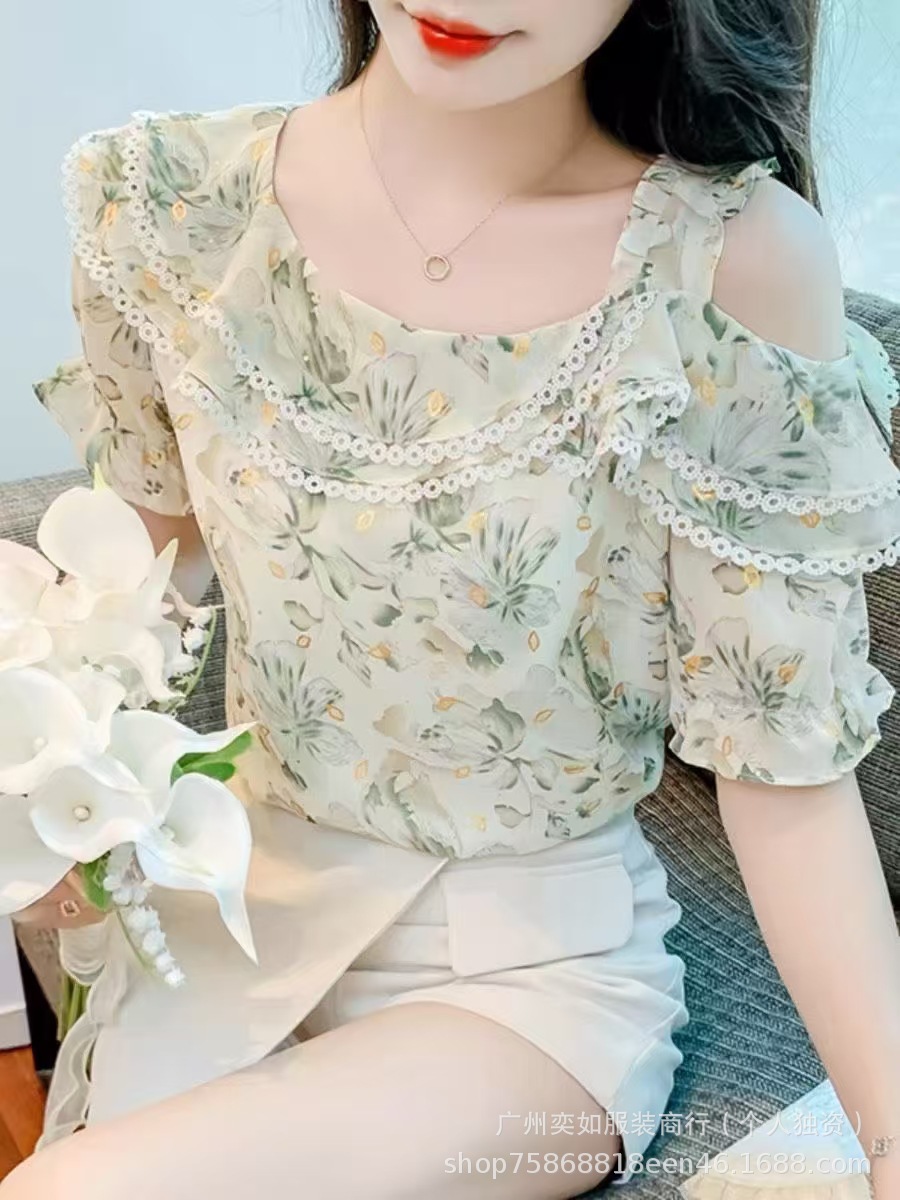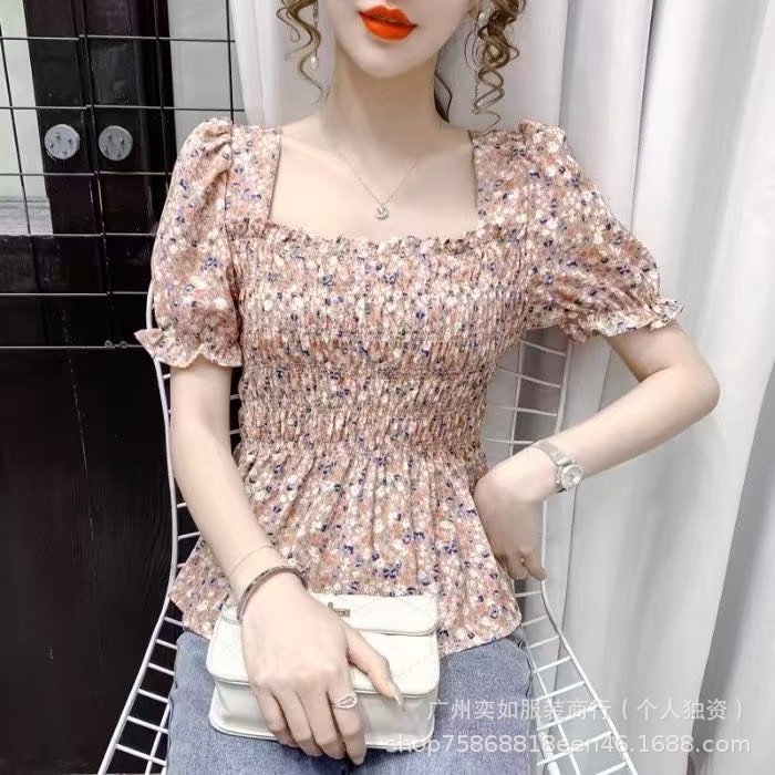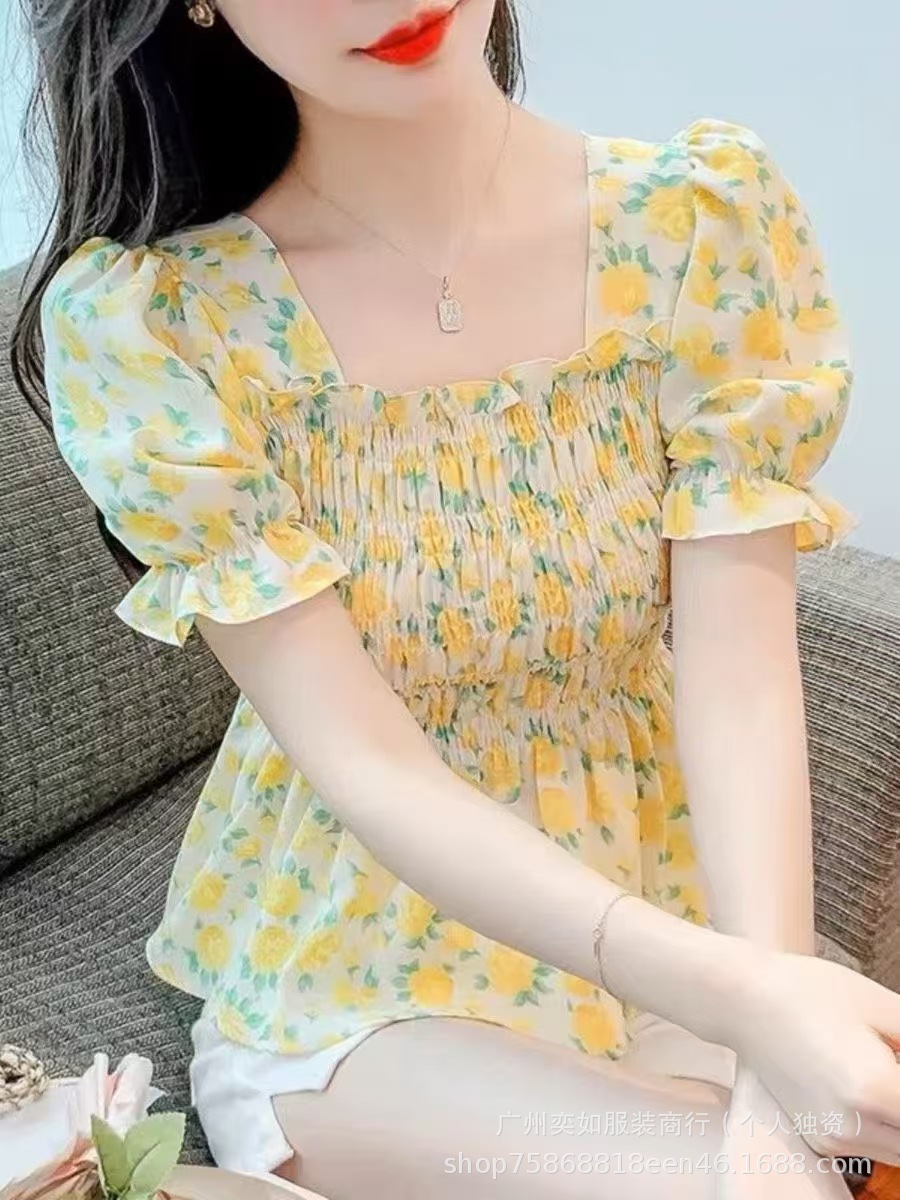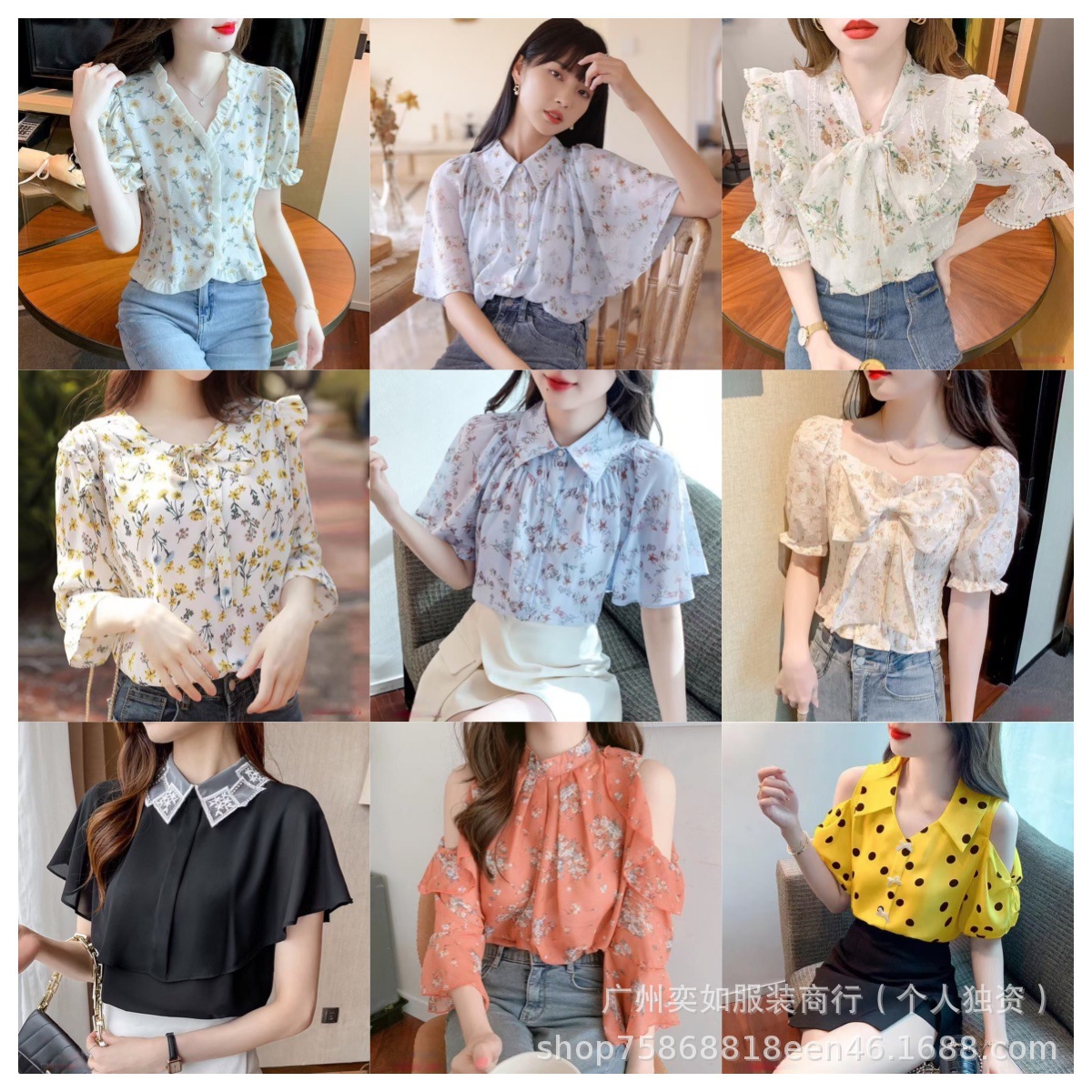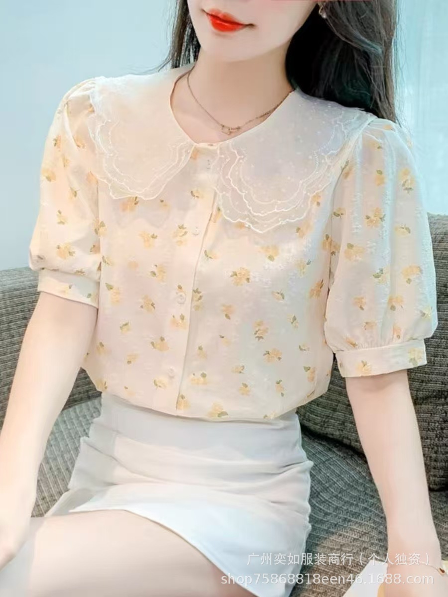 여성을위한 반팔 쉬폰 셔츠 티셔츠 2025 여름 새로운 프랑스 스타일 꽃 짧은 탑 기타 도매스토어 가기