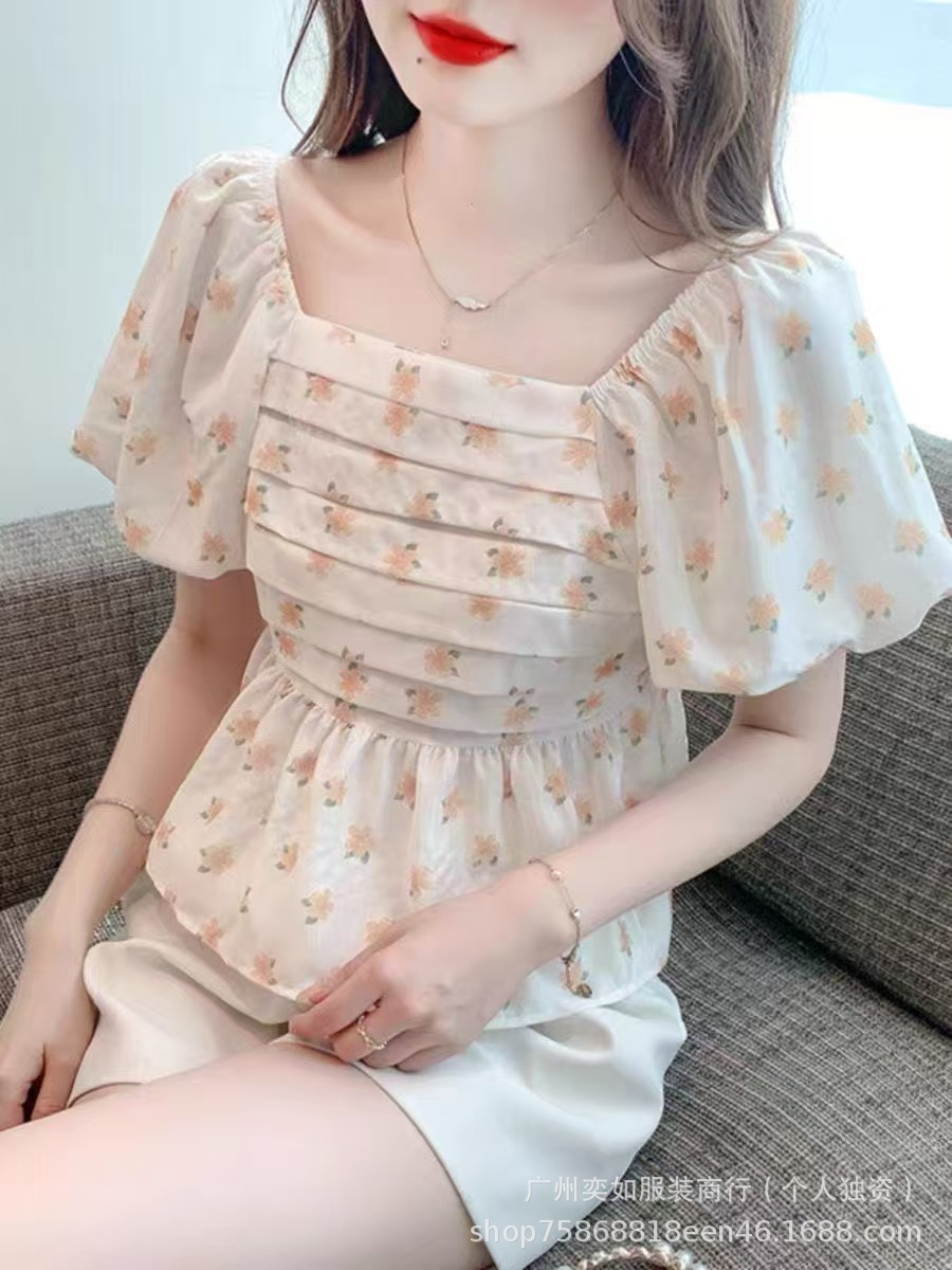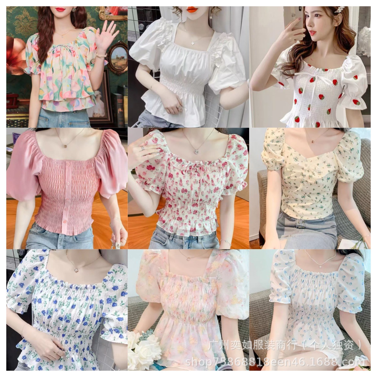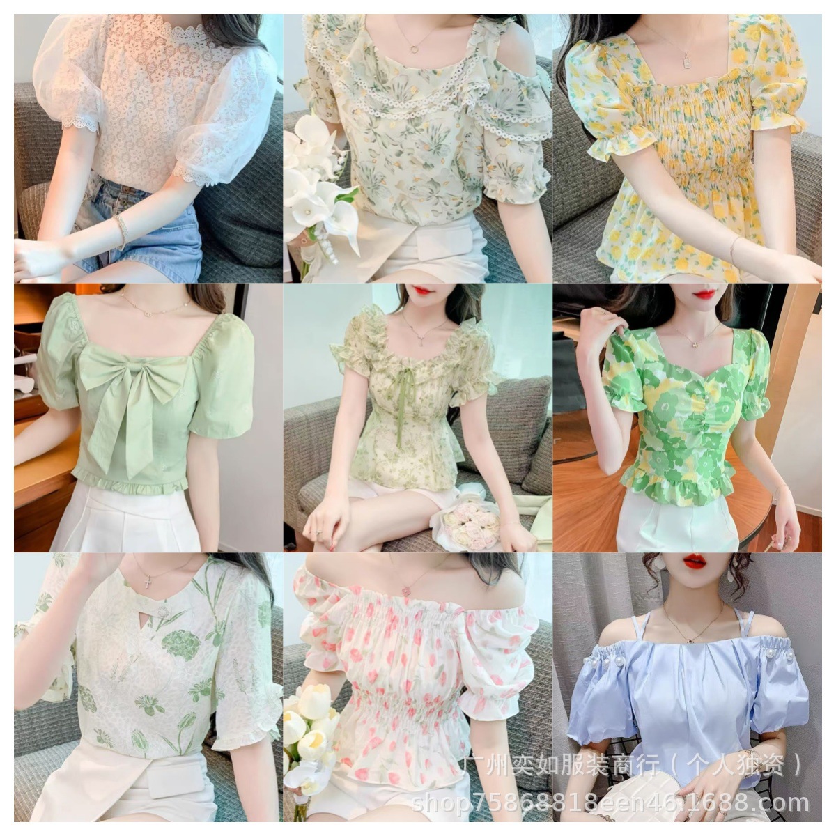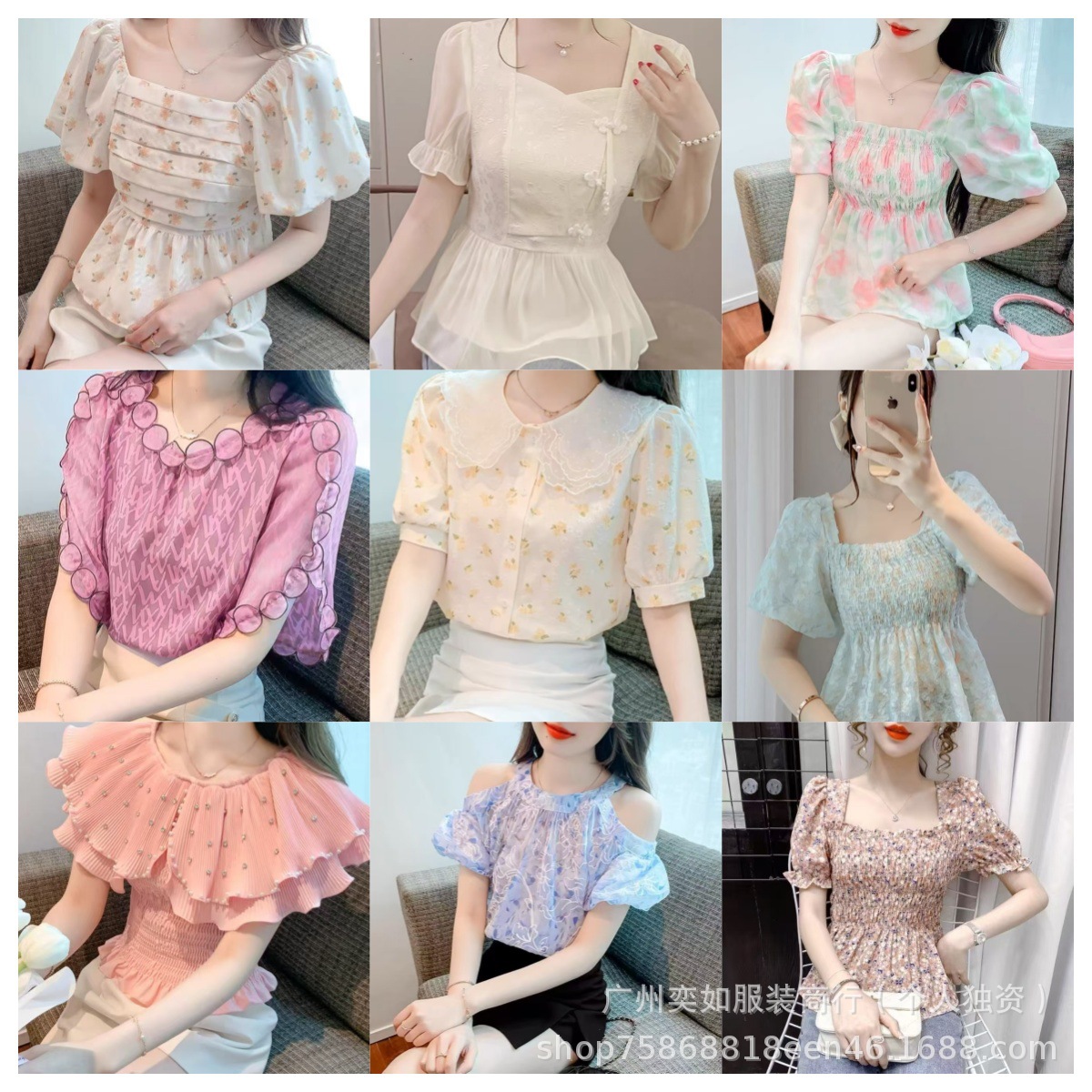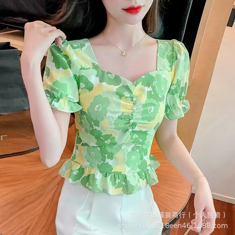 여성을위한 반팔 쉬폰 셔츠 티셔츠 2025 여름 새로운 프랑스 스타일 꽃 짧은 탑 기타 도매스토어 가기