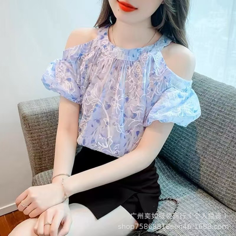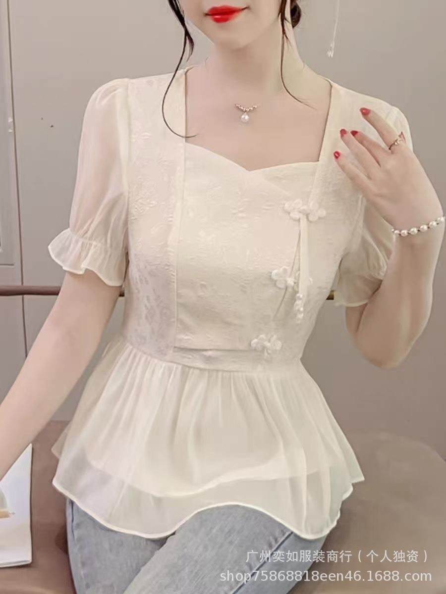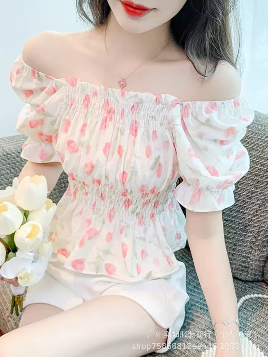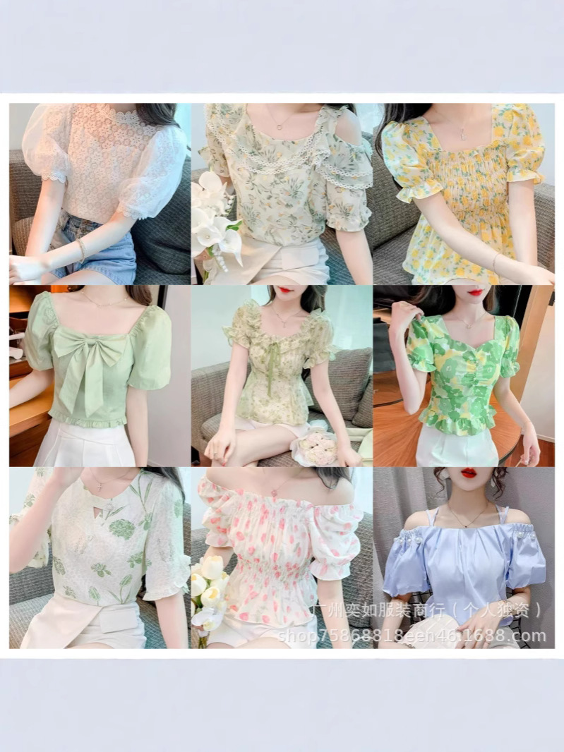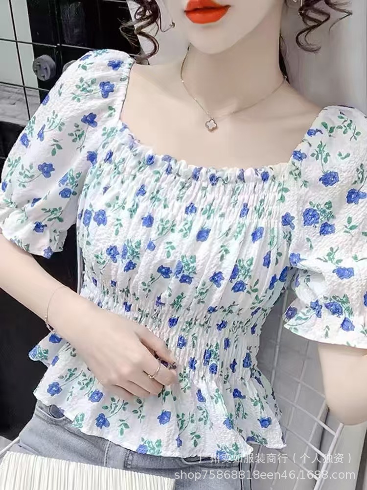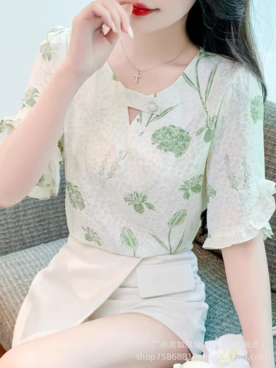 여성을위한 반팔 쉬폰 셔츠 티셔츠 2025 여름 새로운 프랑스 스타일 꽃 짧은 탑 기타 도매스토어 가기