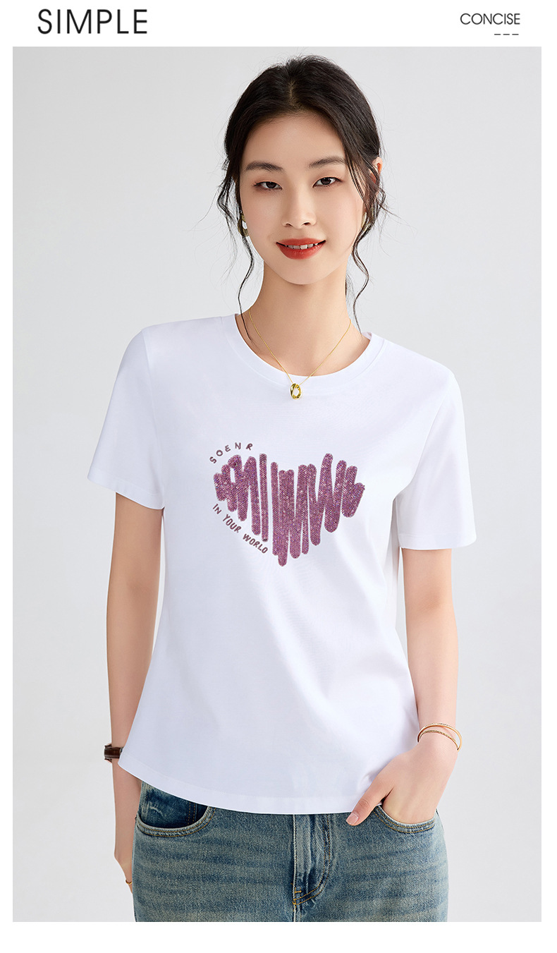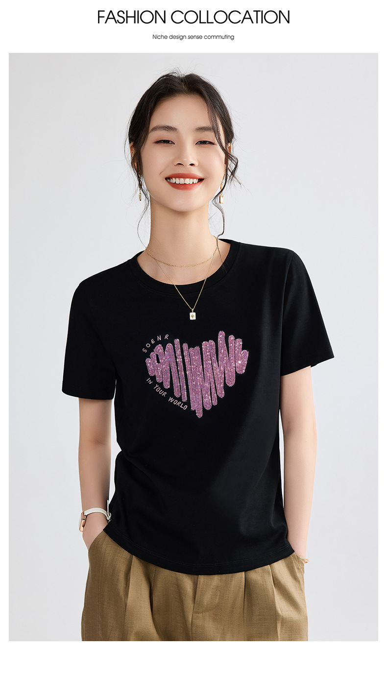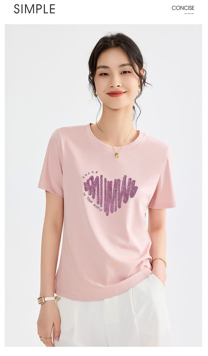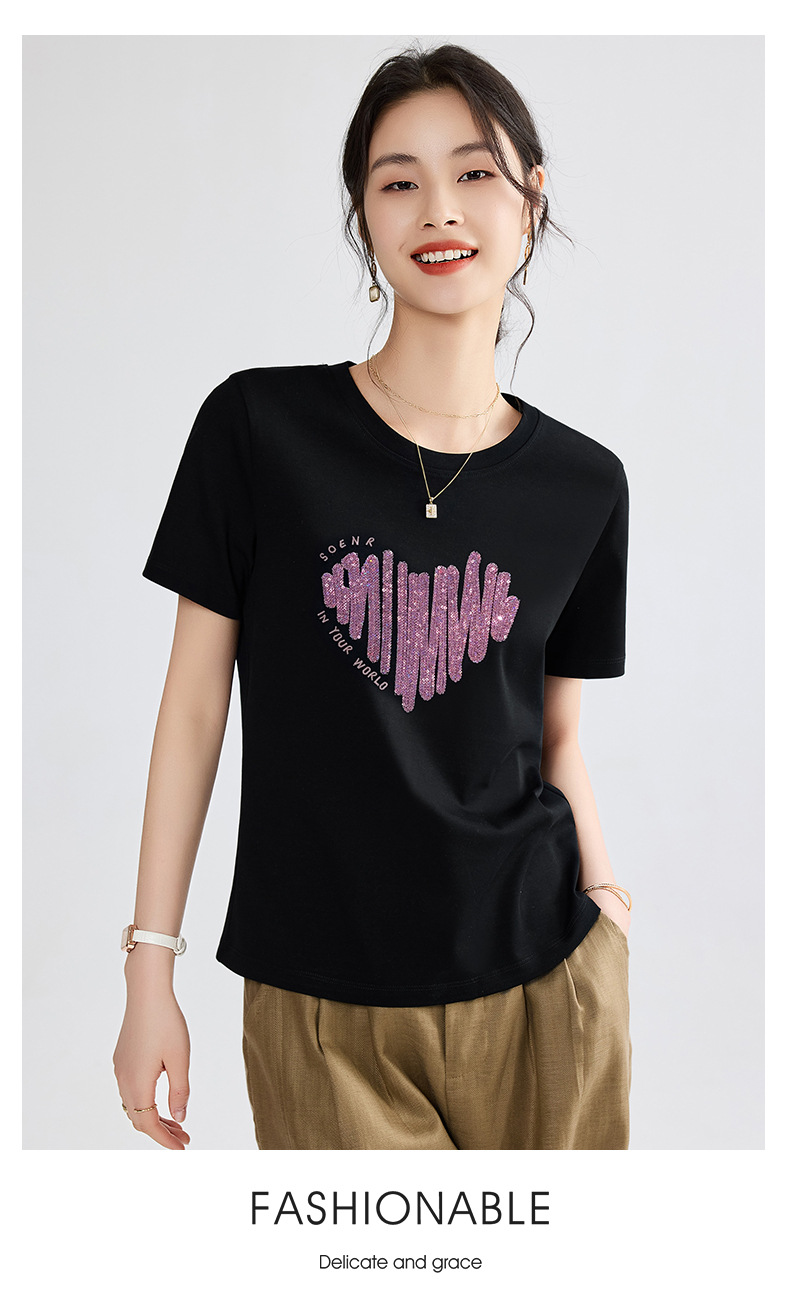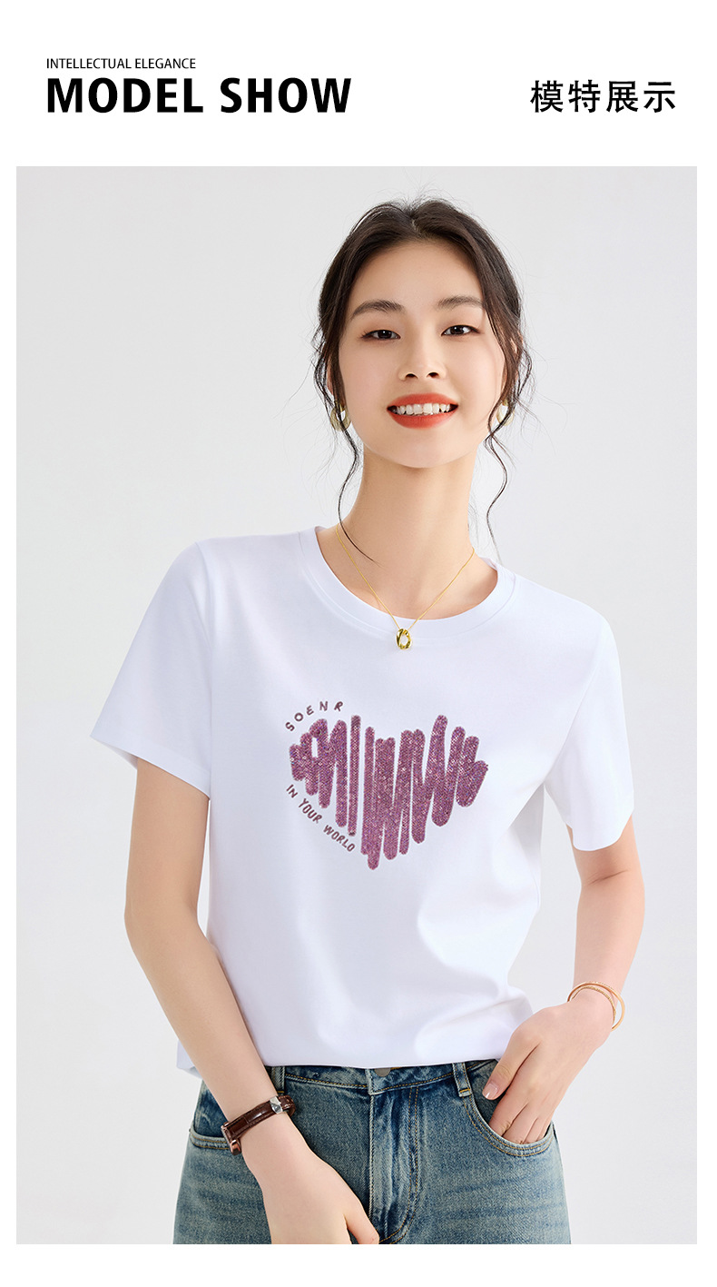 양면 실크광택 코튼 2026 여름 반팔 티셔츠 여성용 화이트 슬리밍 여성용 상의 하트 스팽글 자수 txu