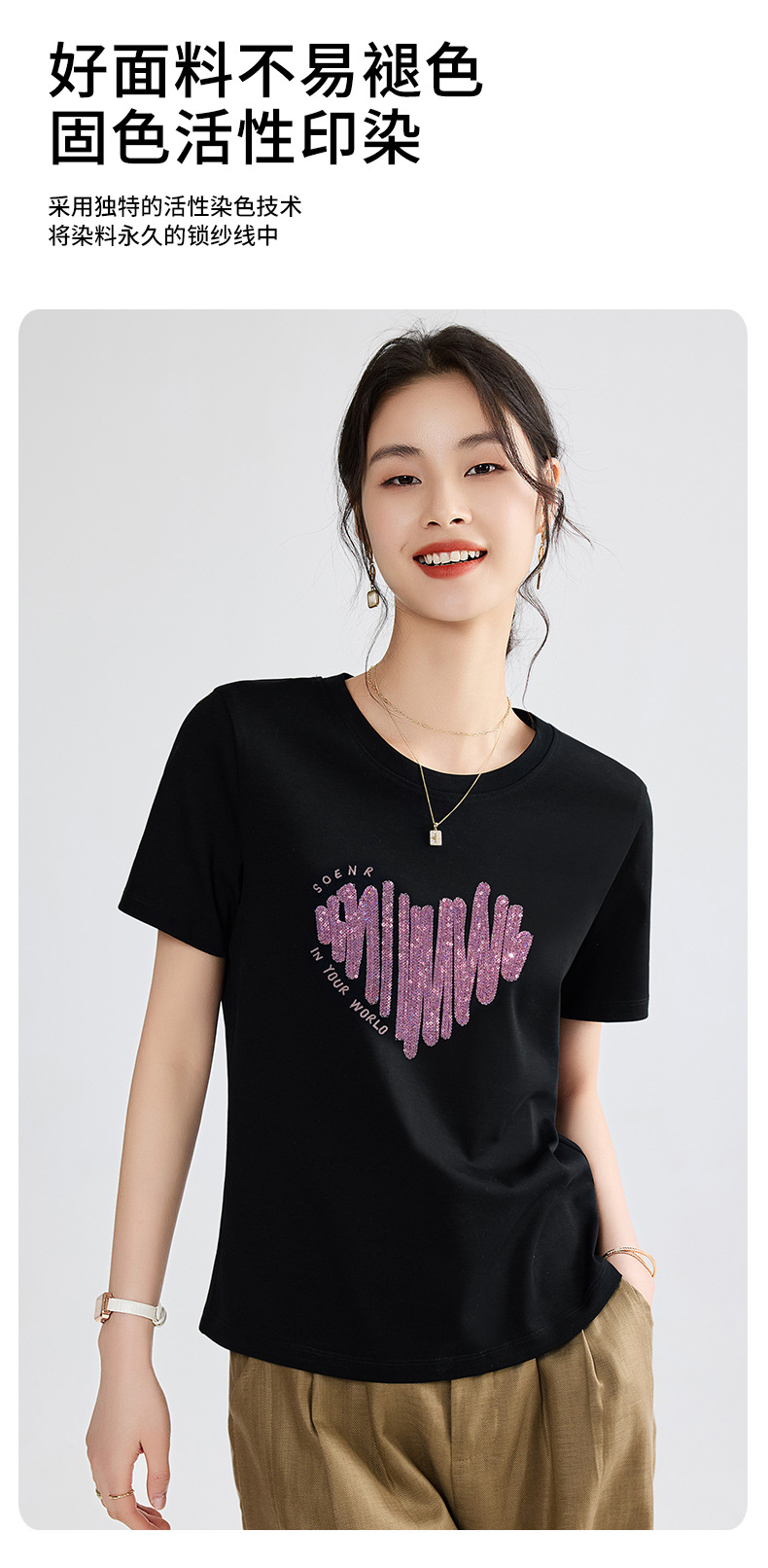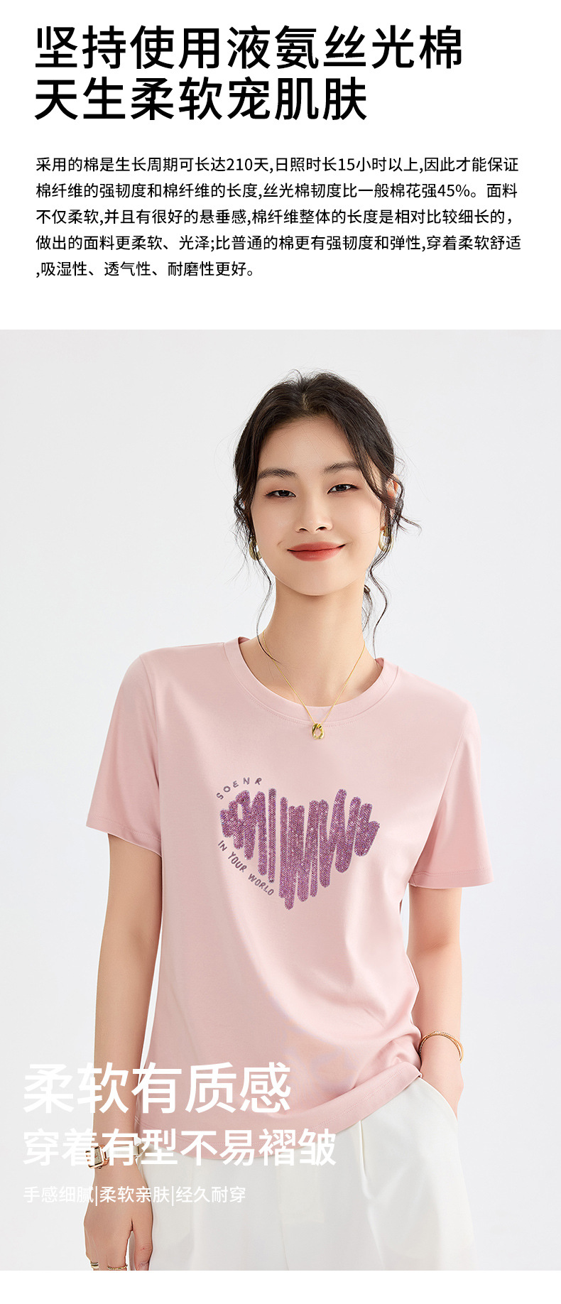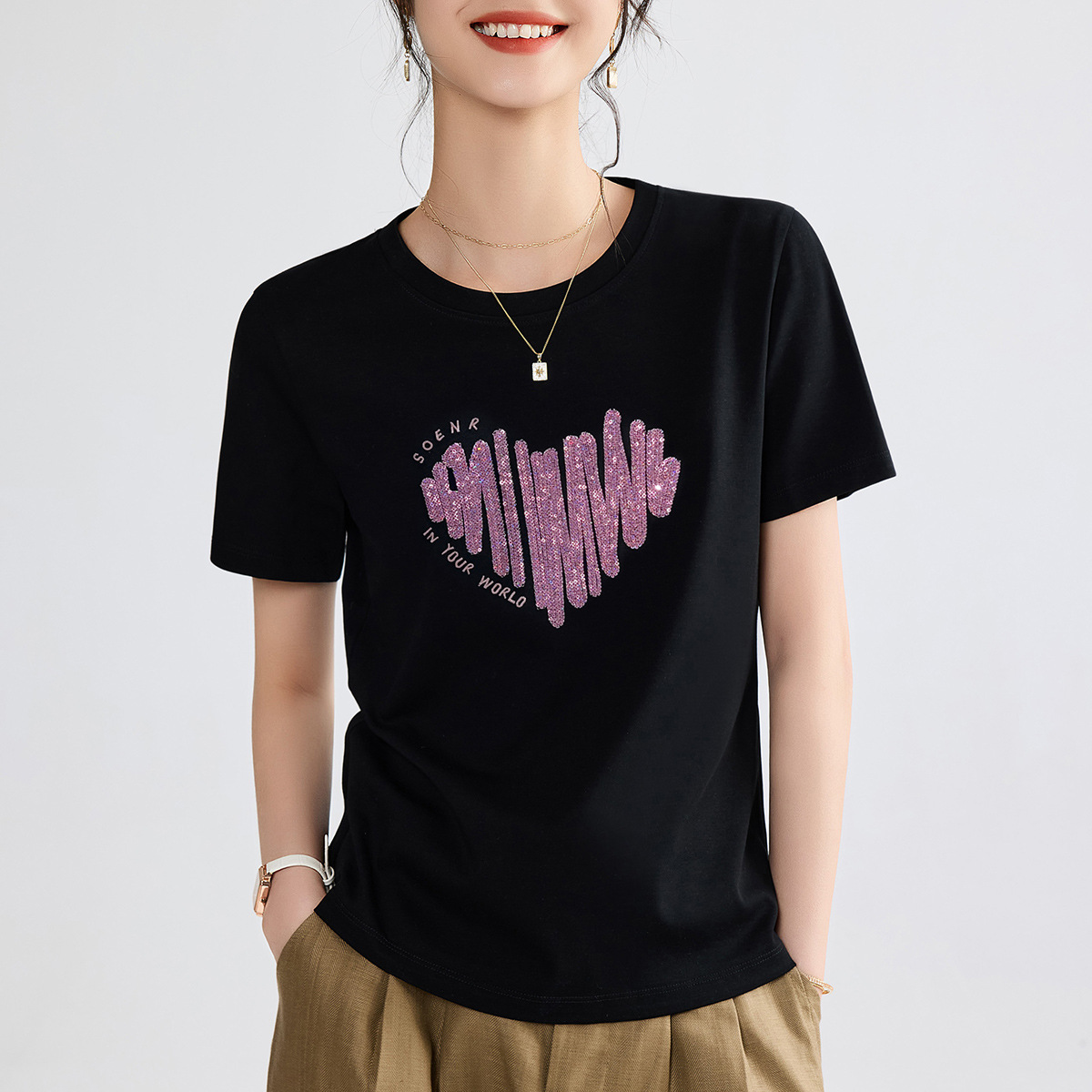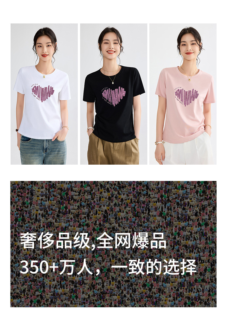 양면 실크광택 코튼 2026 여름 반팔 티셔츠 여성용 화이트 슬리밍 여성용 상의 하트 스팽글 자수 txu
