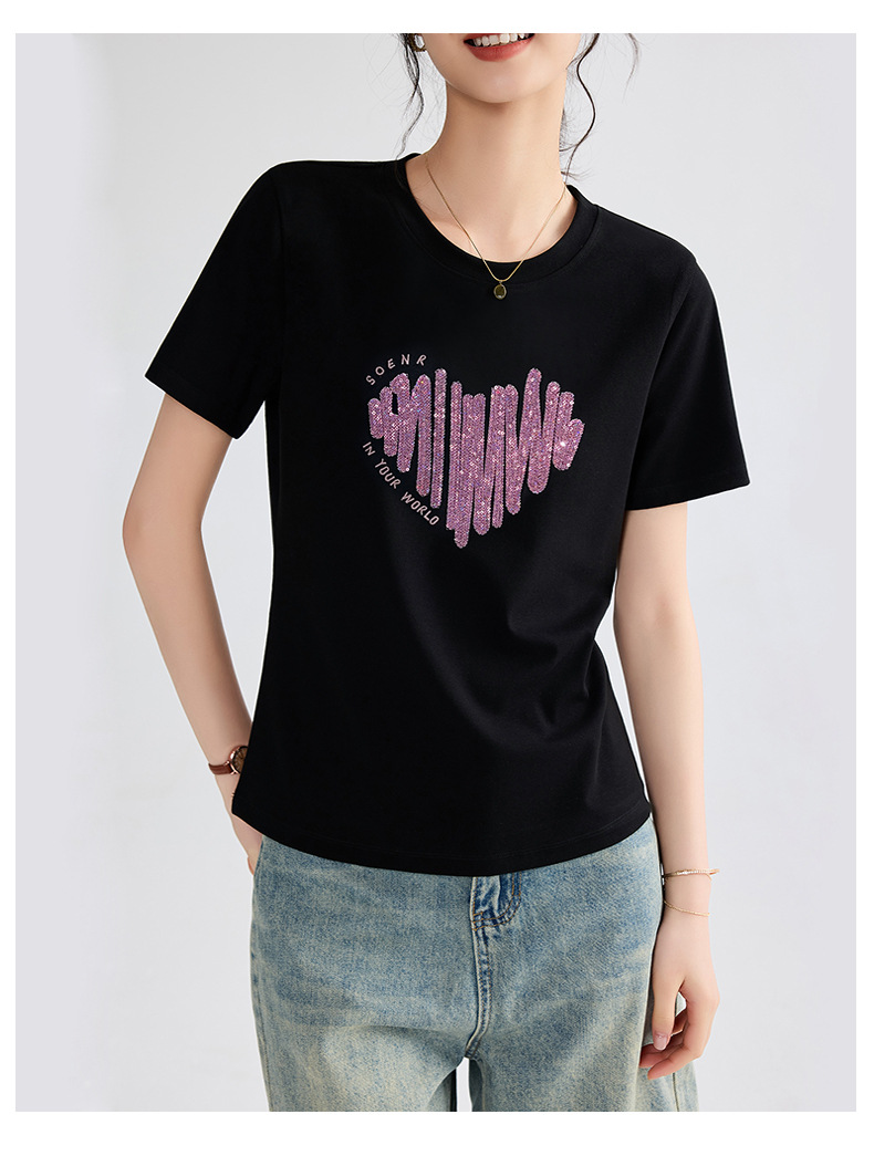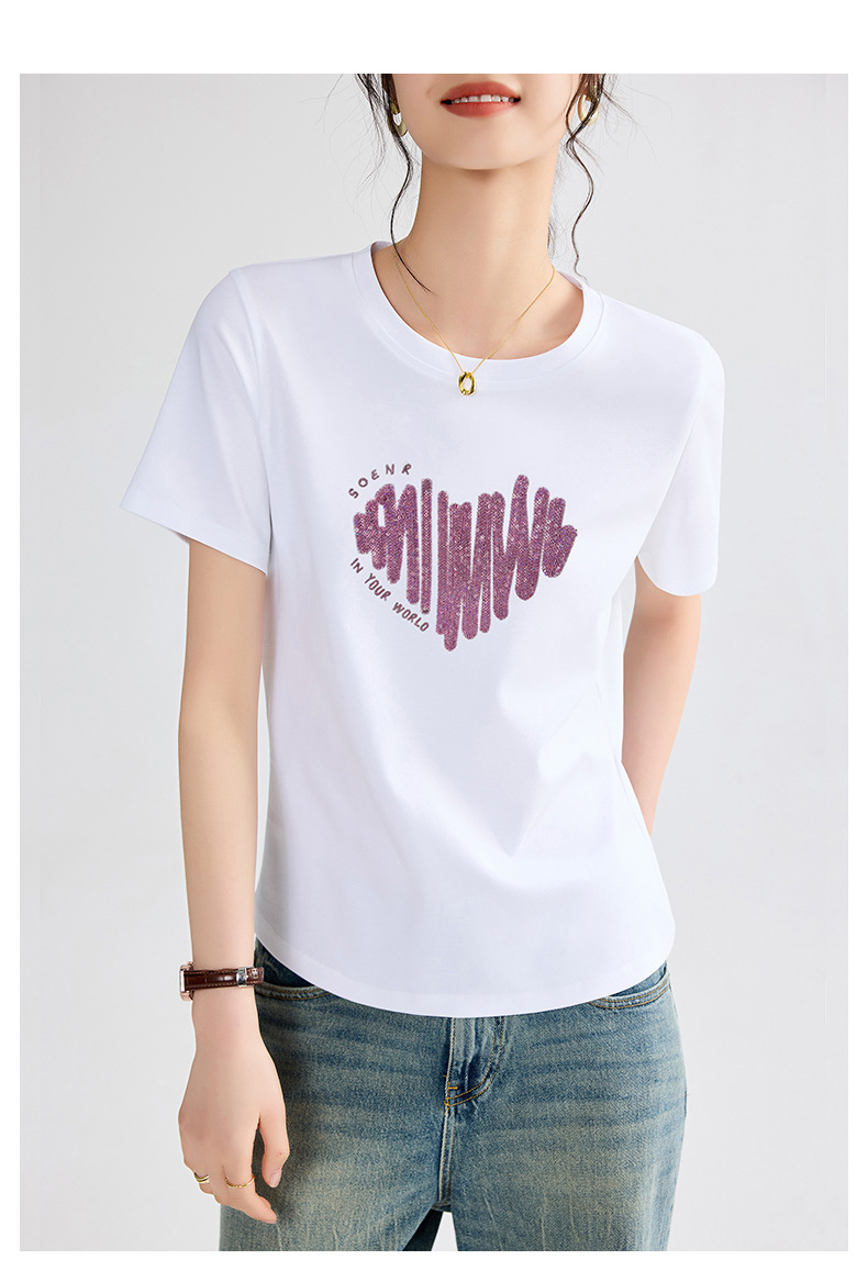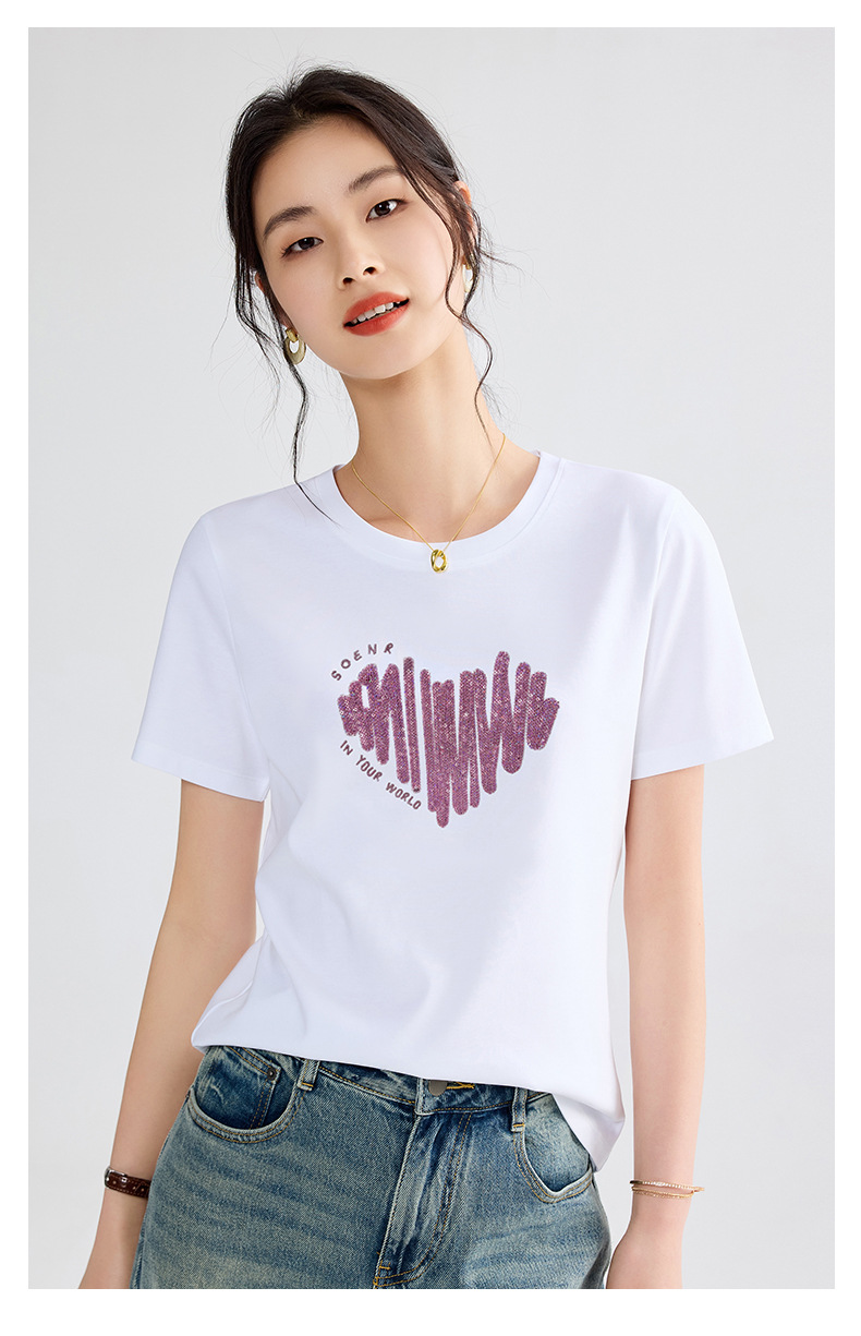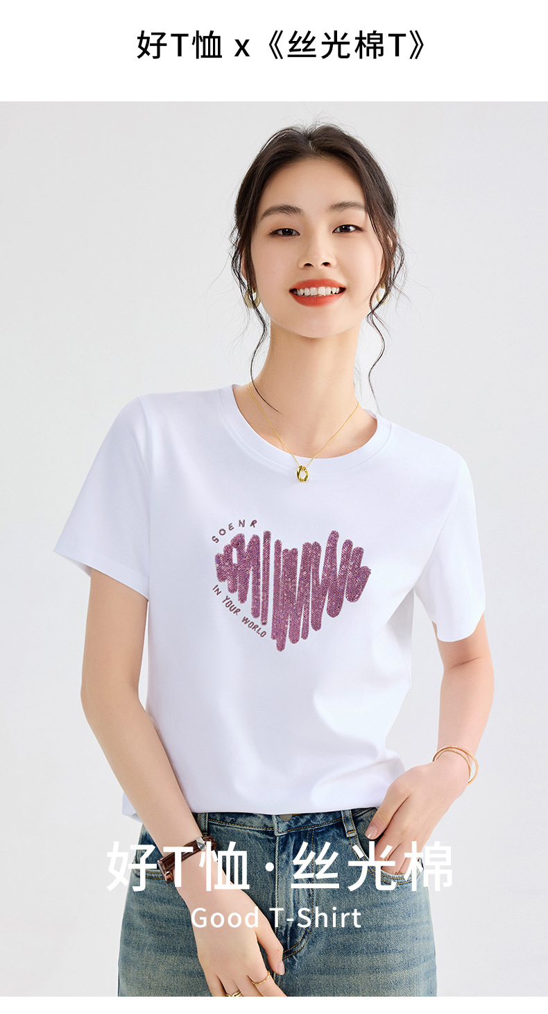 양면 실크광택 코튼 2026 여름 반팔 티셔츠 여성용 화이트 슬리밍 여성용 상의 하트 스팽글 자수 txu스토어 가기