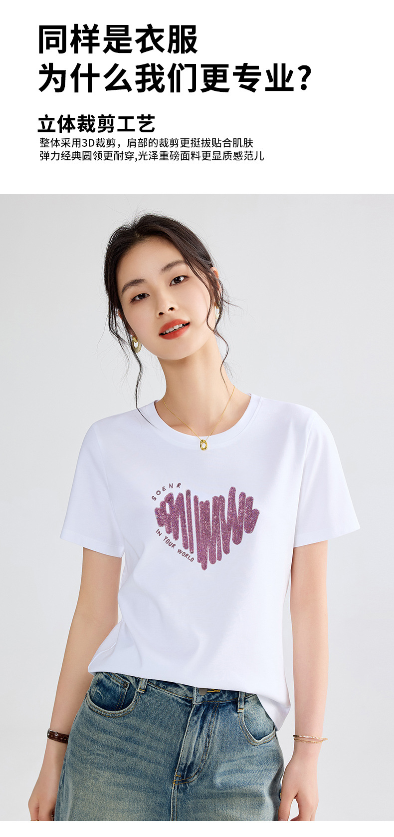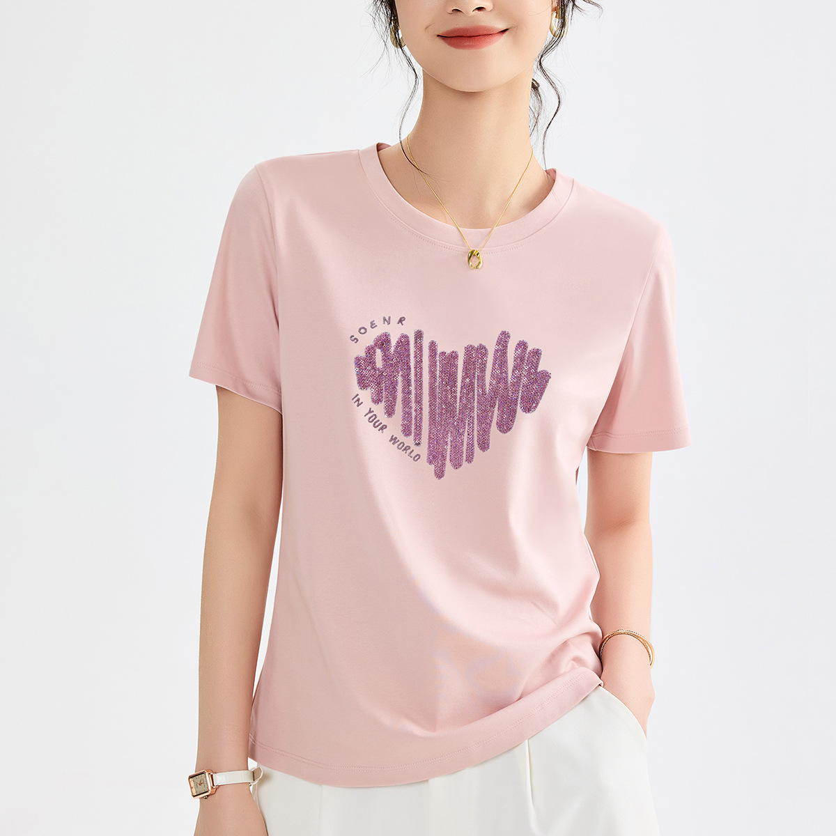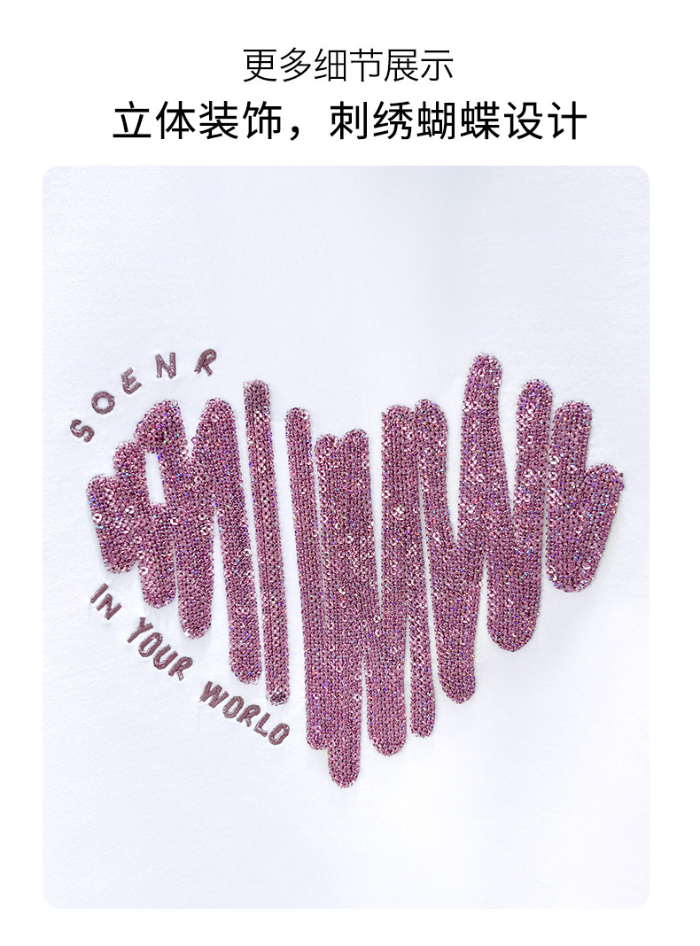양면 실크광택 코튼 2026 여름 반팔 티셔츠 여성용 화이트 슬리밍 여성용 상의 하트 스팽글 자수 txu스토어 가기