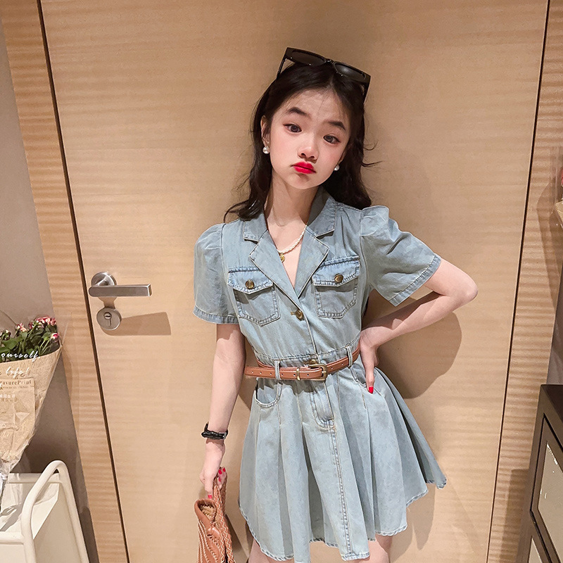 어린이 소녀 새로운 데님 향수 빅 원피스 세련된 중견 소녀 여름 한국 스타일 대체 머리 작은 소녀 면화스토어 가기