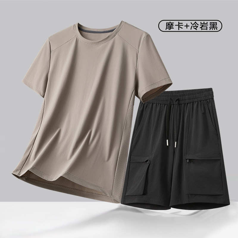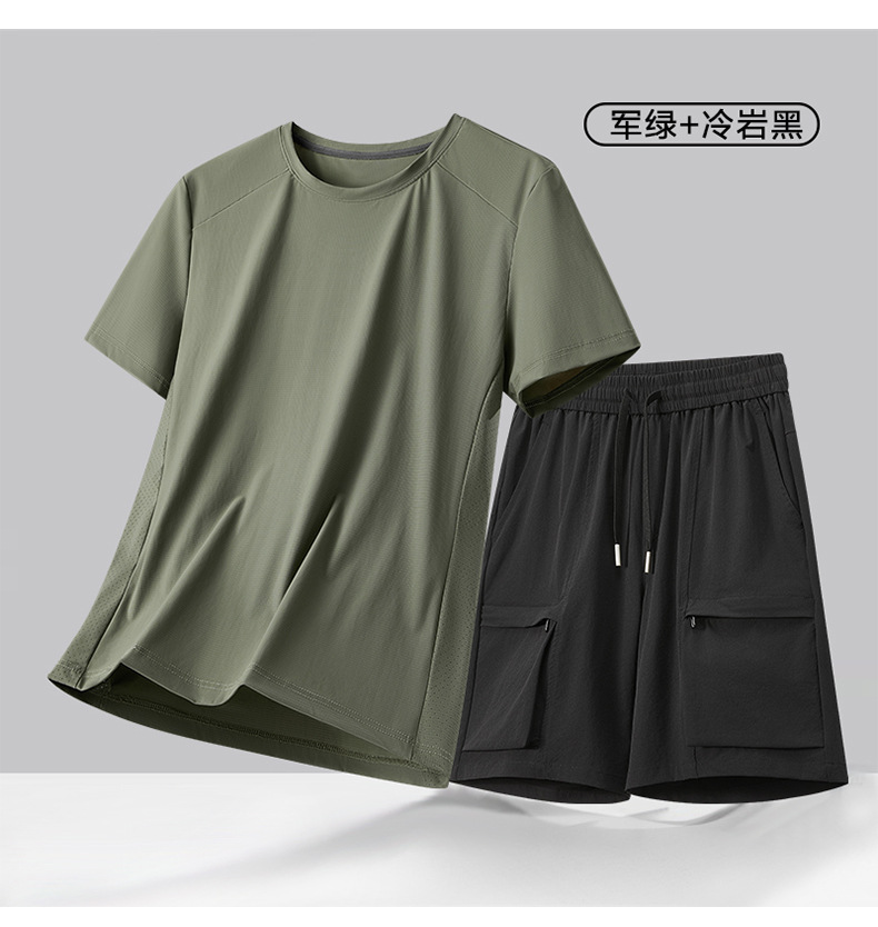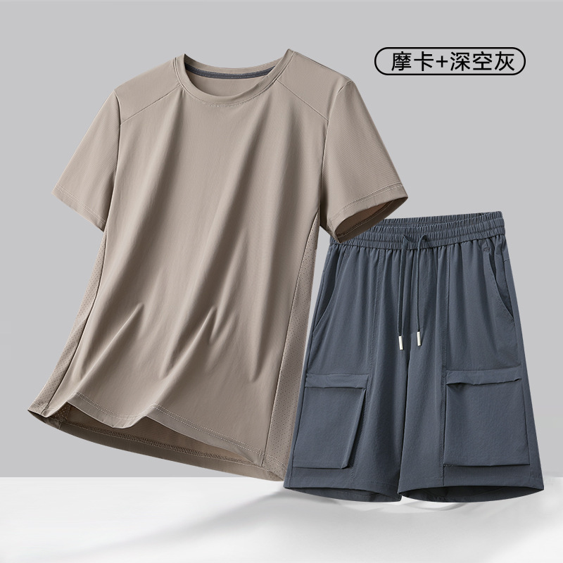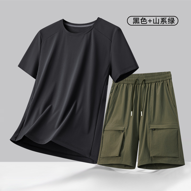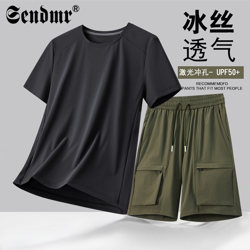 여름 빠른 건조 세트 통기성 아이스 실크 운동복 캐주얼 반팔 티셔츠 드레스 반바지 남성 캐주얼 투피스 세트