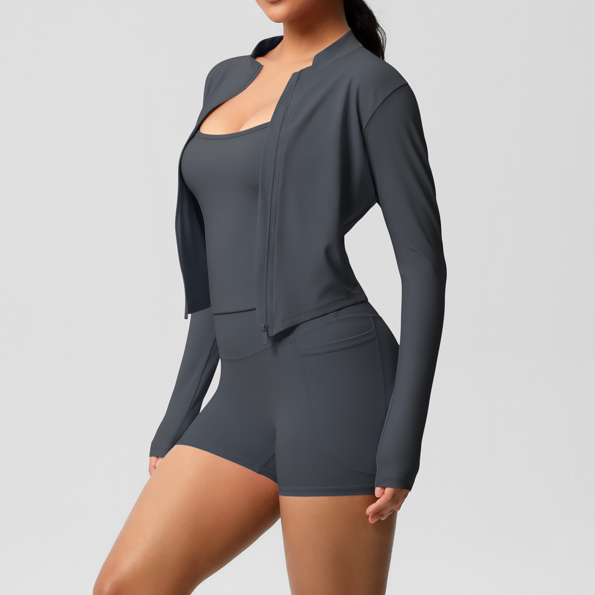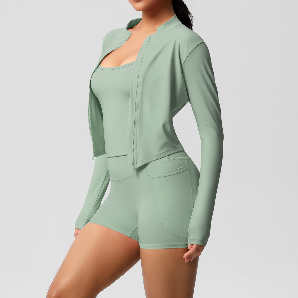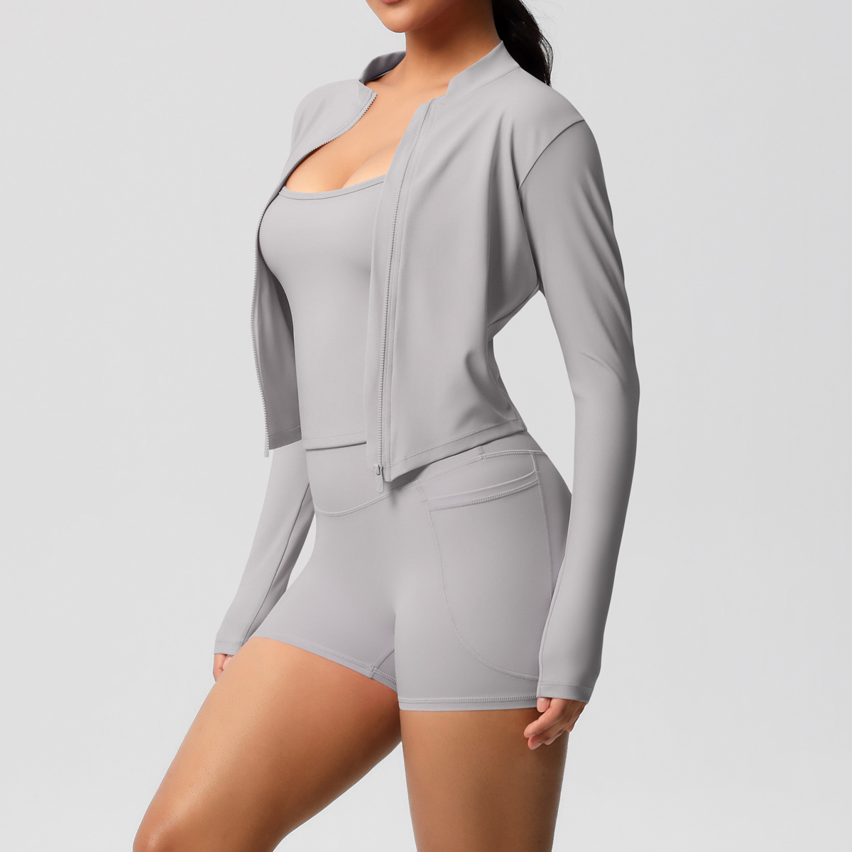 유럽과 미국의 누드 타이트 캐미솔 요가복 속건성 스포츠 포켓 반바지 정장 지퍼 피트니스웨어 슈트
