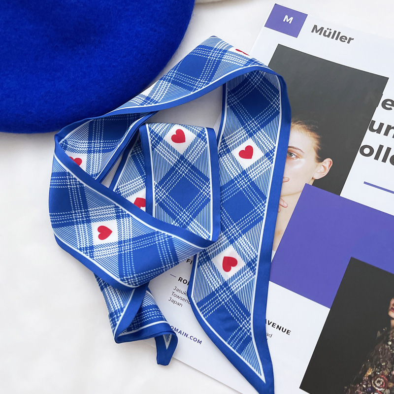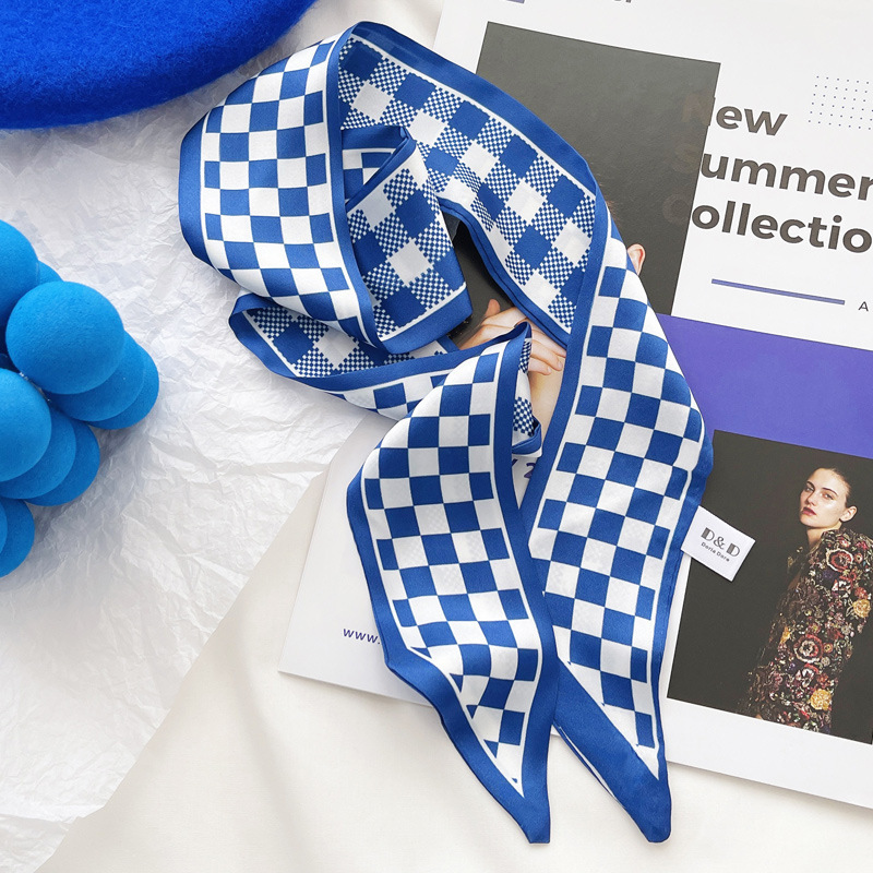 클라인 블루 실크 스카프 작은 스카프 봄과 여름 새로운 바둑판 머리띠 리본 스카프 가을 장식 여성 헤어 타이