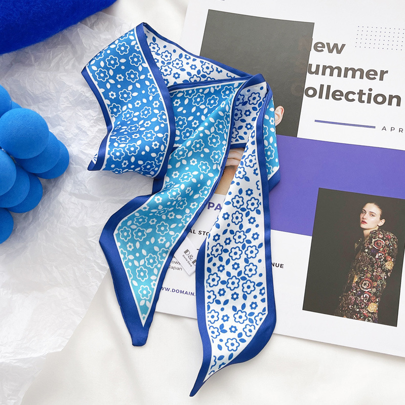 클라인 블루 실크 스카프 작은 스카프 봄과 여름 새로운 바둑판 머리띠 리본 스카프 가을 장식 여성 헤어 타이스토어 가기