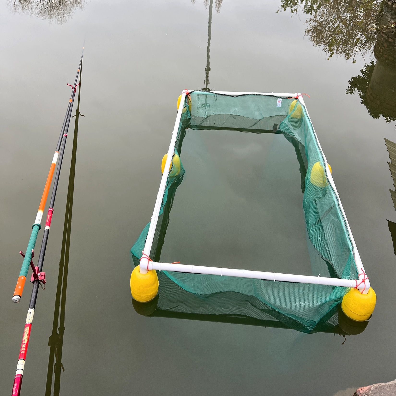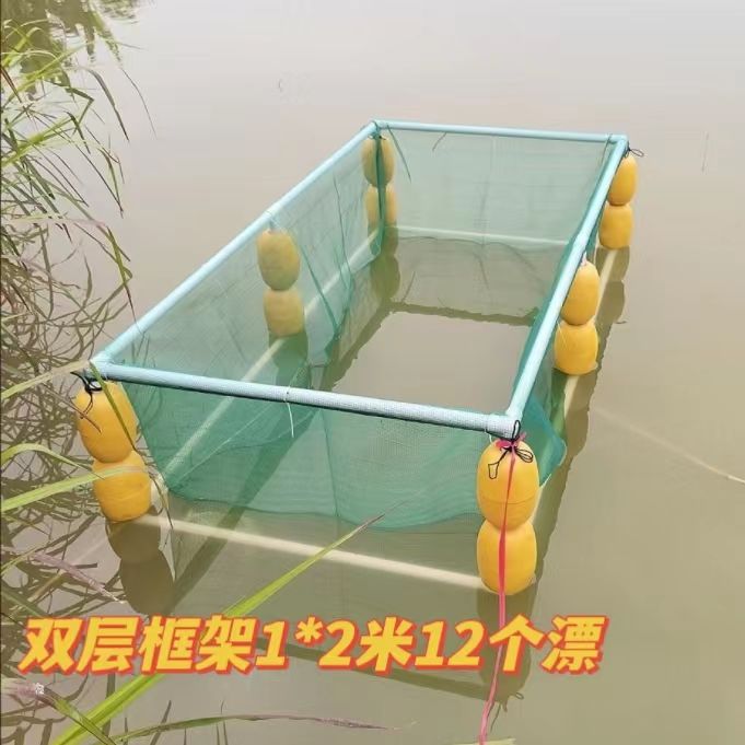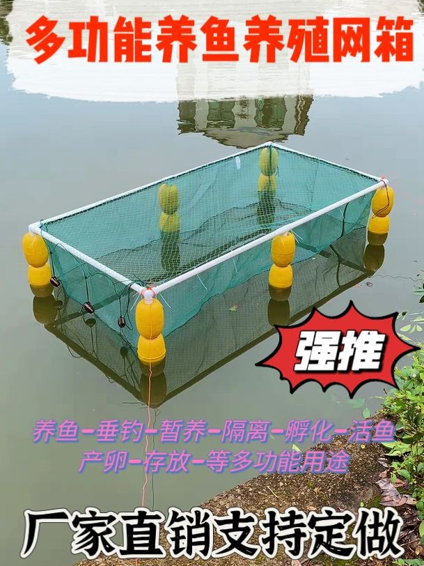 살아있는 물고기를 저장하고 물고기를 물고기 튀김 문화 그물 상자 덮개가있는 부동 그물 상자에 반환하기위한 프레임이있는 자동 서스펜션 풀 세트스토어 가기