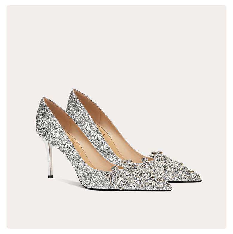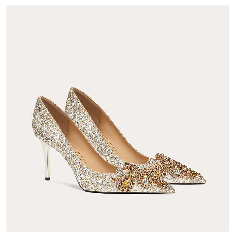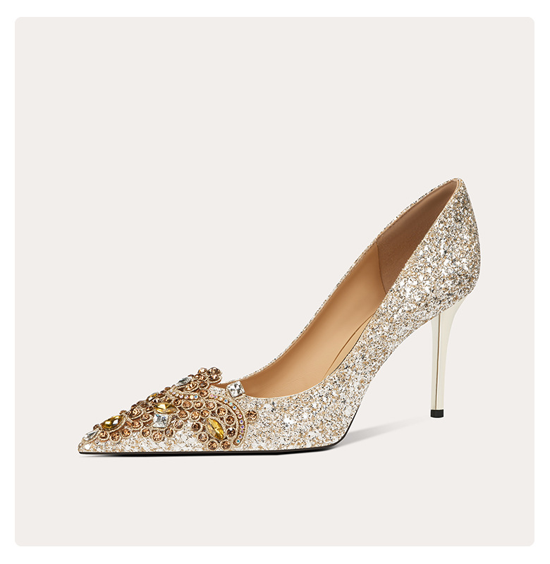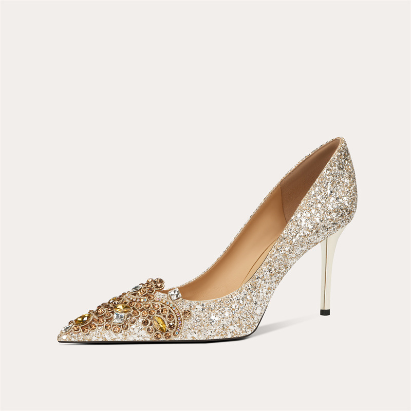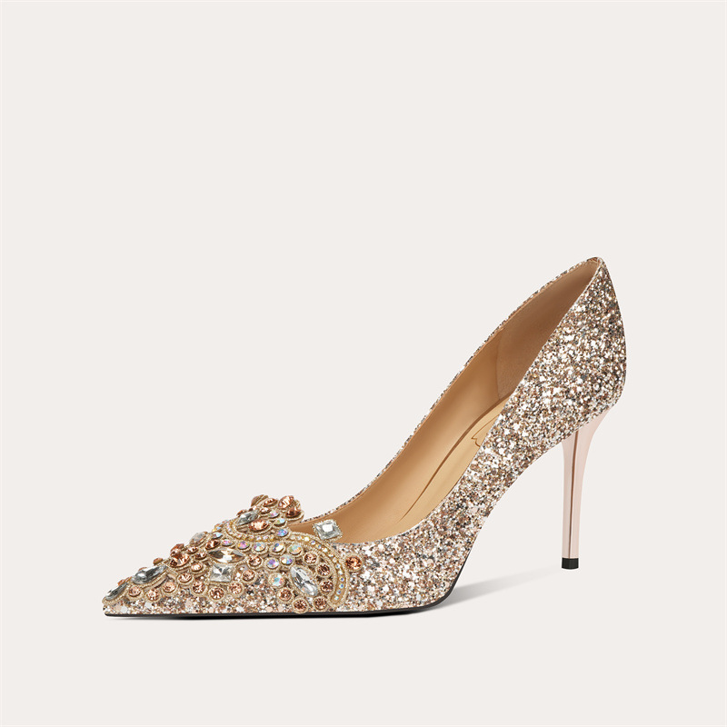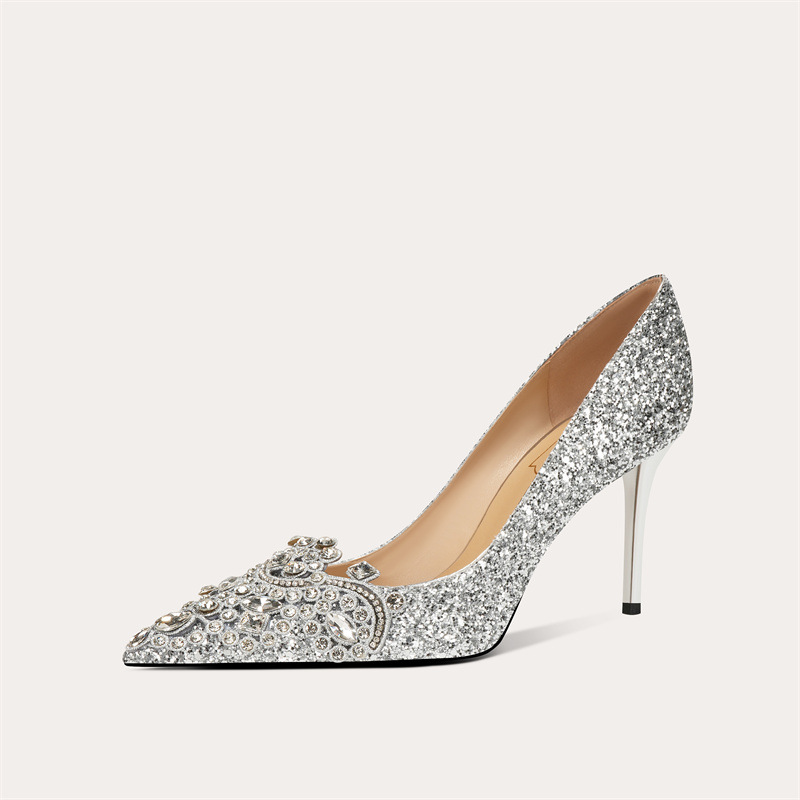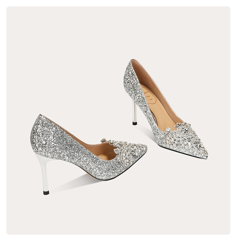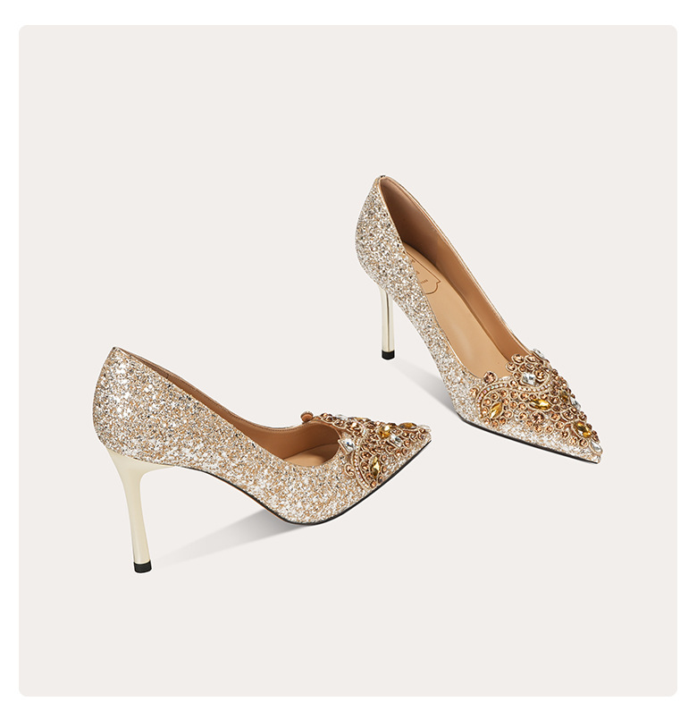 708-9 웨딩 신부 신발 웨딩 신발 여성용 Xiuhe 웨딩 원피스 금속 뾰족한 크리스탈 양가죽 하이힐 스틸레토 힐 신발