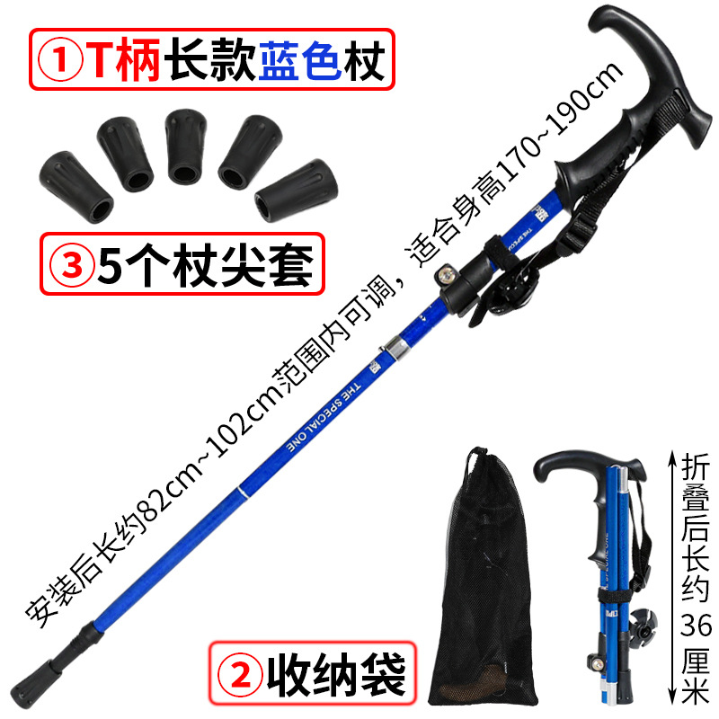 • T자형 손잡이가 있는 짧은 스타일(파란색) + 가방 + 지팡이 팁 커버 5개