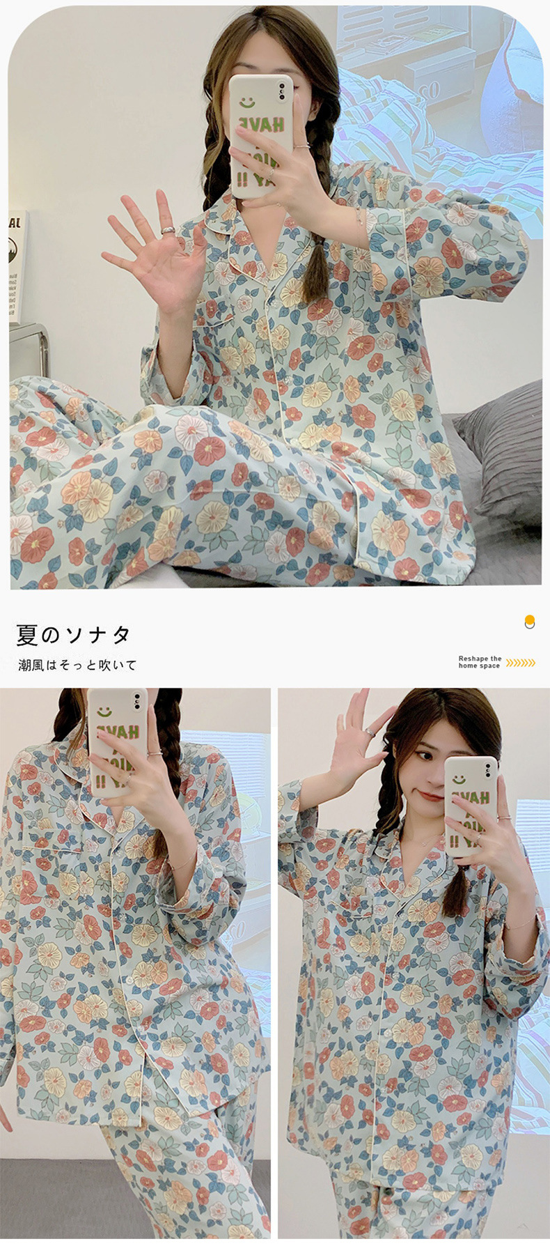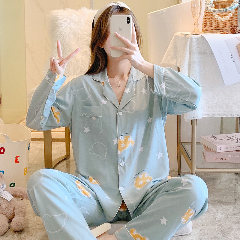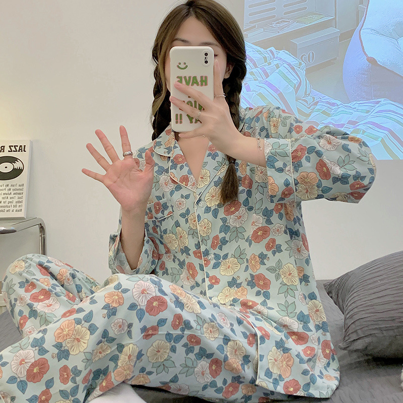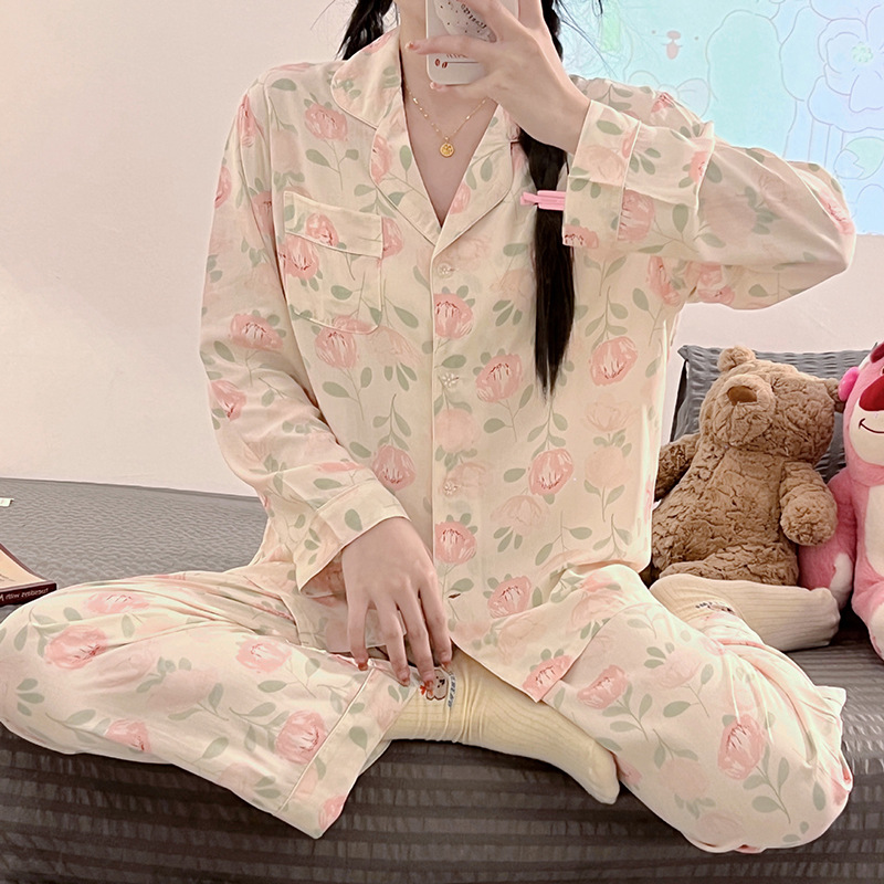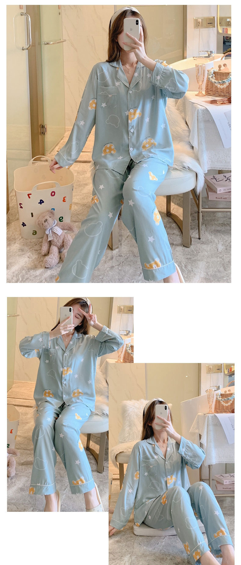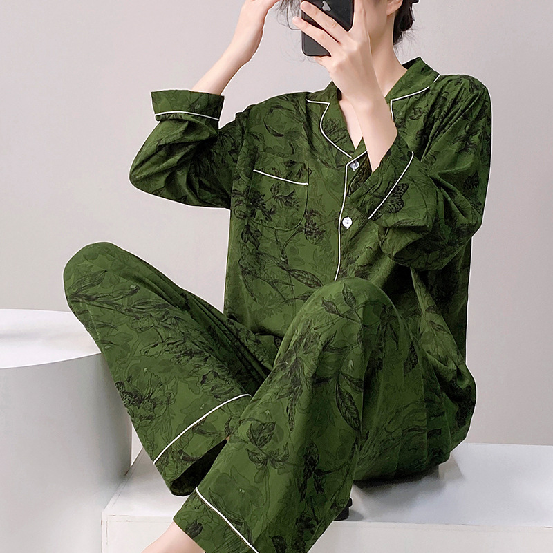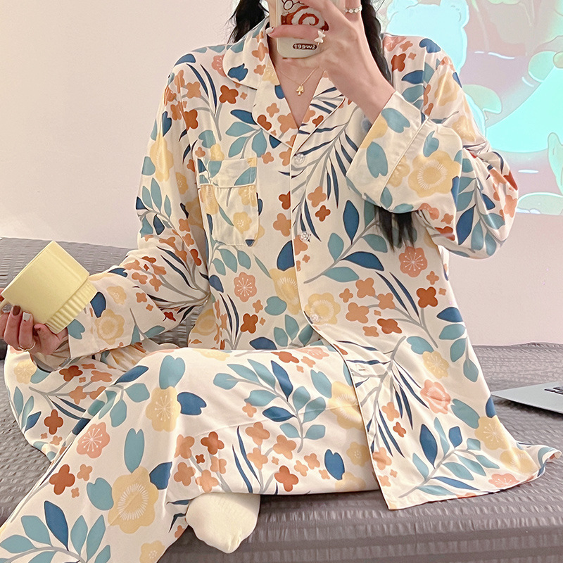 여성용 봄 여름 면 실크 긴팔 잠옷, 통기성, 땀 흡수성, 피부 친화적인, 얇은 면 실크 가정복, 루즈한 양복, 인공 면스토어 가기