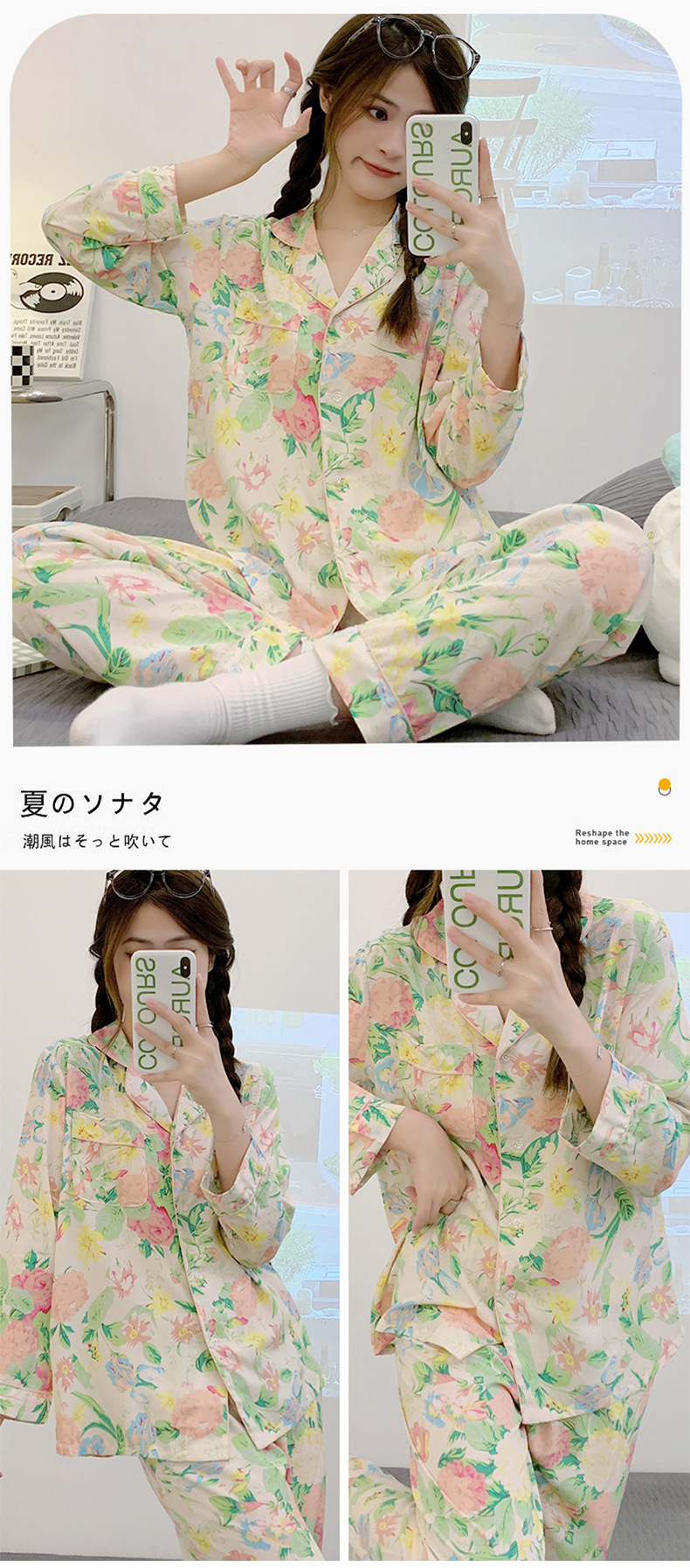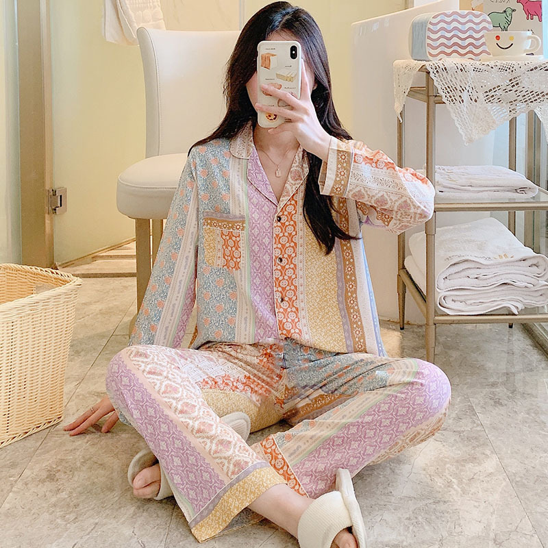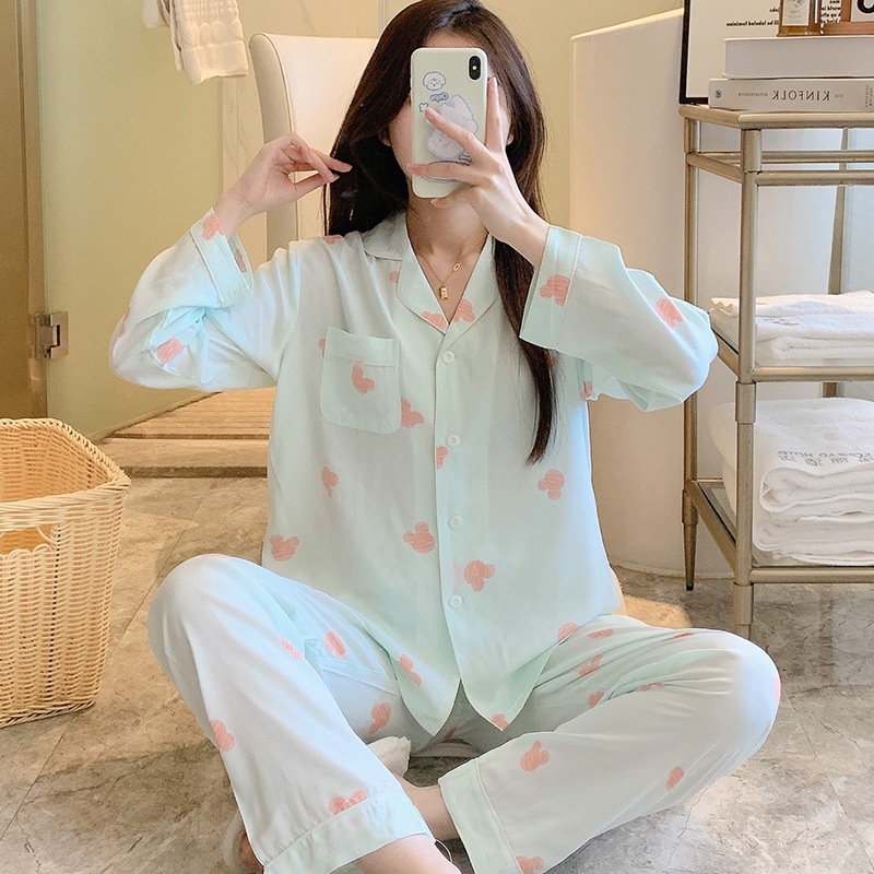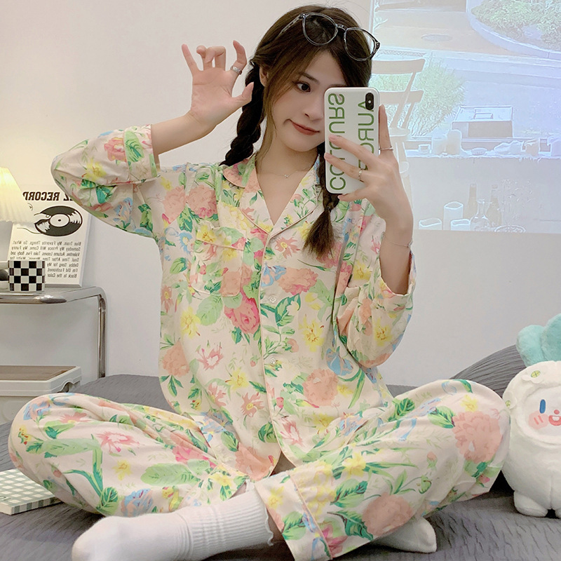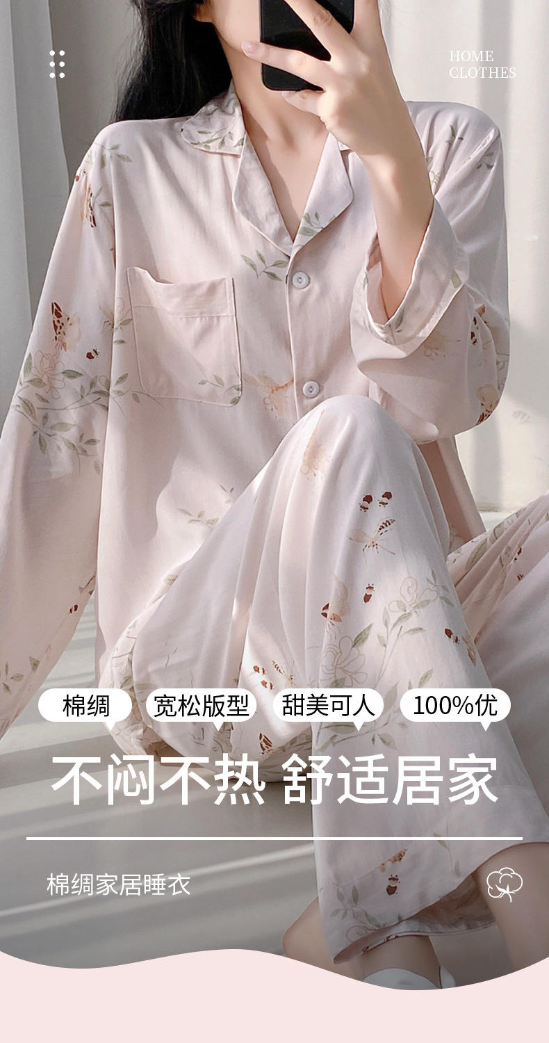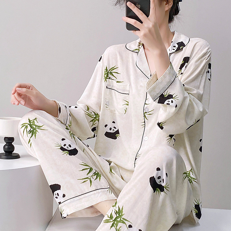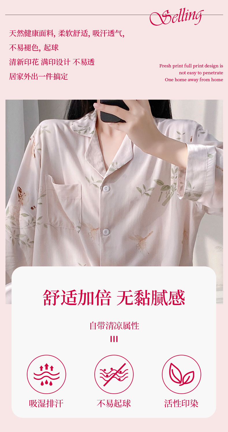 여성용 봄 여름 면 실크 긴팔 잠옷, 통기성, 땀 흡수성, 피부 친화적인, 얇은 면 실크 가정복, 루즈한 양복, 인공 면스토어 가기
