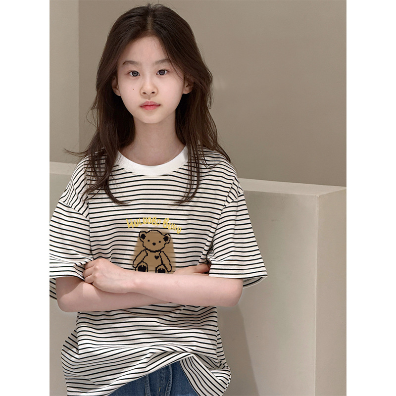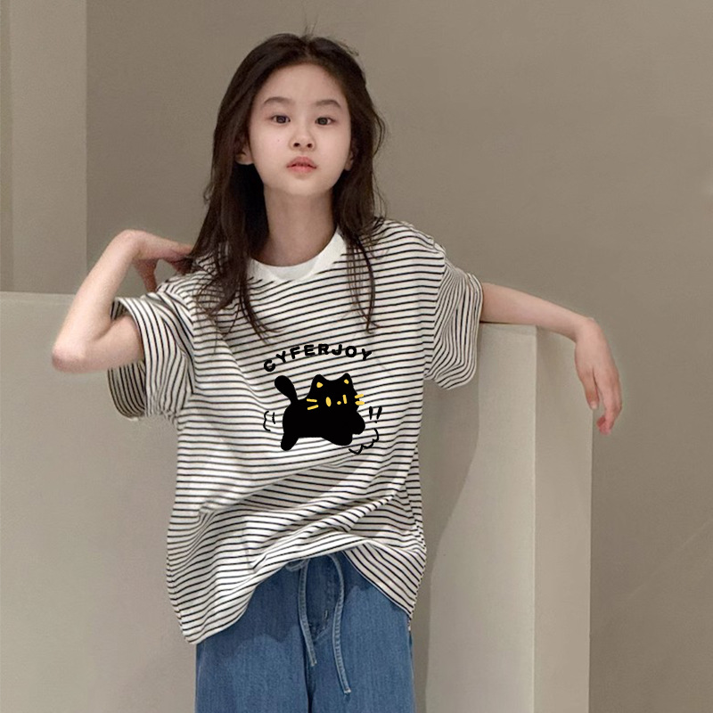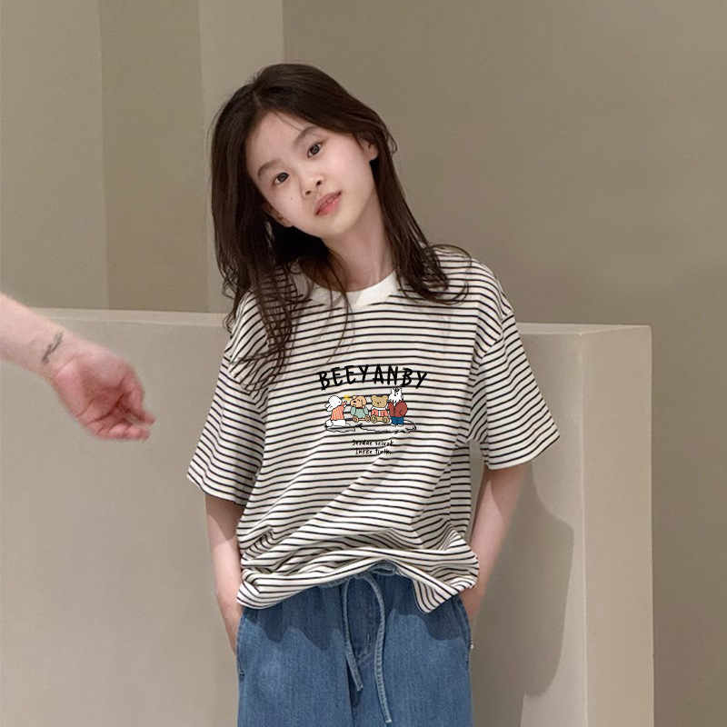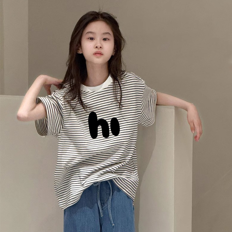 여아용 루즈하고 다재다능한 반팔 티셔츠, 여름 아동복, 중대형 아동용 순면 스트라이프 바닥 셔츠 상의