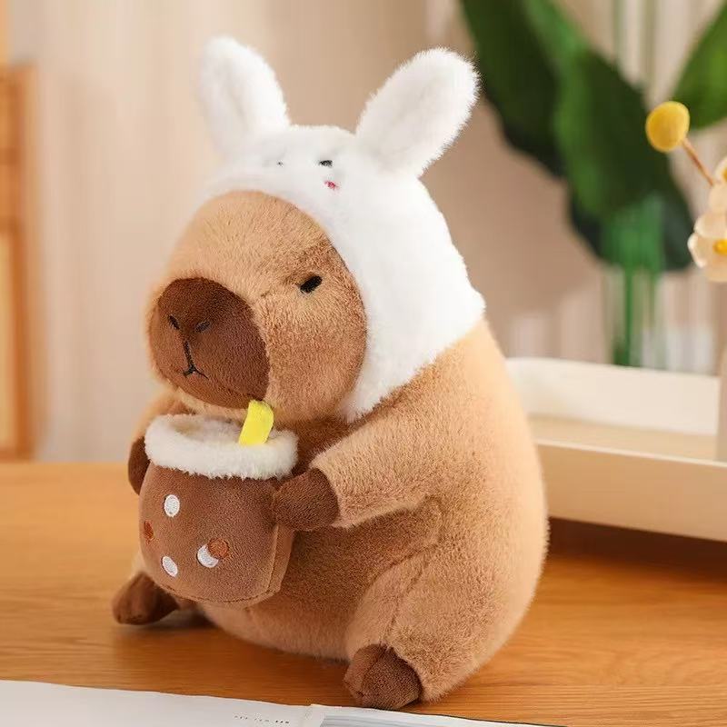 • 토끼 모자를 쓴 카피바라가 밀크티 컵을 들고 있어요.