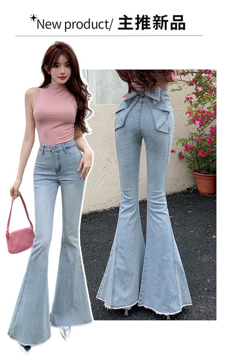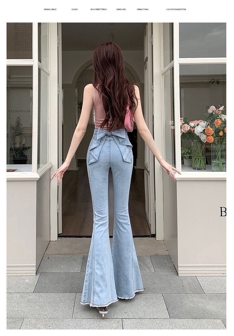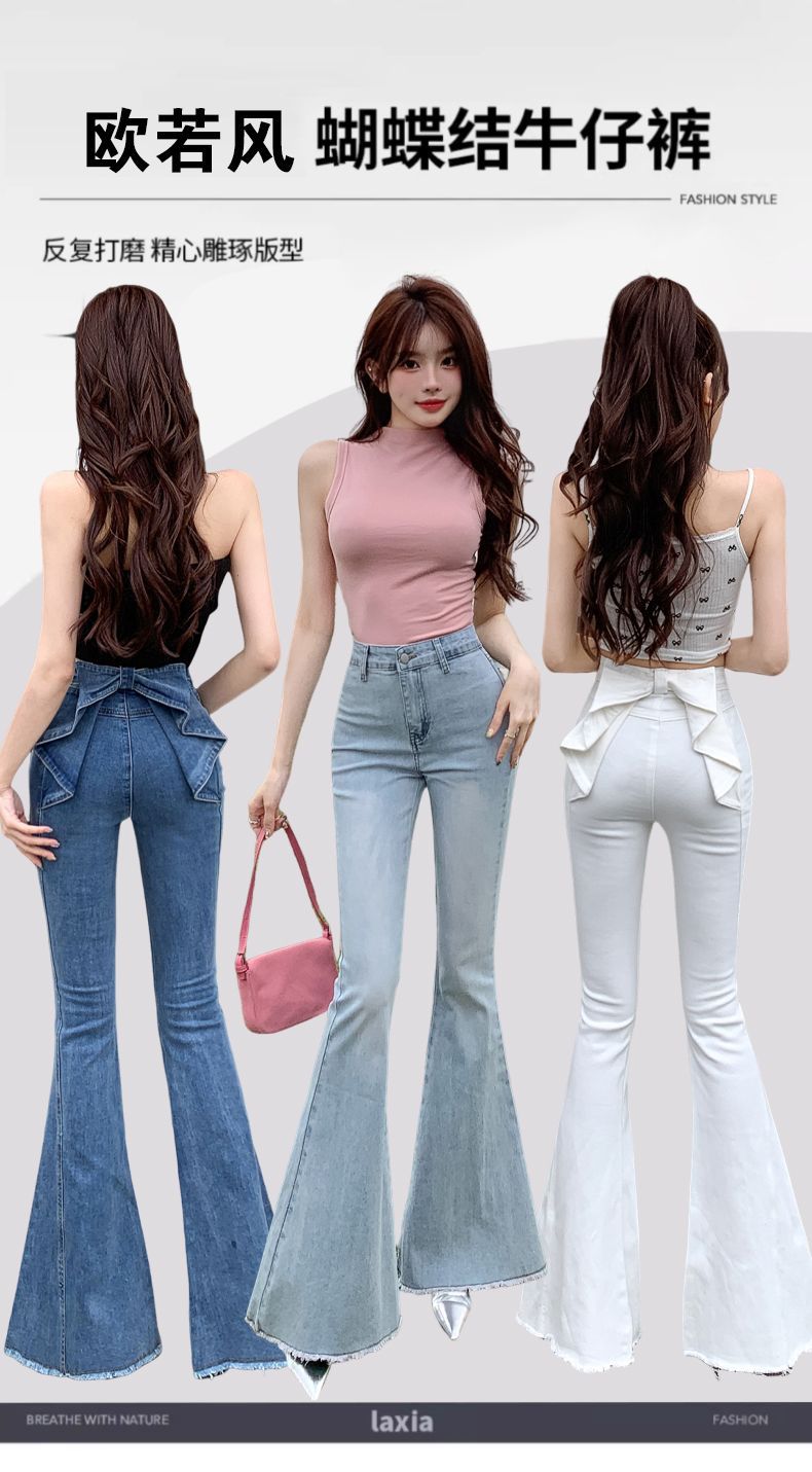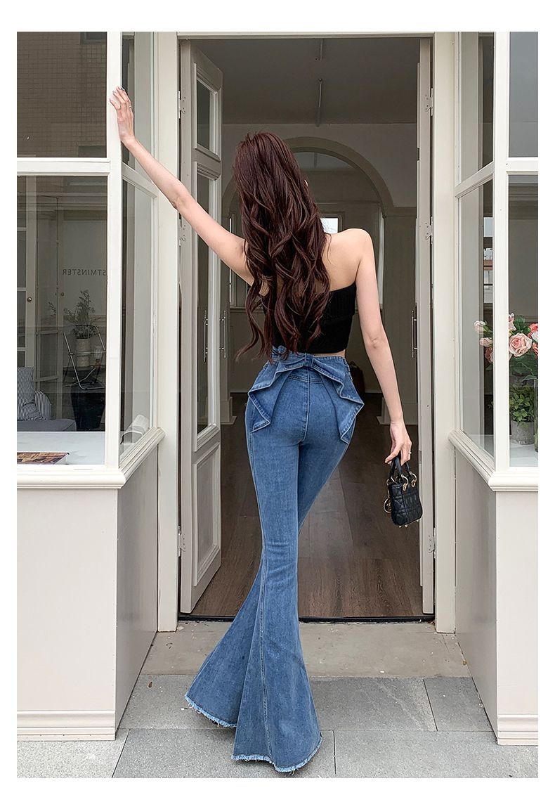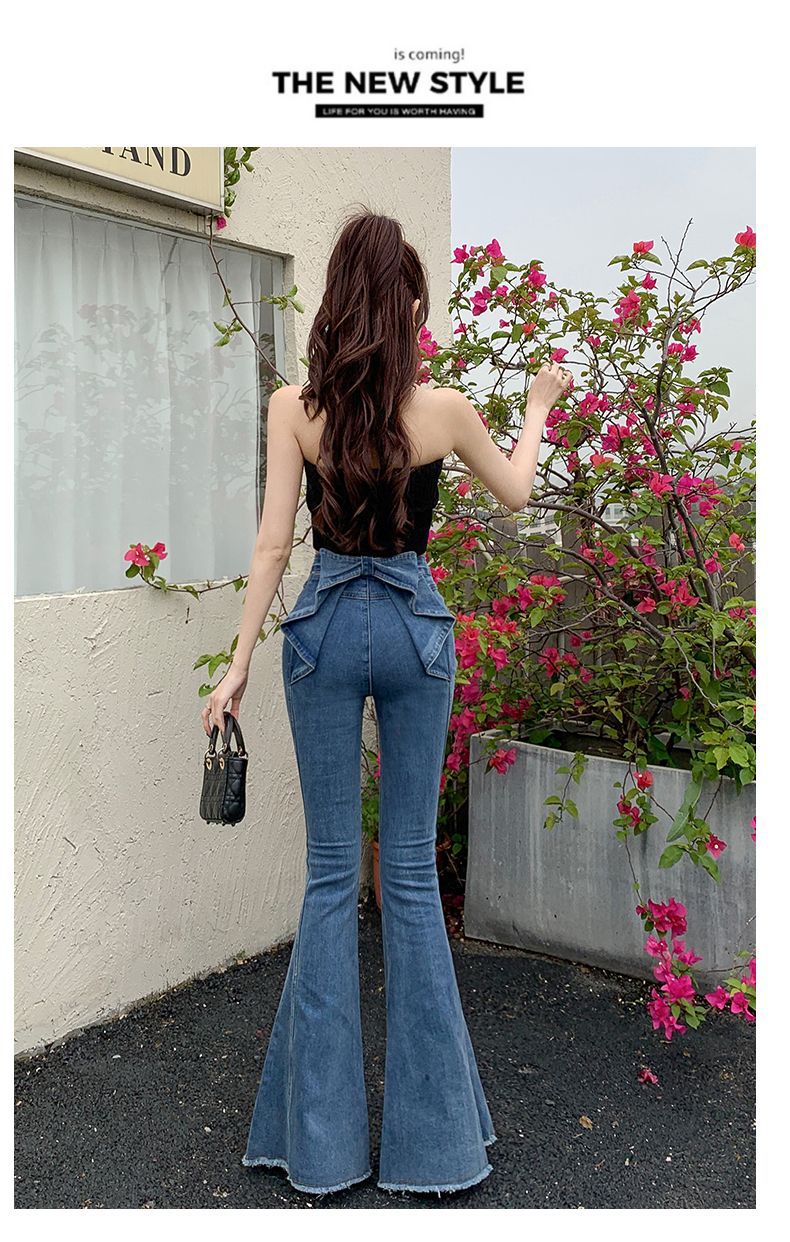 봄과 여름 2025 새로운 3 차원 활 청바지 여성 Ouruo 스타일 높은 허리 올 매치 슬림 핏 힙 트럼펫 바지스토어 가기