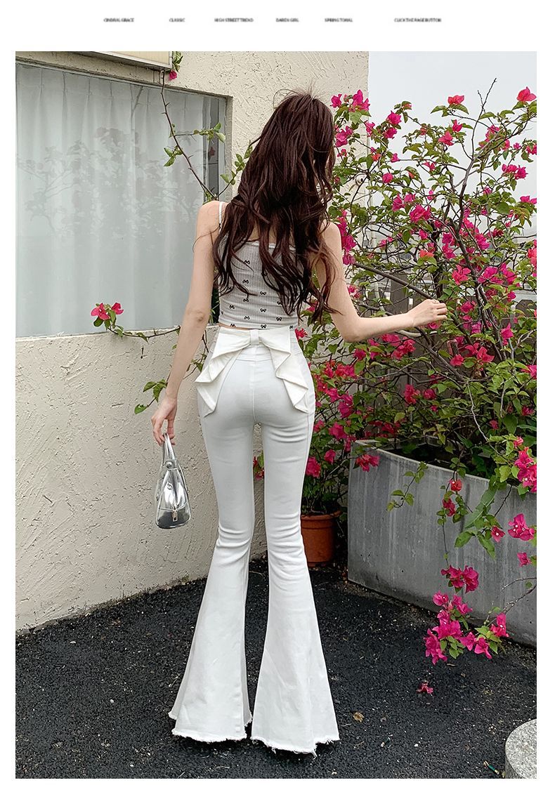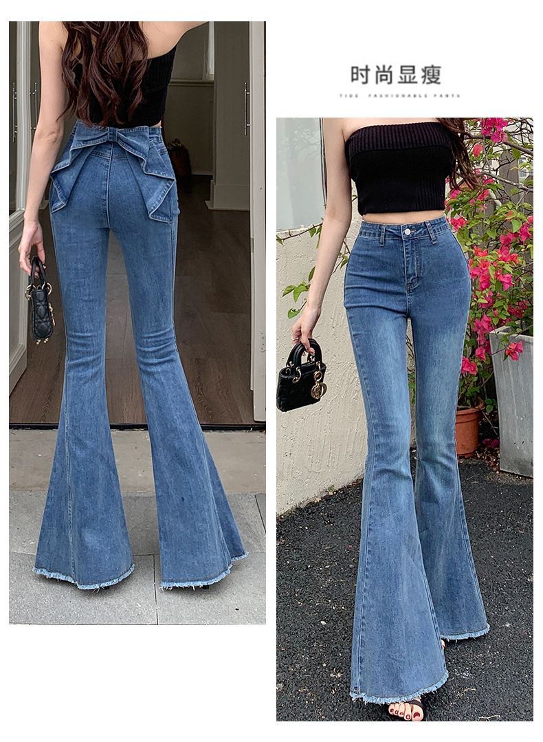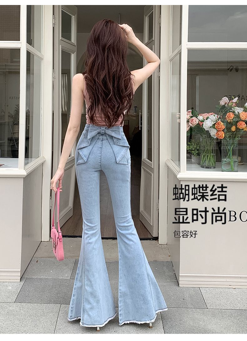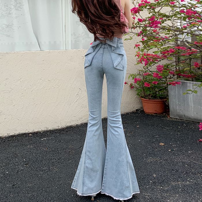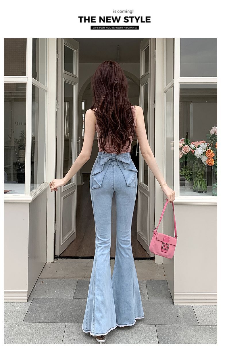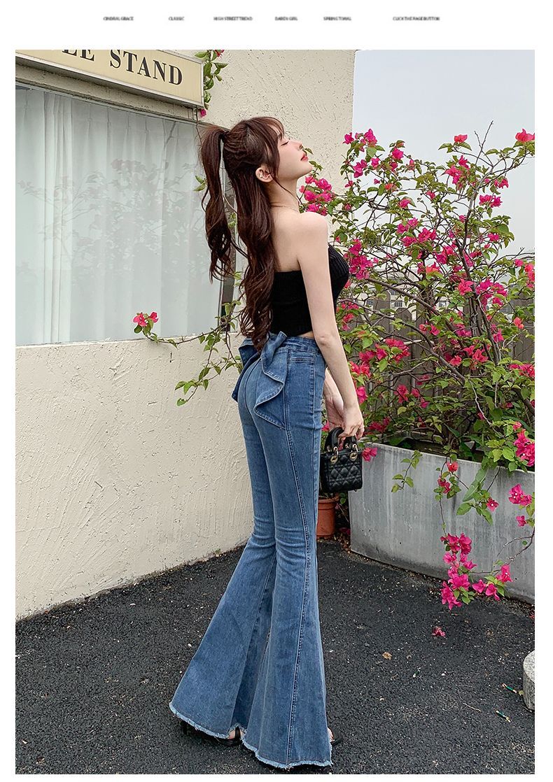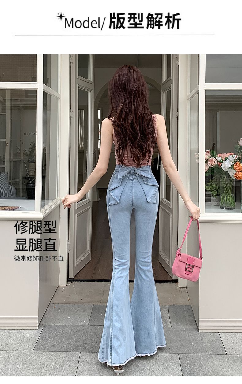 봄과 여름 2025 새로운 3 차원 활 청바지 여성 Ouruo 스타일 높은 허리 올 매치 슬림 핏 힙 트럼펫 바지스토어 가기