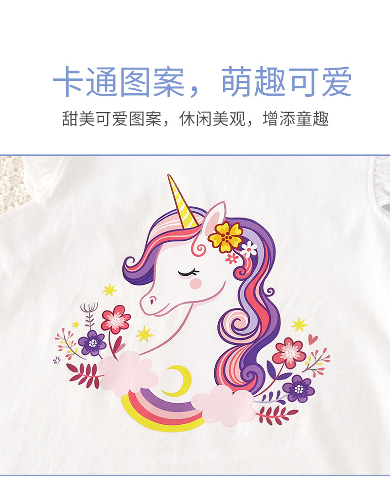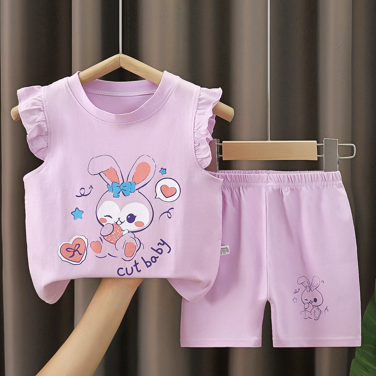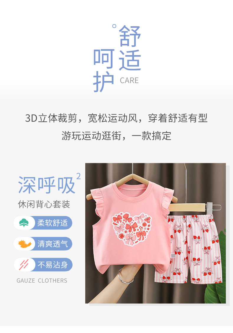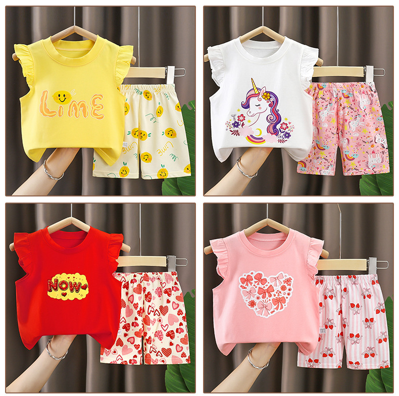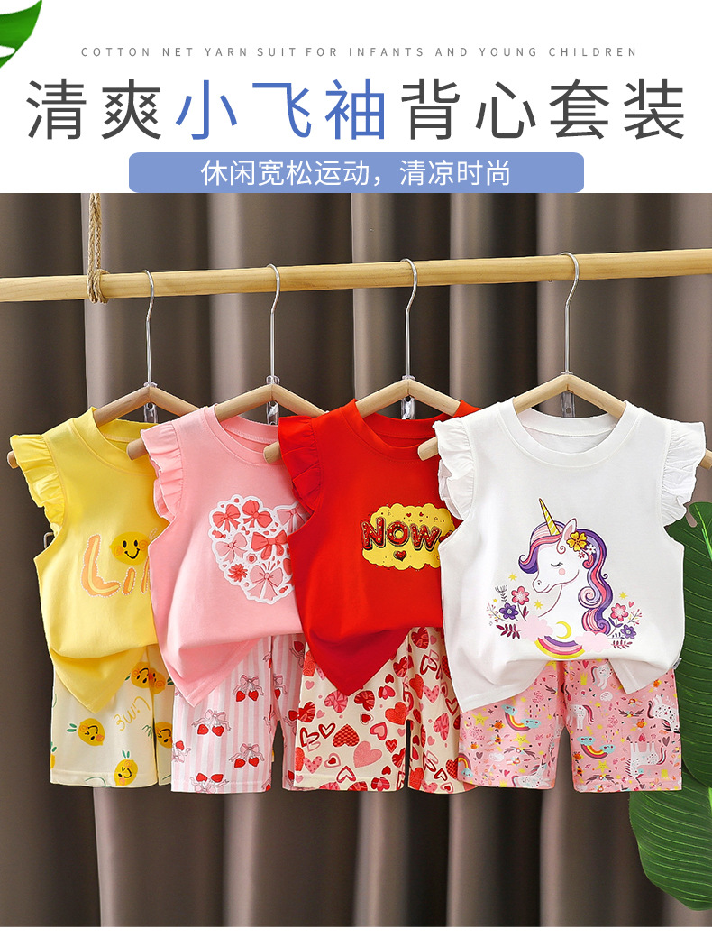 여자 반팔 세트 면 여름 새 소녀 비행 소매 반바지 투피스 세트 유럽과 미국 스타일 아기 여름 아동복스토어 가기