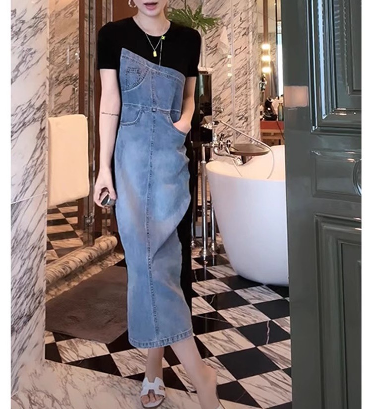 프랑스 스티칭 데님 원피스 여성 2025 년 여름 새로운 슬림 핏 슬림 핏 하이 엔드 타이트 웨이스트 스커트
