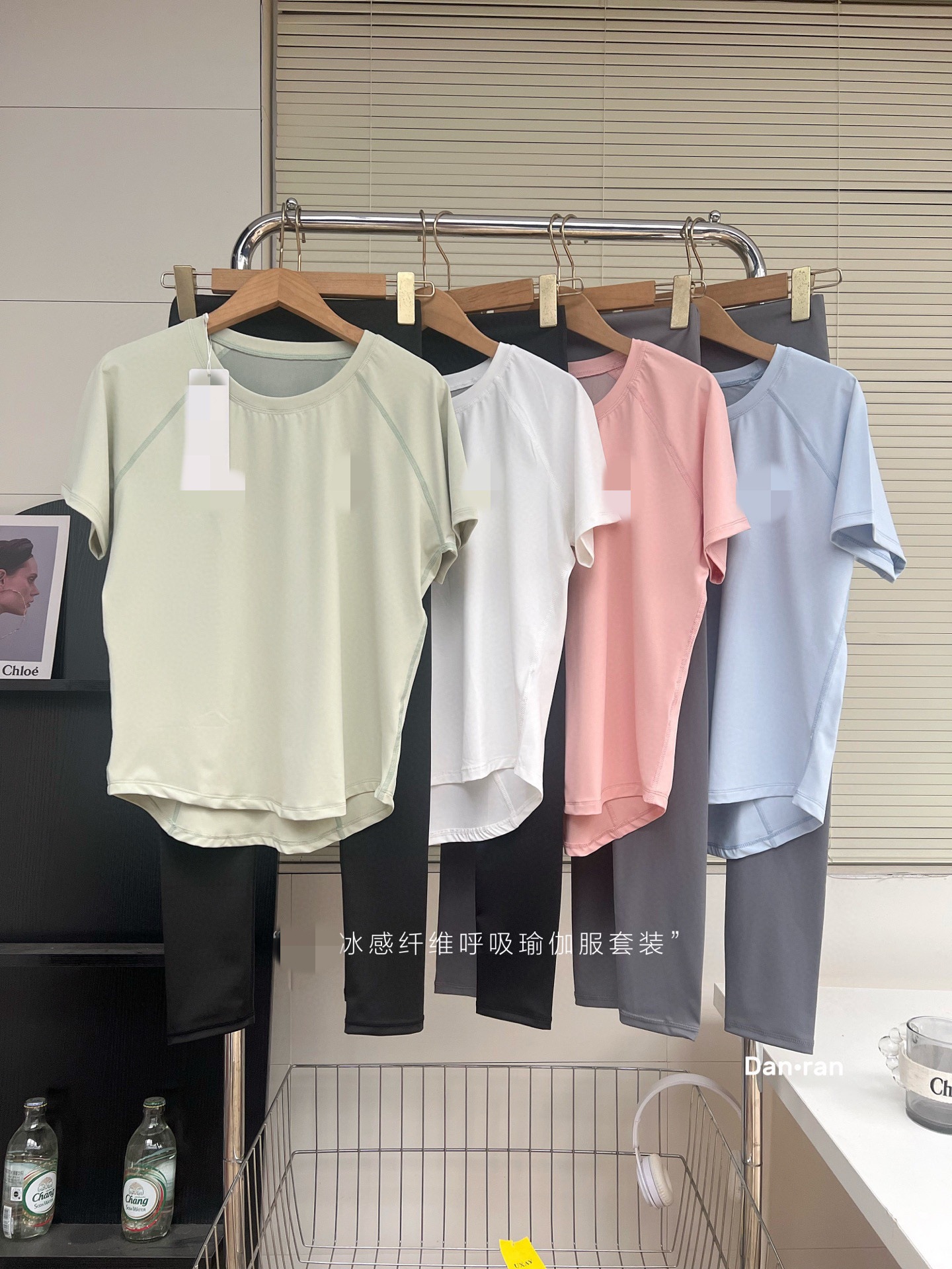 Lo 같은 스타일의 아이스 메쉬 요가 세트 여름 여성의 순수한 색 알몸 통기성 스포츠 피트니스 요가 의류 반팔스토어 가기