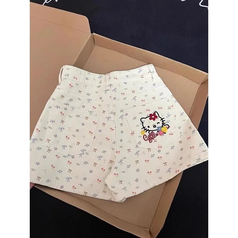 키티 고양이 자수 인쇄 데님 반바지 여성의 2025 여름 새로운 느슨한 캐주얼 스타일 스트레이트 반바지