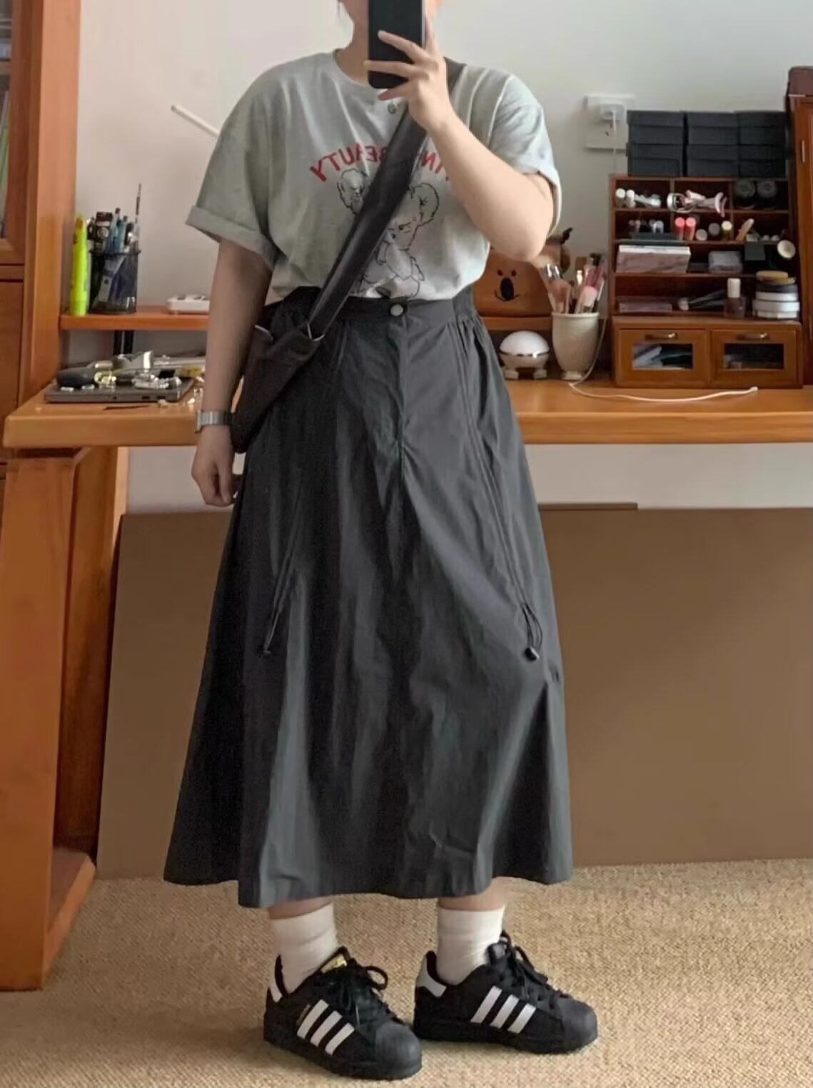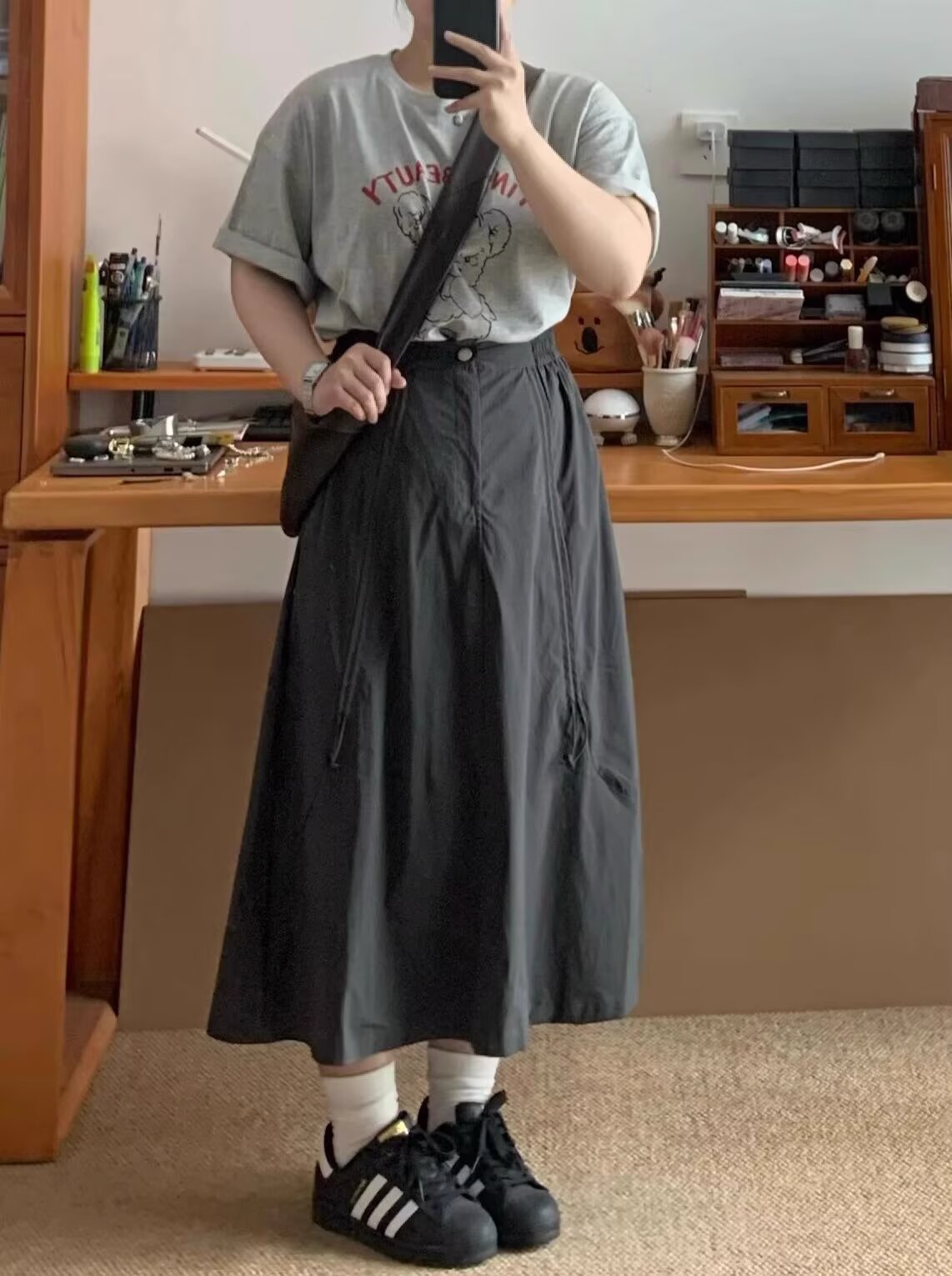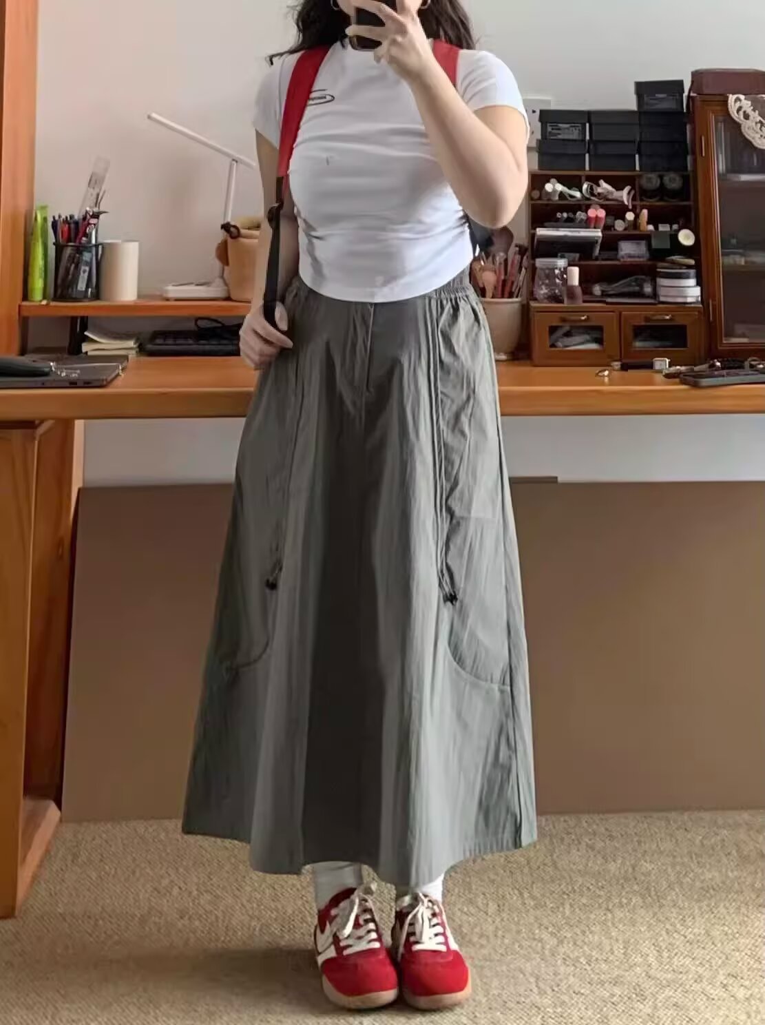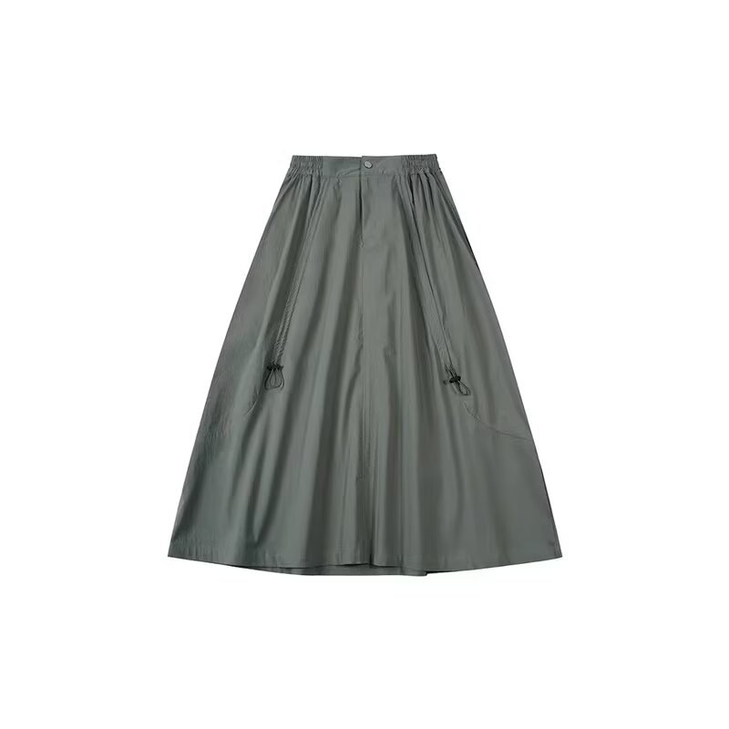 봄과 여름 아메리칸 그레이 그린 툴링 스커트 통통녀 플러스 사이즈 드로스트링 고관절 슬리밍 느슨한 허리 A-라인 대형 스커트