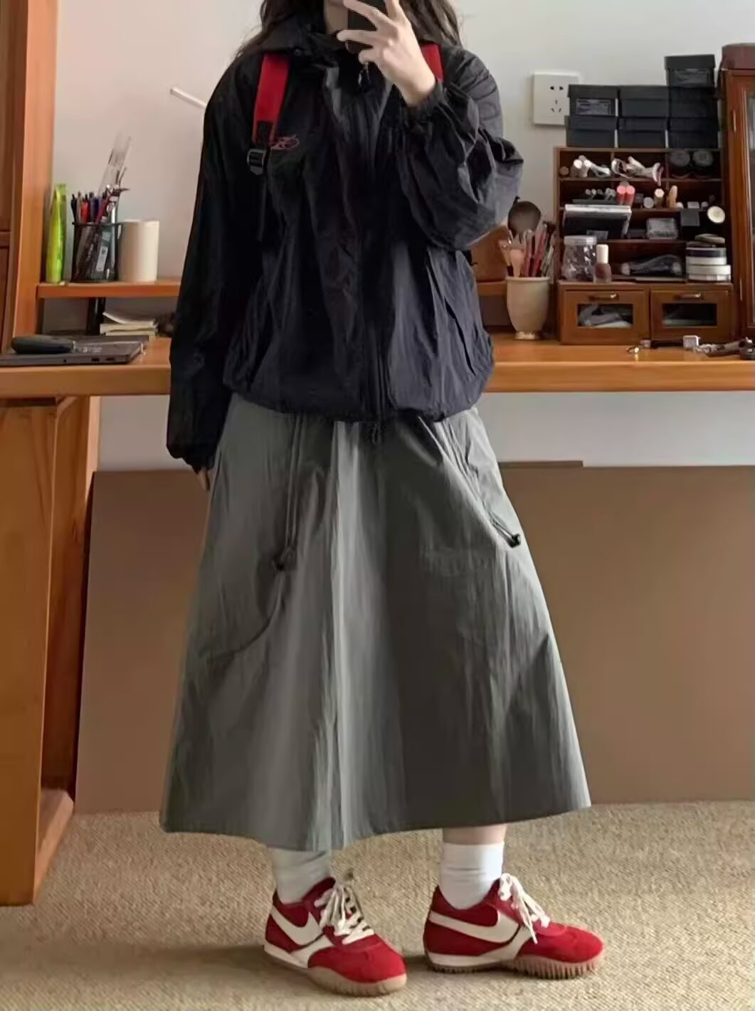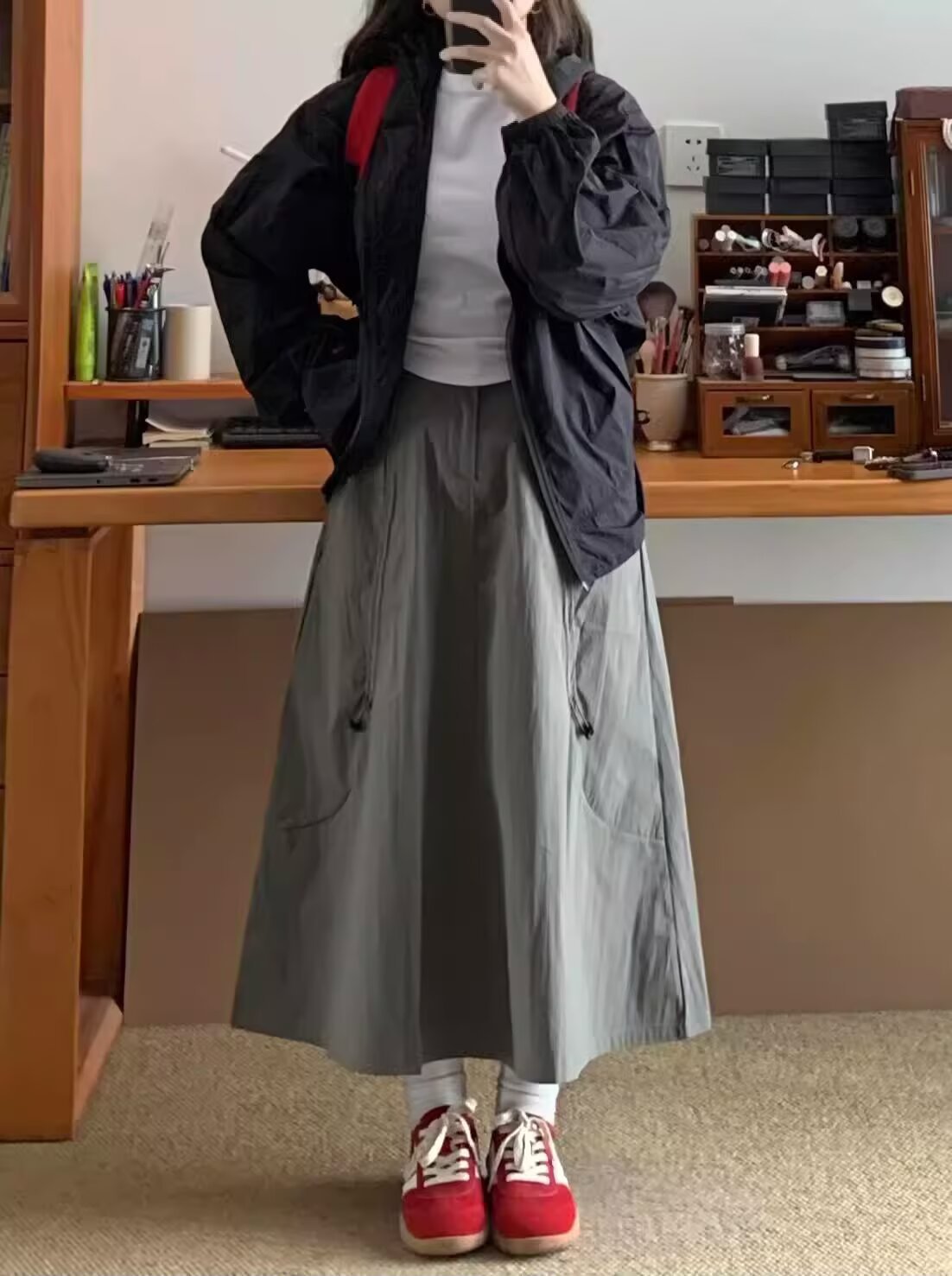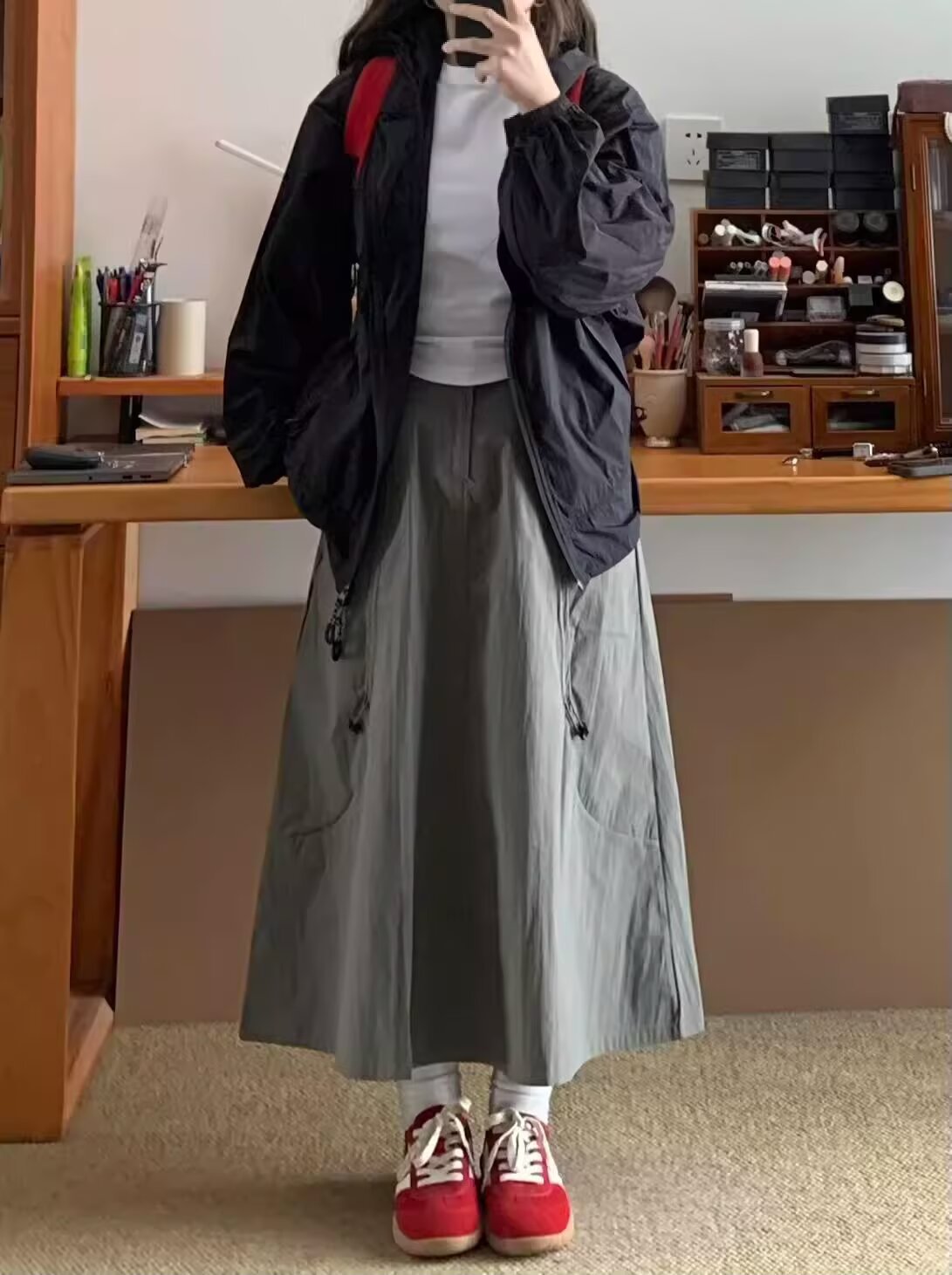 봄과 여름 아메리칸 그레이 그린 툴링 스커트 통통녀 플러스 사이즈 드로스트링 고관절 슬리밍 느슨한 허리 A-라인 대형 스커트