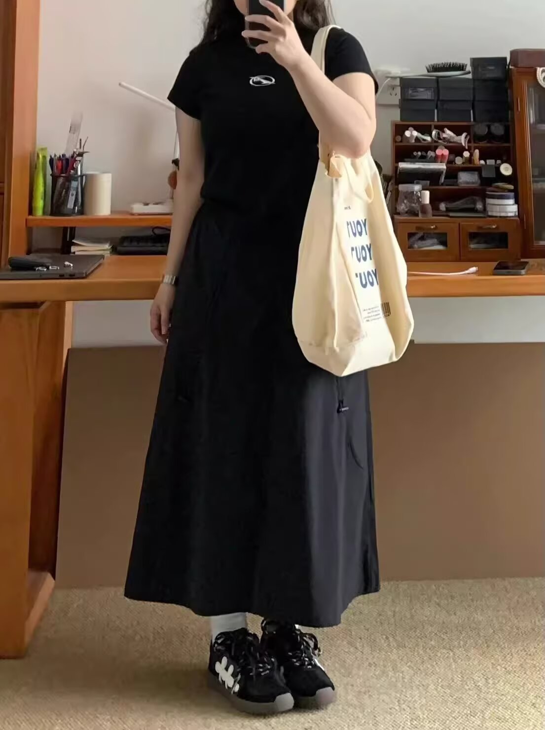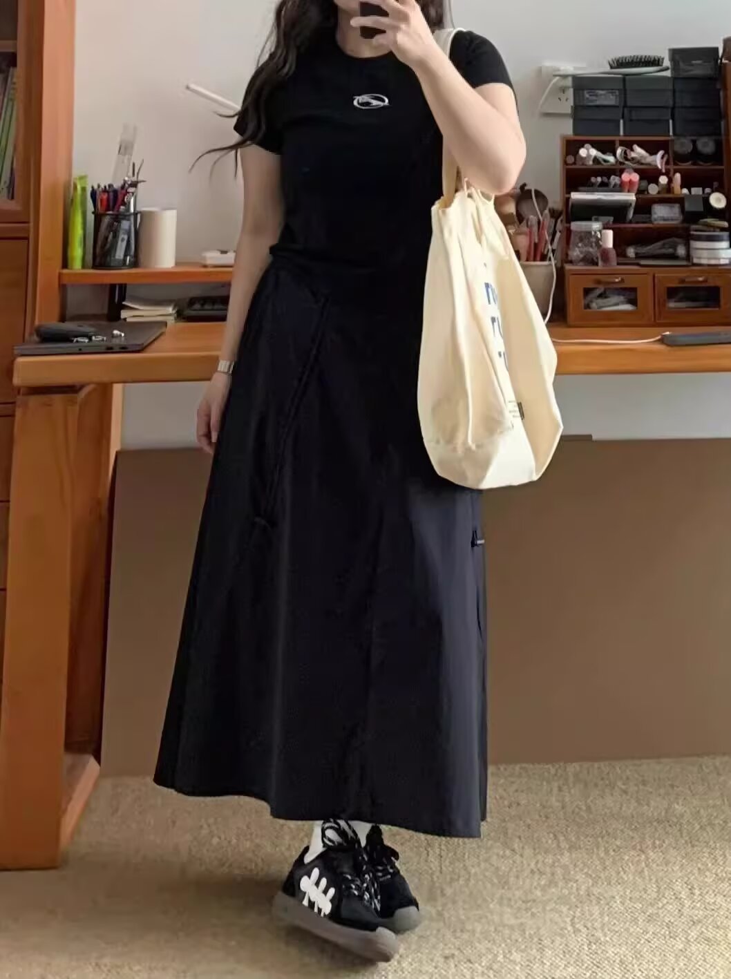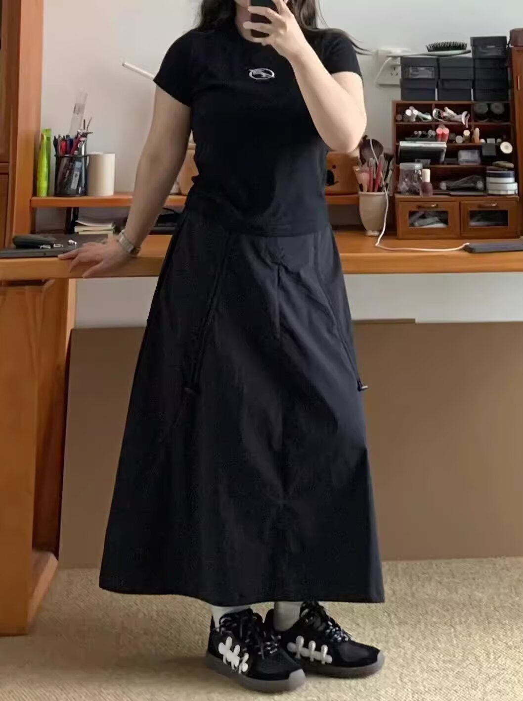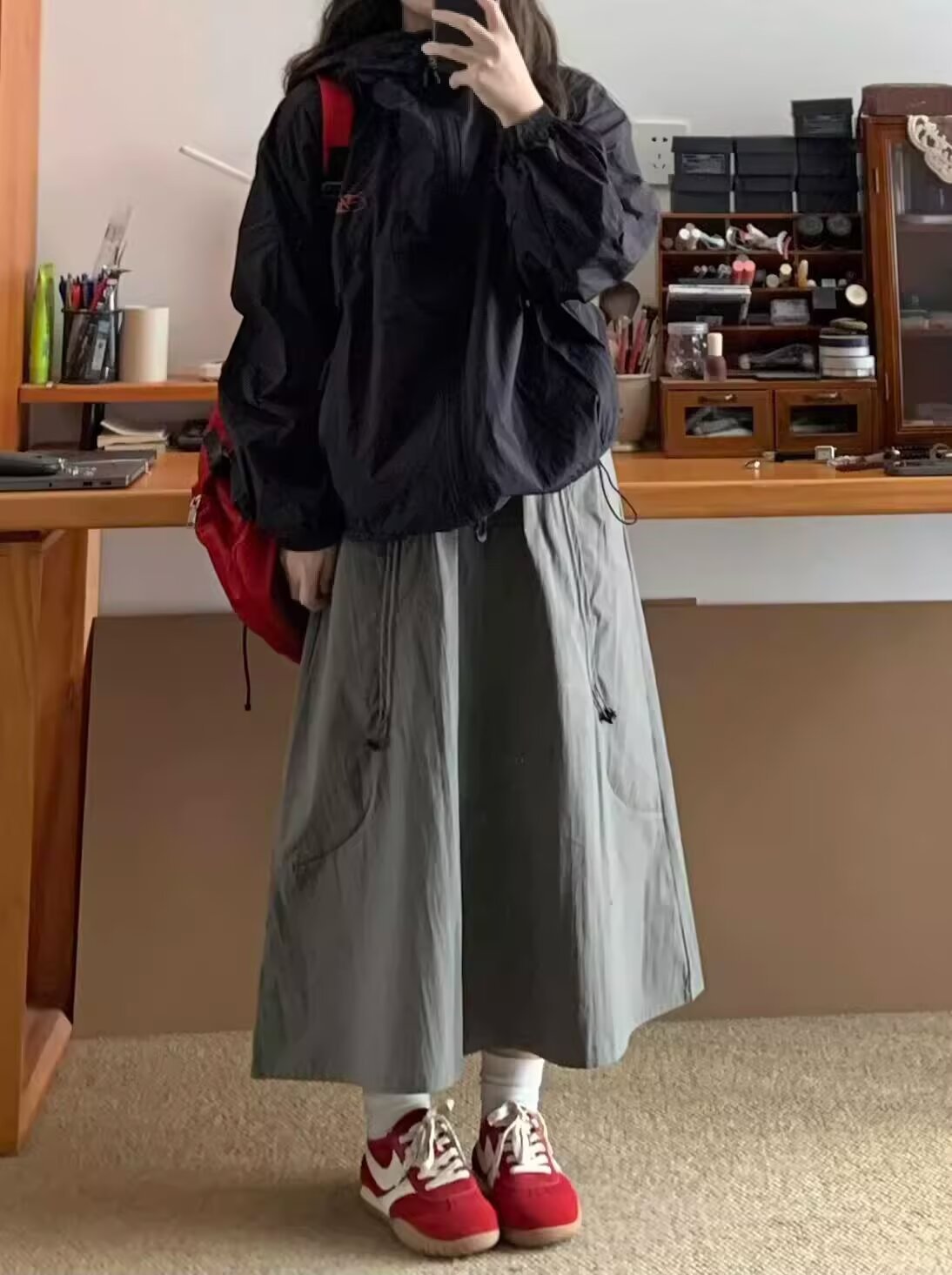 봄과 여름 아메리칸 그레이 그린 툴링 스커트 통통녀 플러스 사이즈 드로스트링 고관절 슬리밍 느슨한 허리 A-라인 대형 스커트