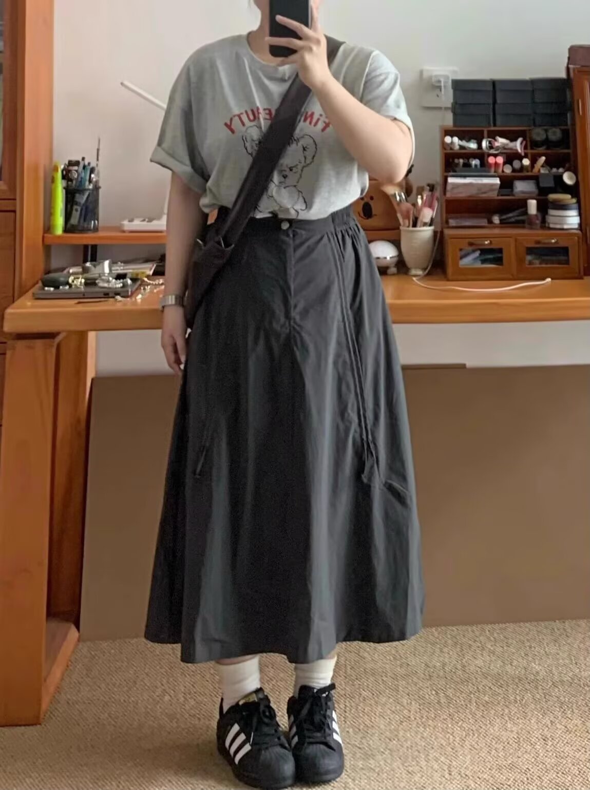 봄과 여름 아메리칸 그레이 그린 툴링 스커트 통통녀 플러스 사이즈 드로스트링 고관절 슬리밍 느슨한 허리 A-라인 대형 스커트스토어 가기