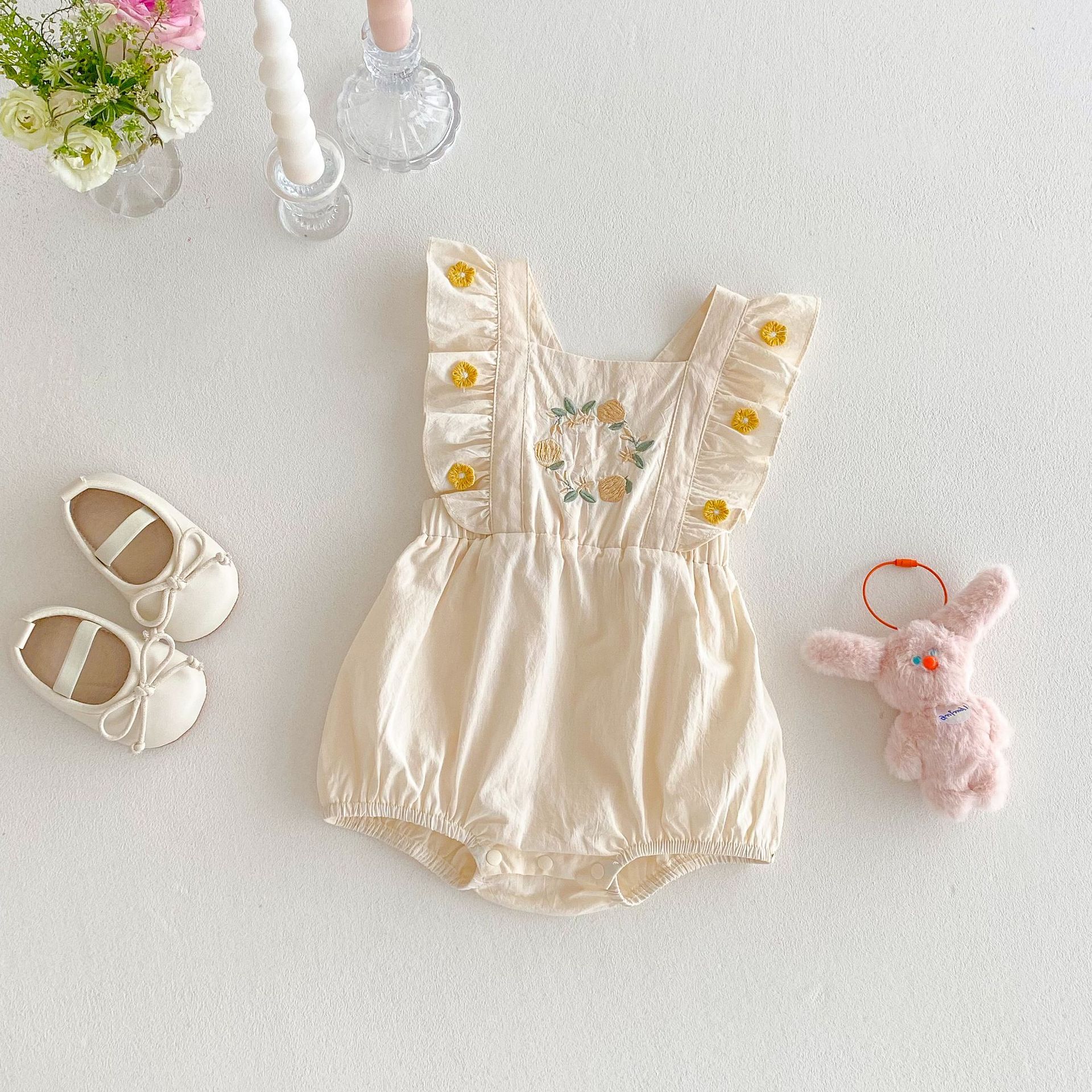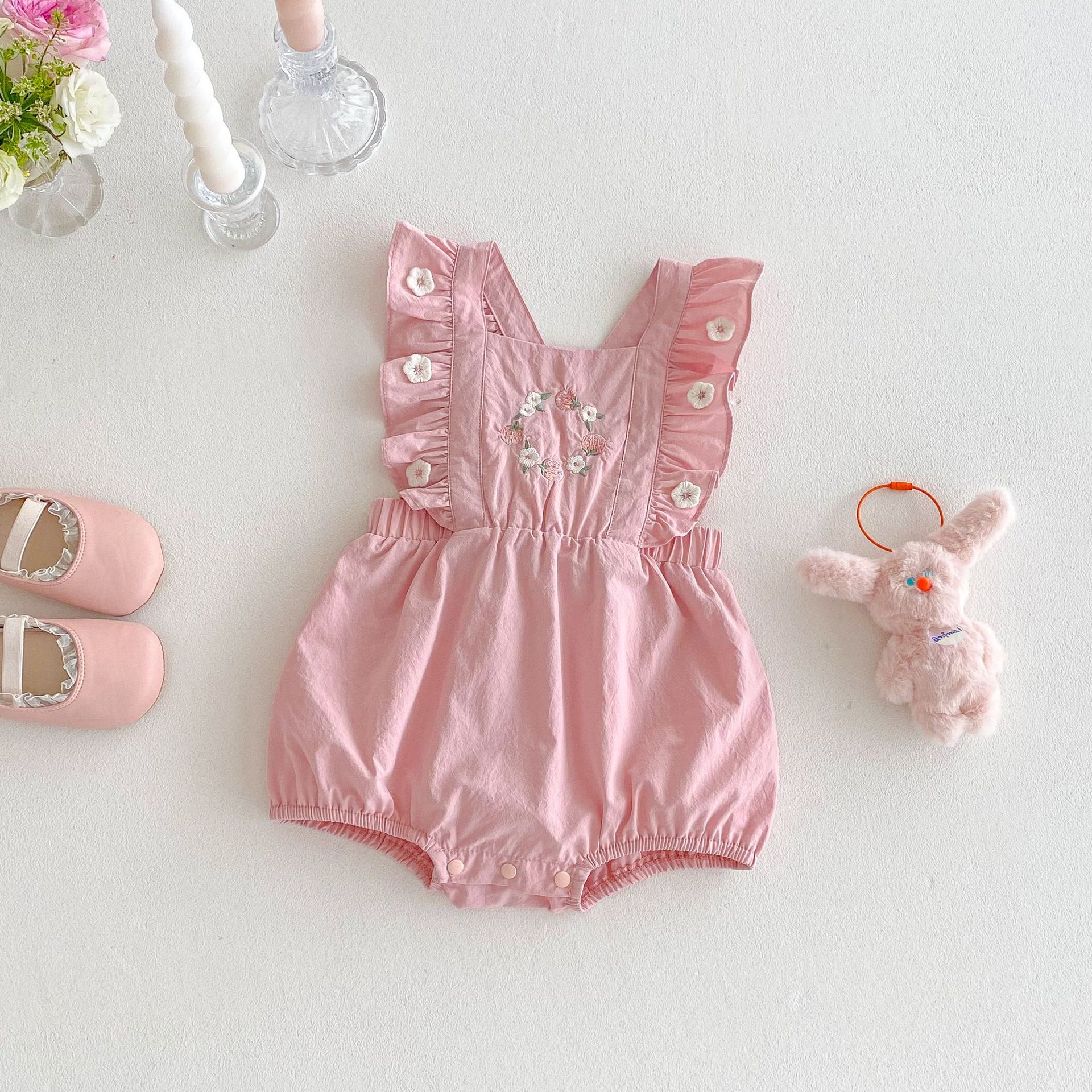 아기 자수 가방 방귀 옷 2025 새 여름 아기 한국 스타일 비행 소매 꽃 크롤링 옷 신생아 1 년 된 옷