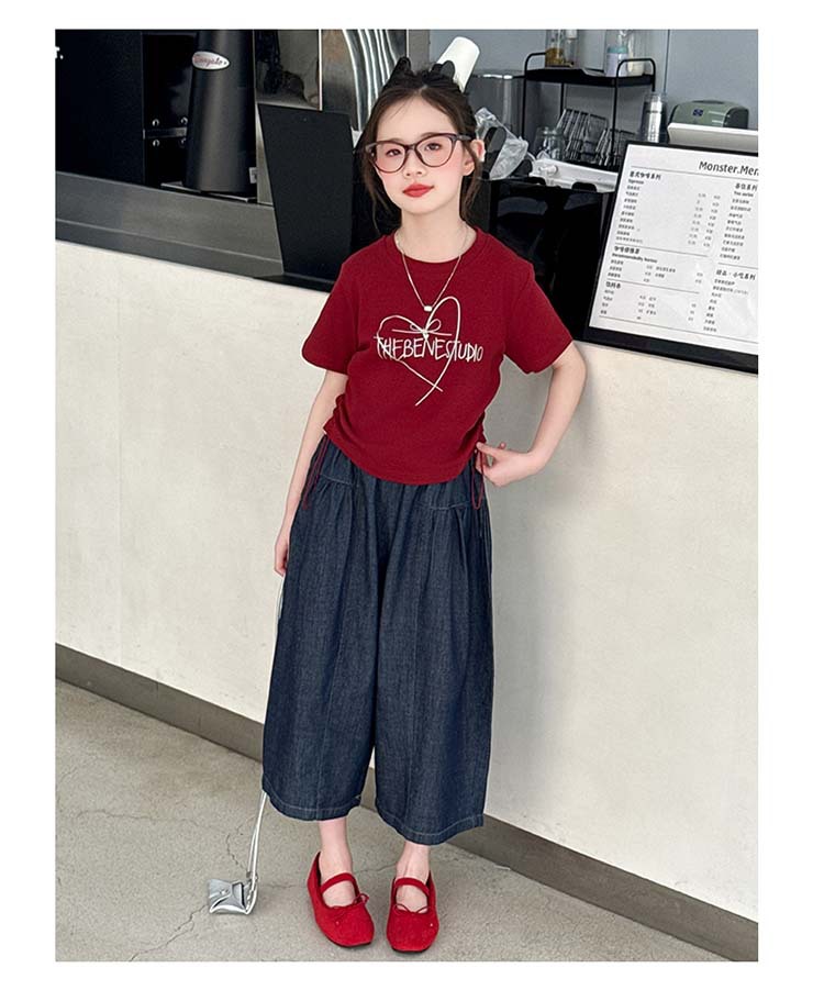 소녀의 세트 2025 새로운 여름 소녀의 세련된 드로우 스트링 짧은 사랑 티셔츠 청바지 투피스 세트