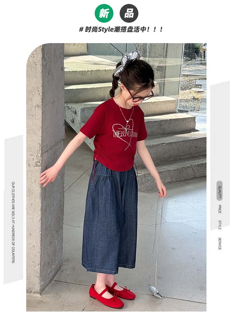 소녀의 세트 2025 새로운 여름 소녀의 세련된 드로우 스트링 짧은 사랑 티셔츠 청바지 투피스 세트스토어 가기
