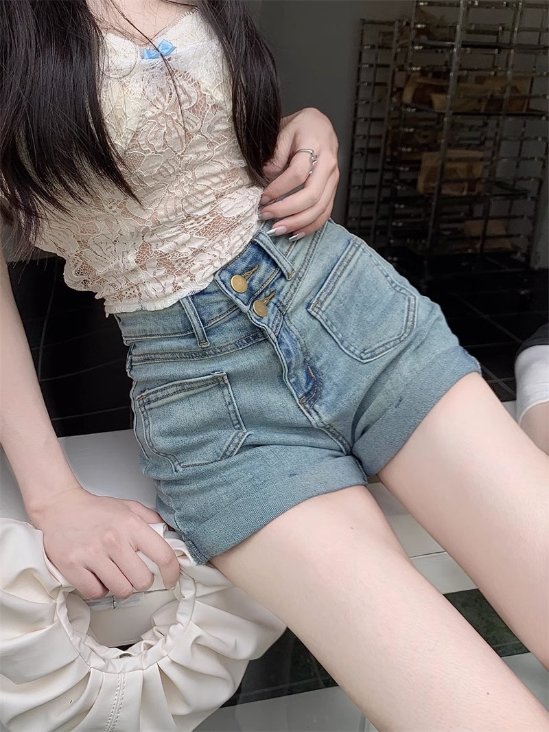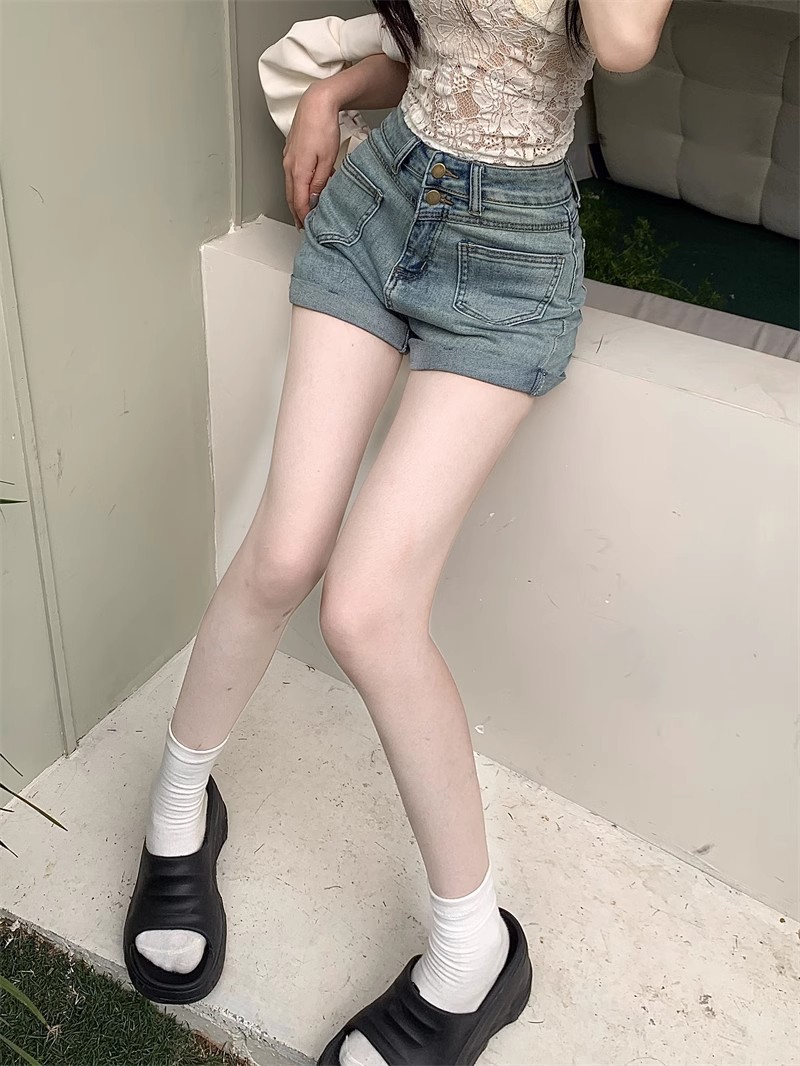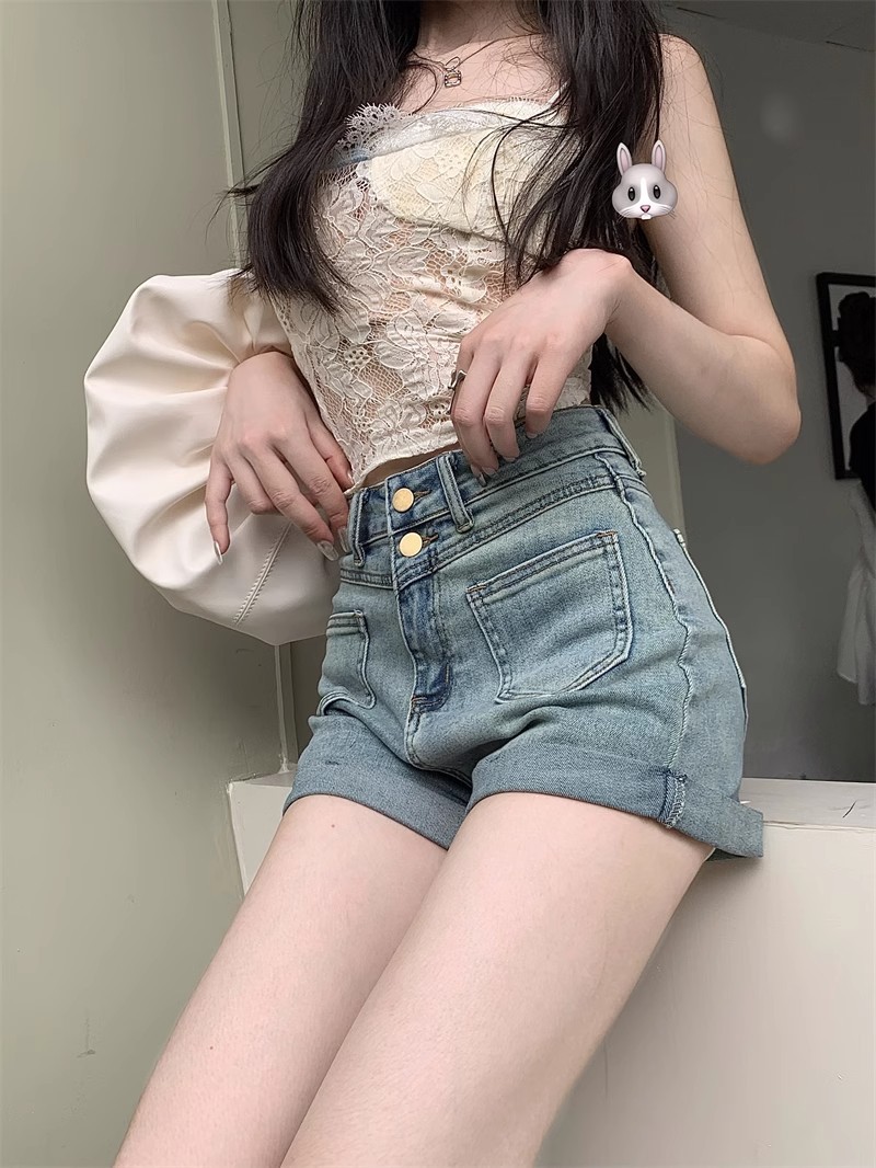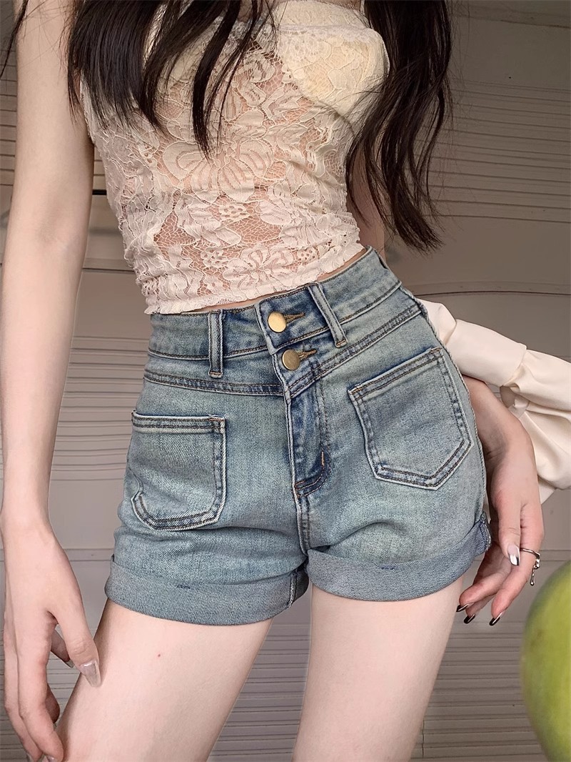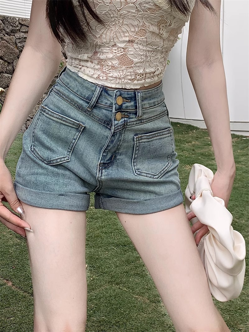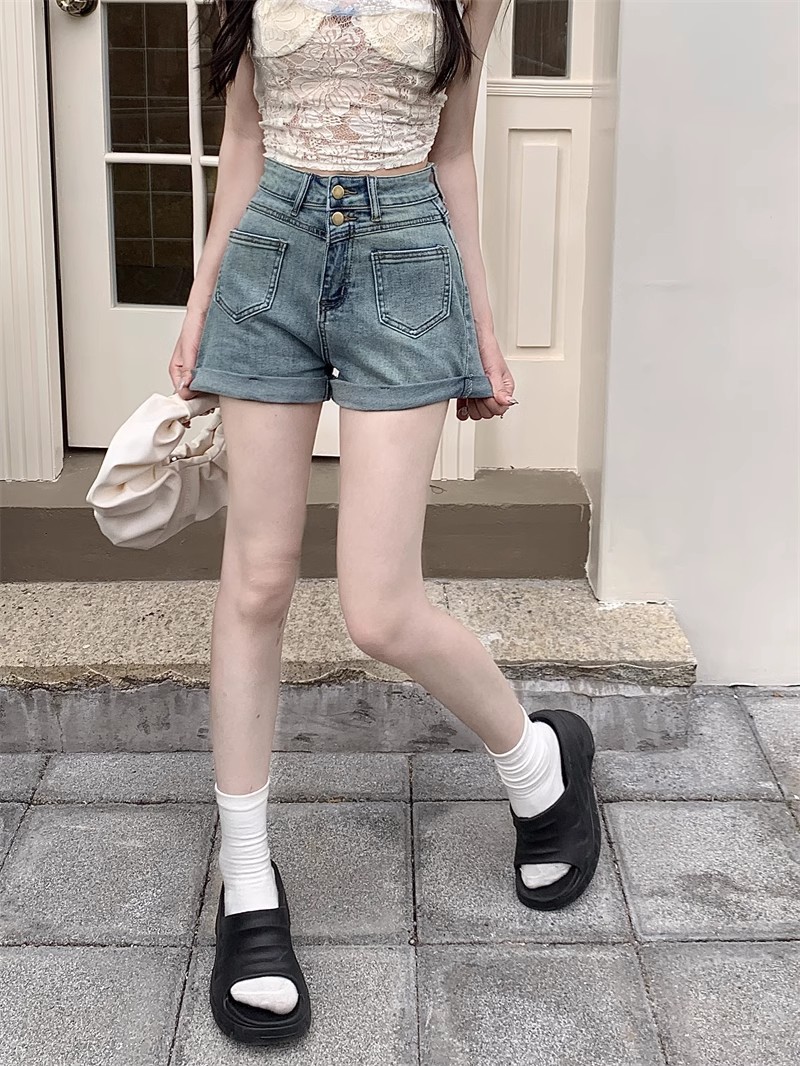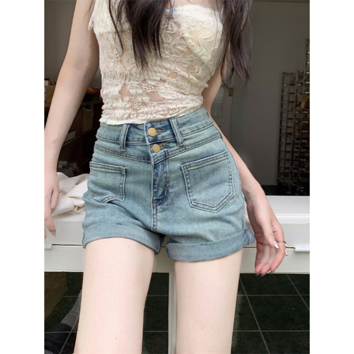 스트레치 더블 버클 청바지 여자 2024 년 여름 새로운 높은 허리 슬리밍 스트레이트 레그 팬츠 컬링 핫 팬츠 올 매치 반바지